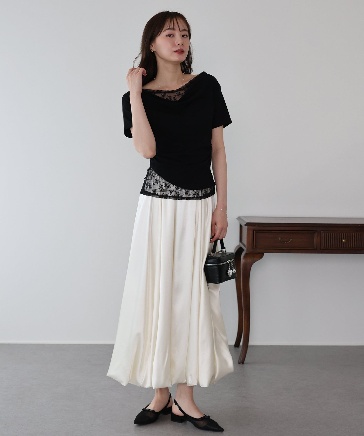 サイドギャザー×裾レースデザインなので、タックアウトでの着こなしがおすすめ。