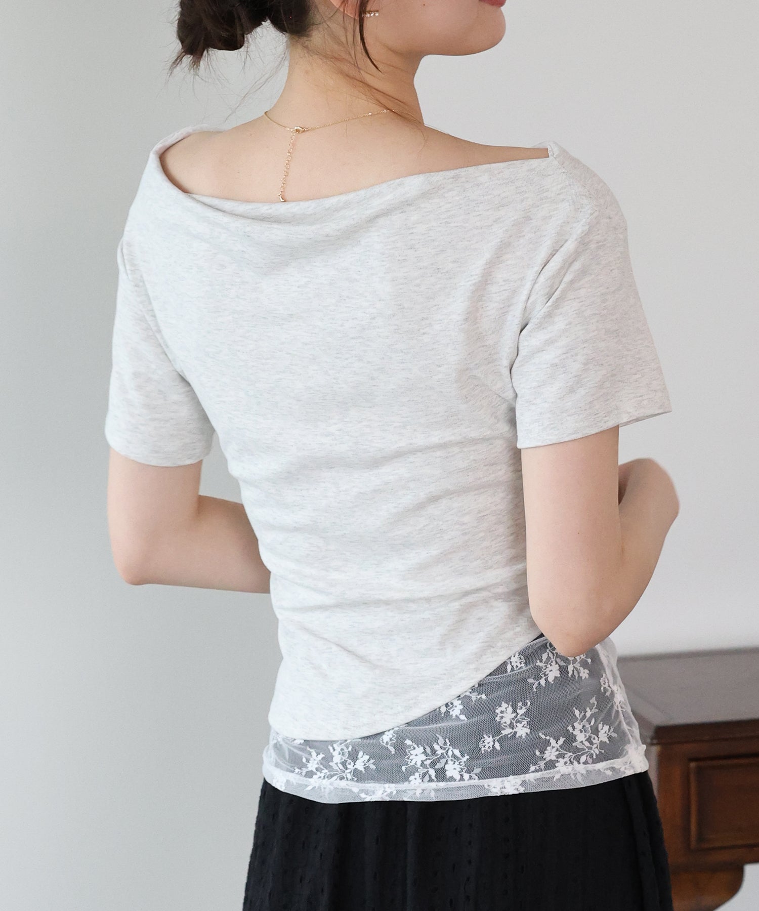 優雅な曲線を描くドレープネックと、繊細なレースを組み合わせた、一枚でクラスアップが叶うデザインカットソー。
