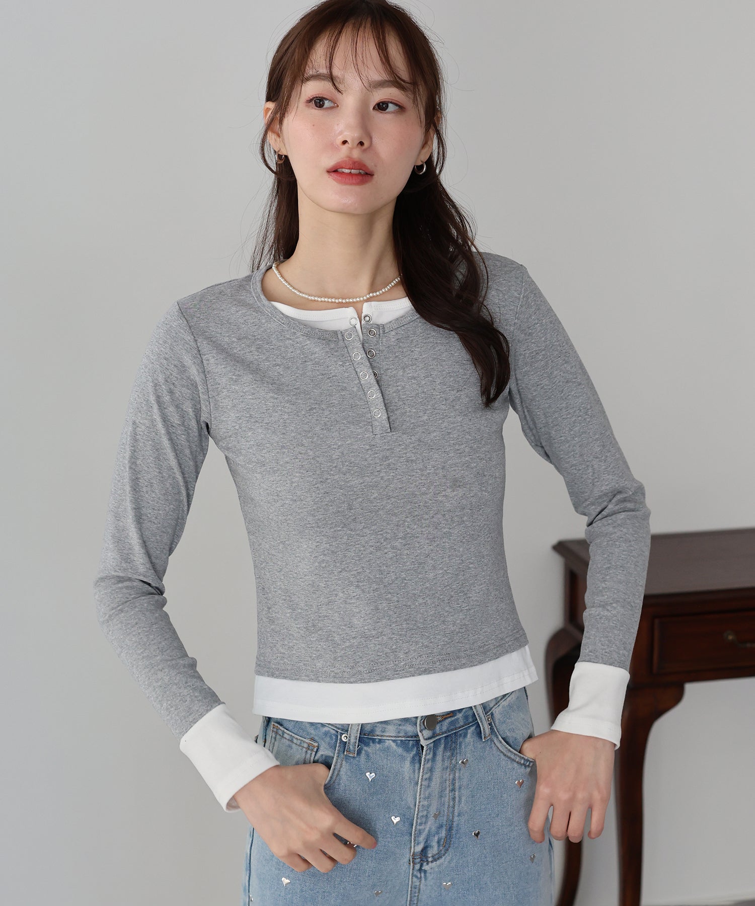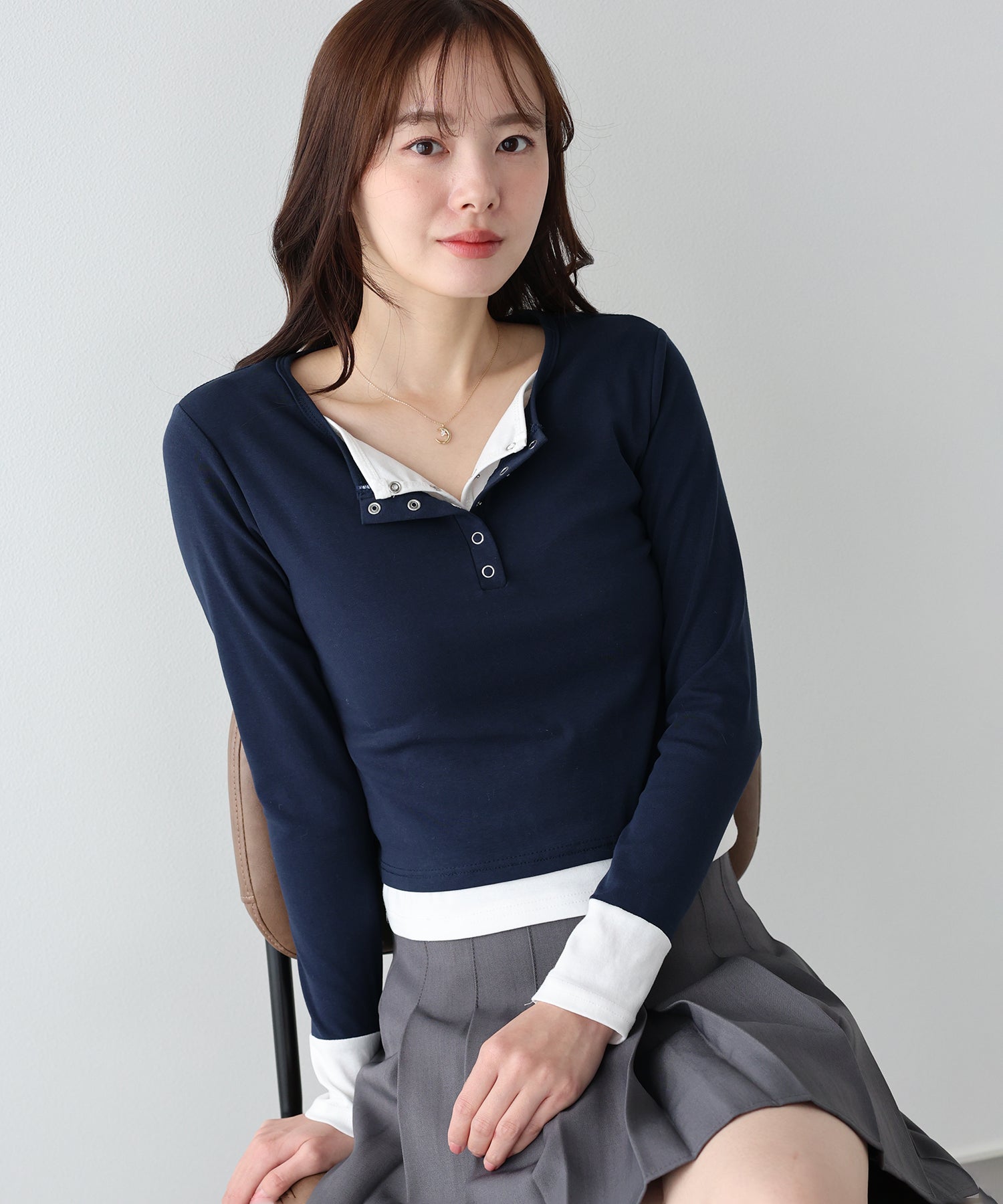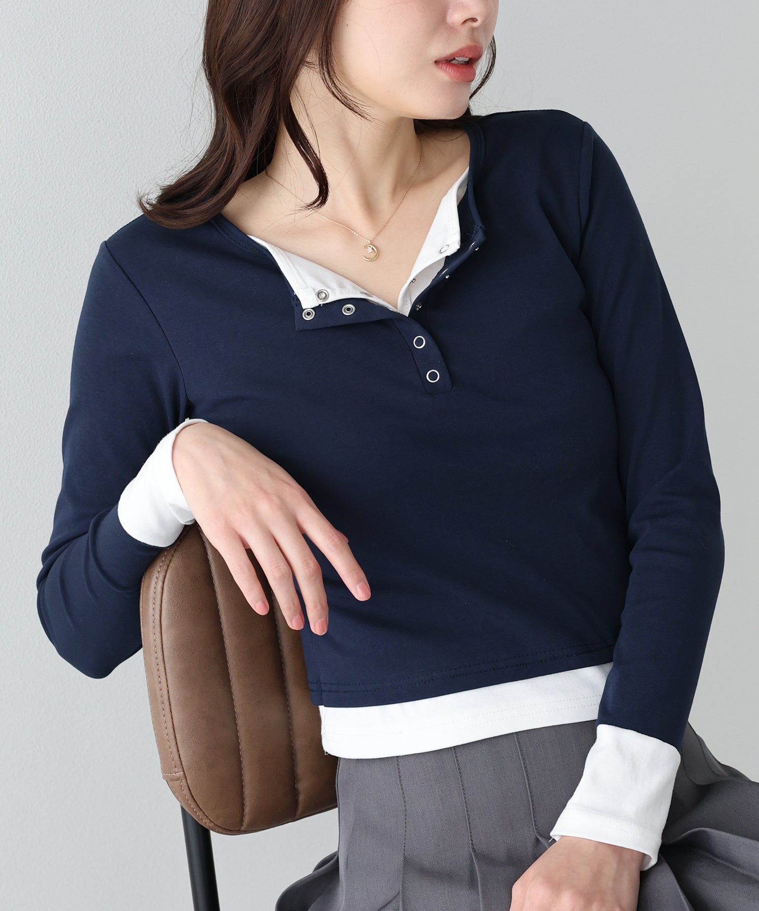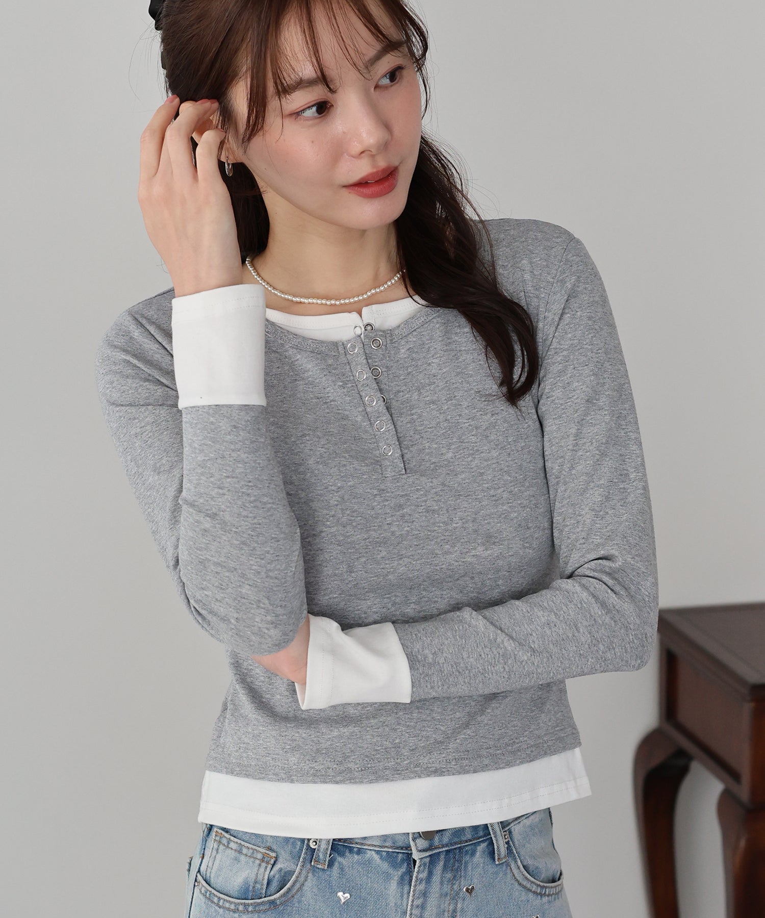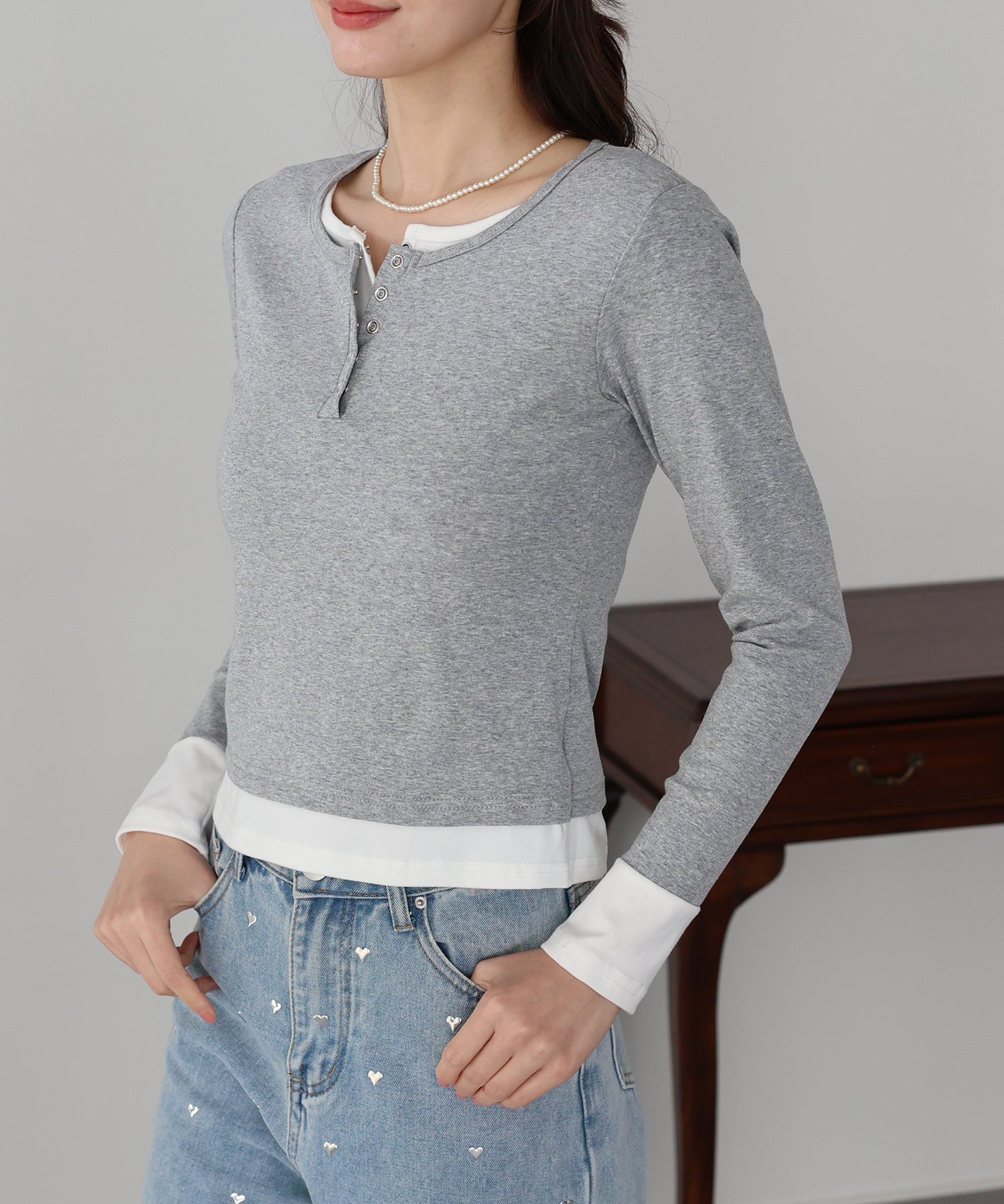 女性らしさと程よいカジュアル感を両立した、レイヤードデザインのヘンリーネックTシャツ
