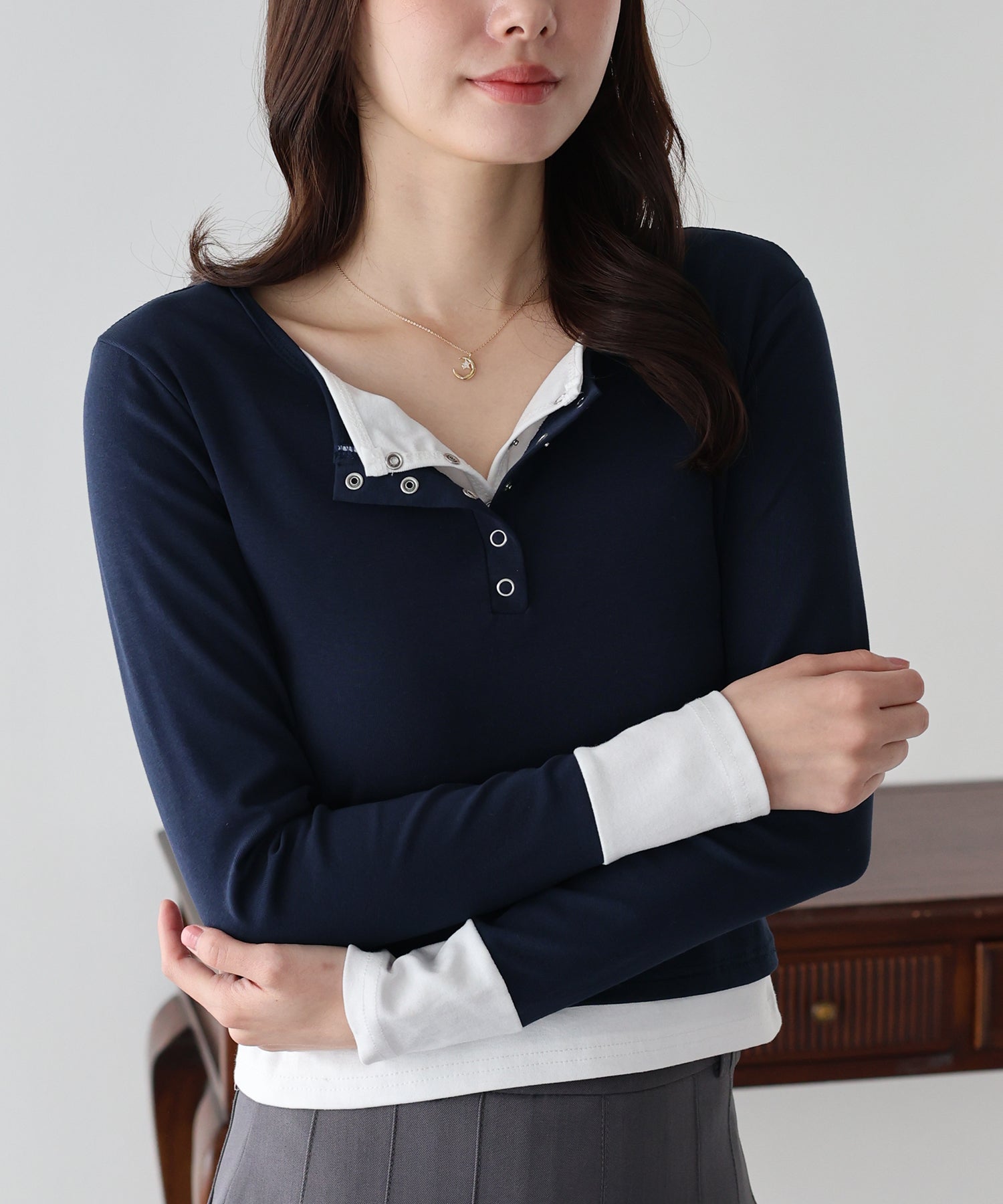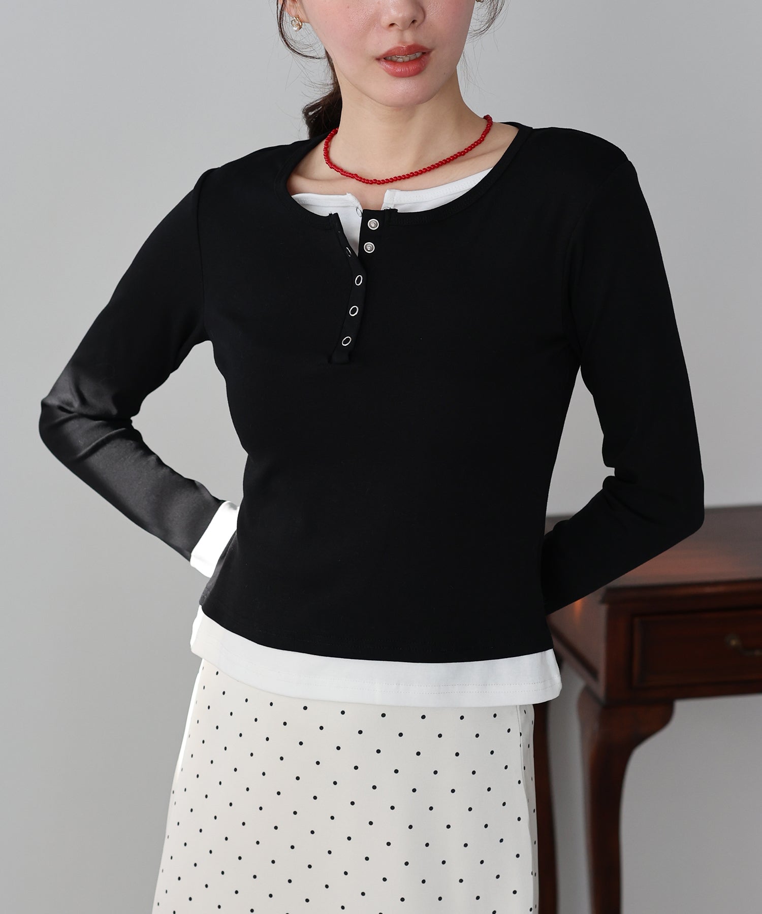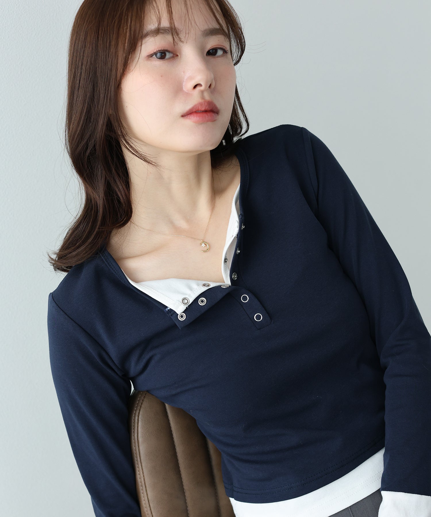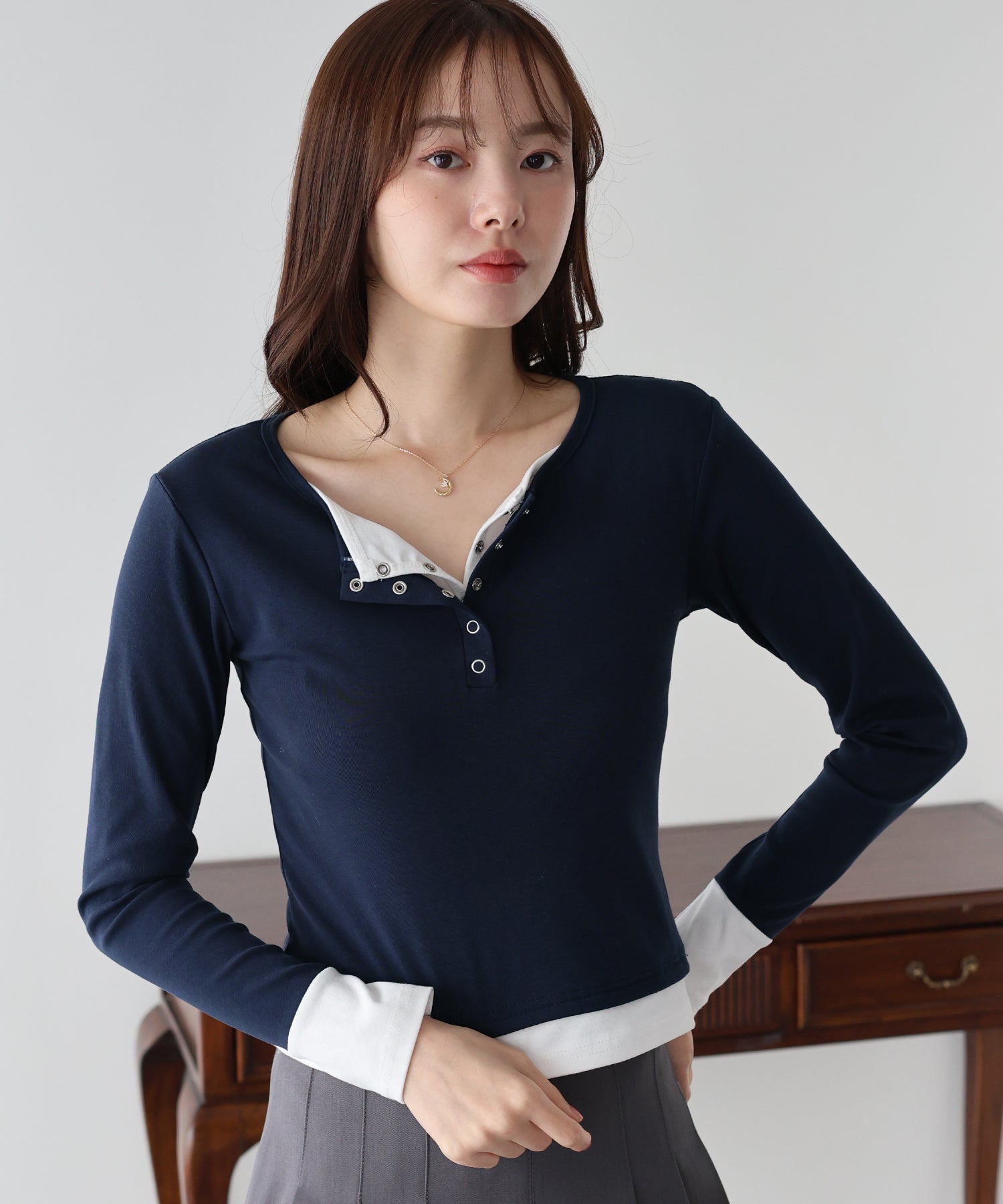 女性らしさと程よいカジュアル感を両立した、レイヤードデザインのヘンリーネックTシャツ