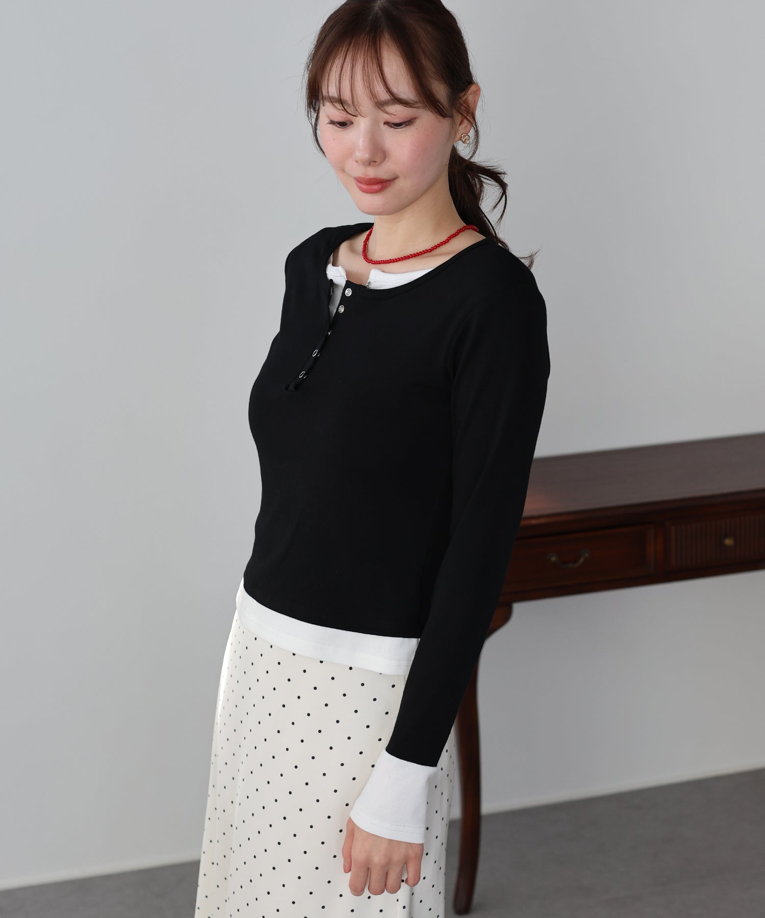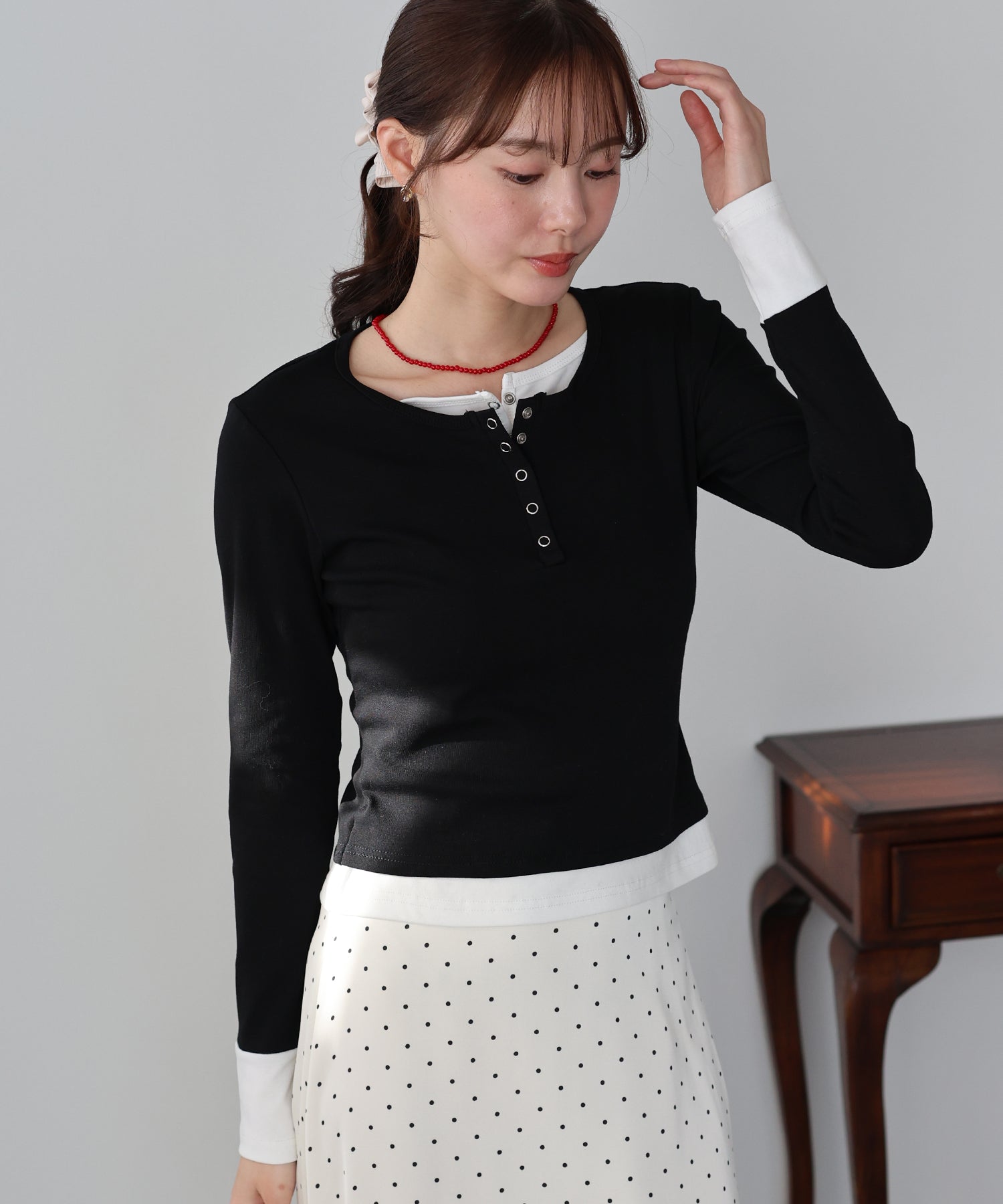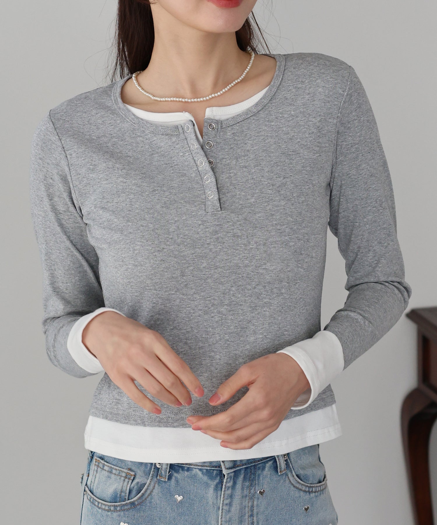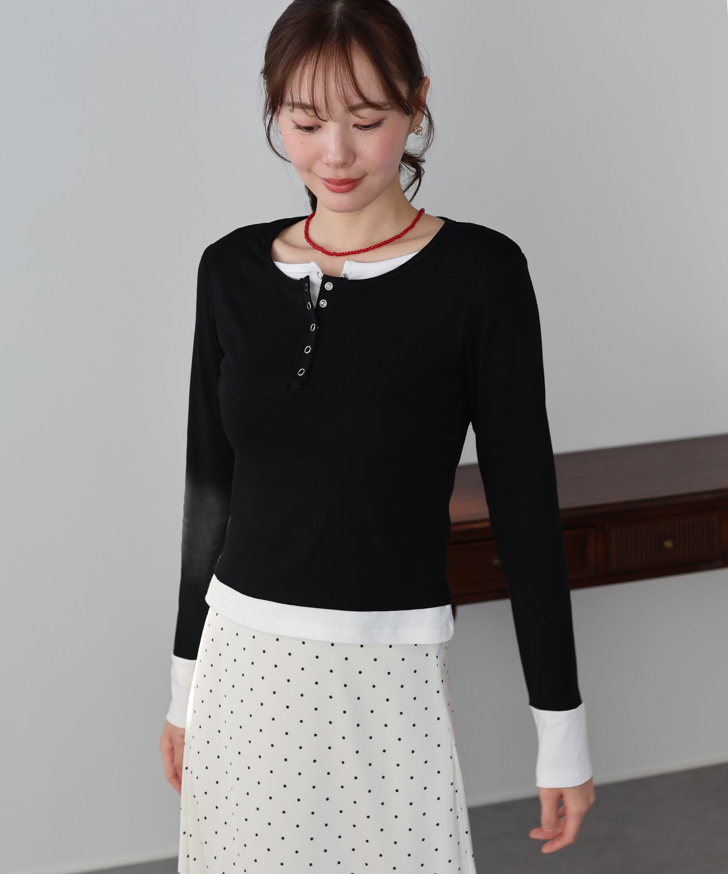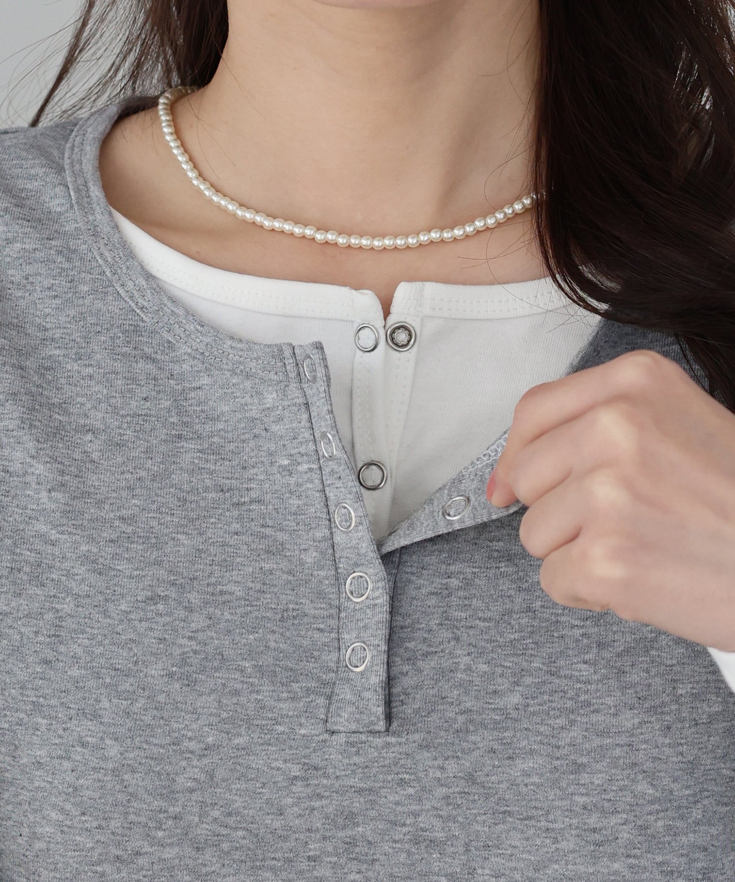 女性らしさと程よいカジュアル感を両立した、レイヤードデザインのヘンリーネックTシャツ