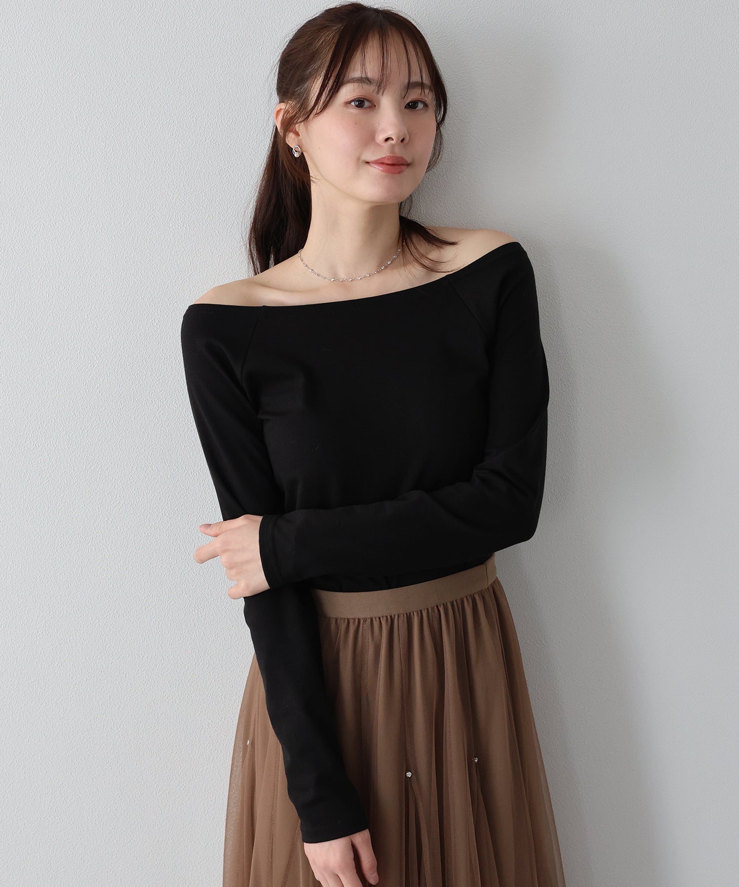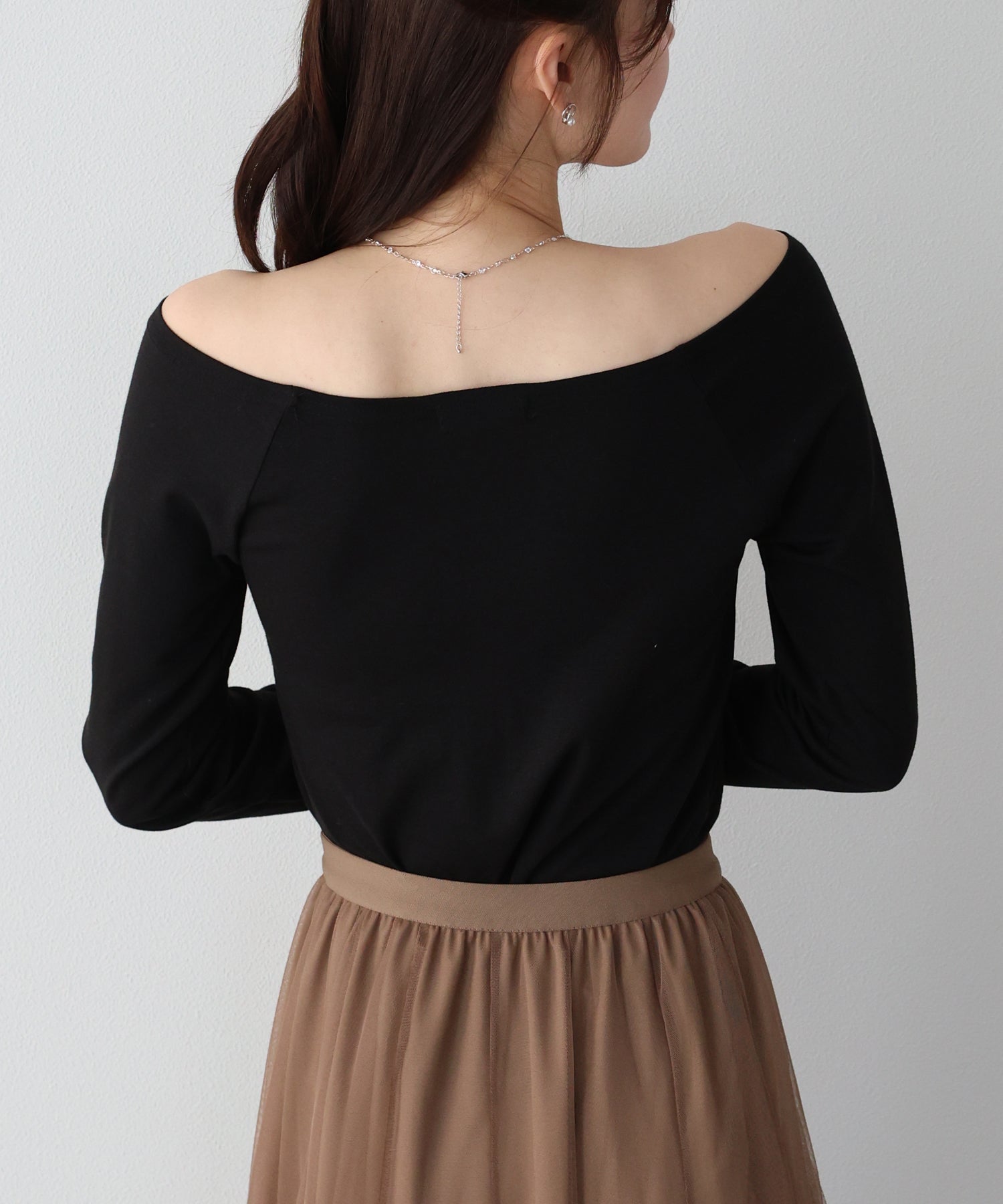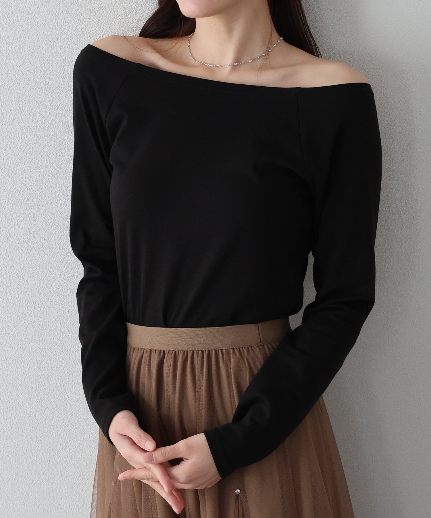 デコルテラインが大きく開いたオフショルTにはネックレスがマスト!