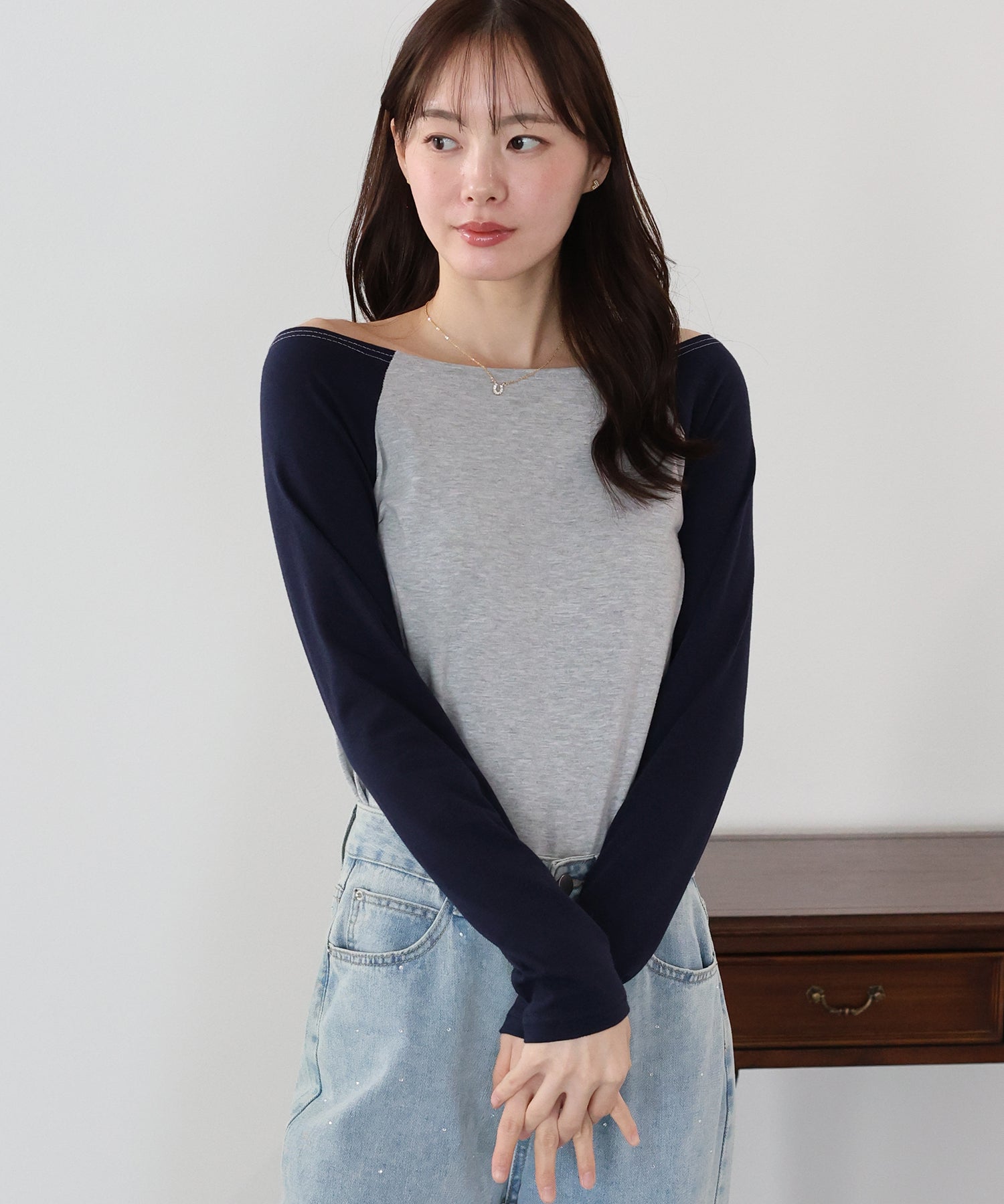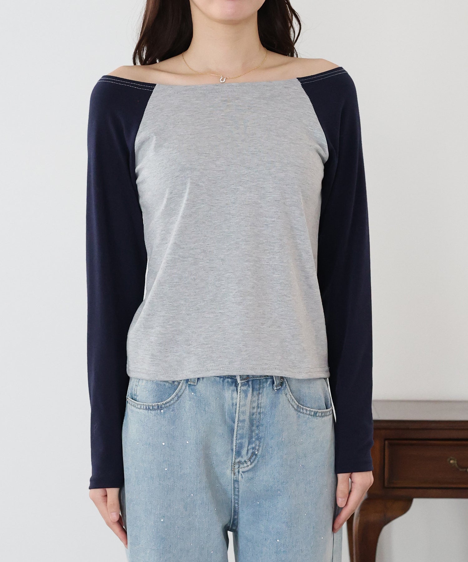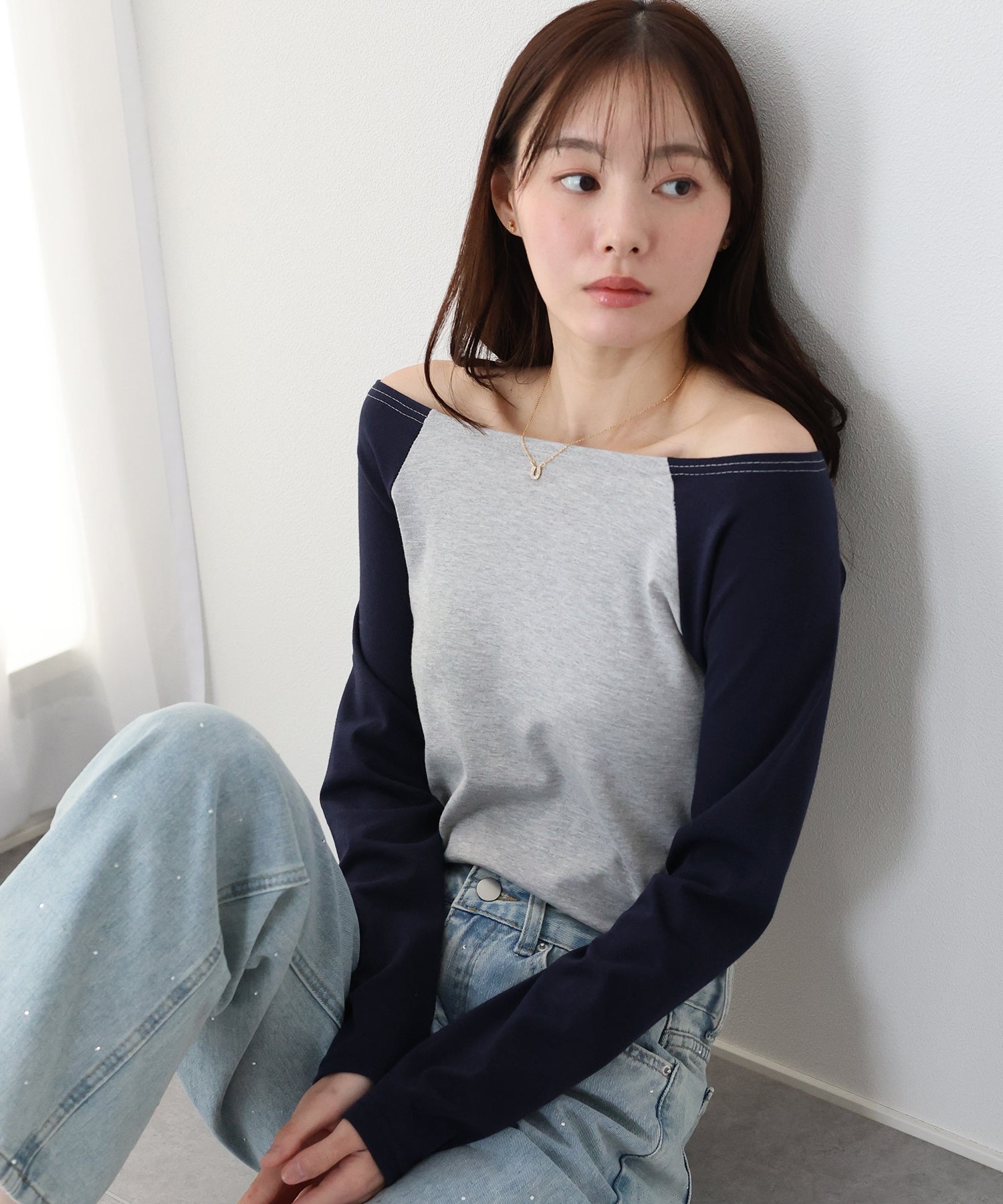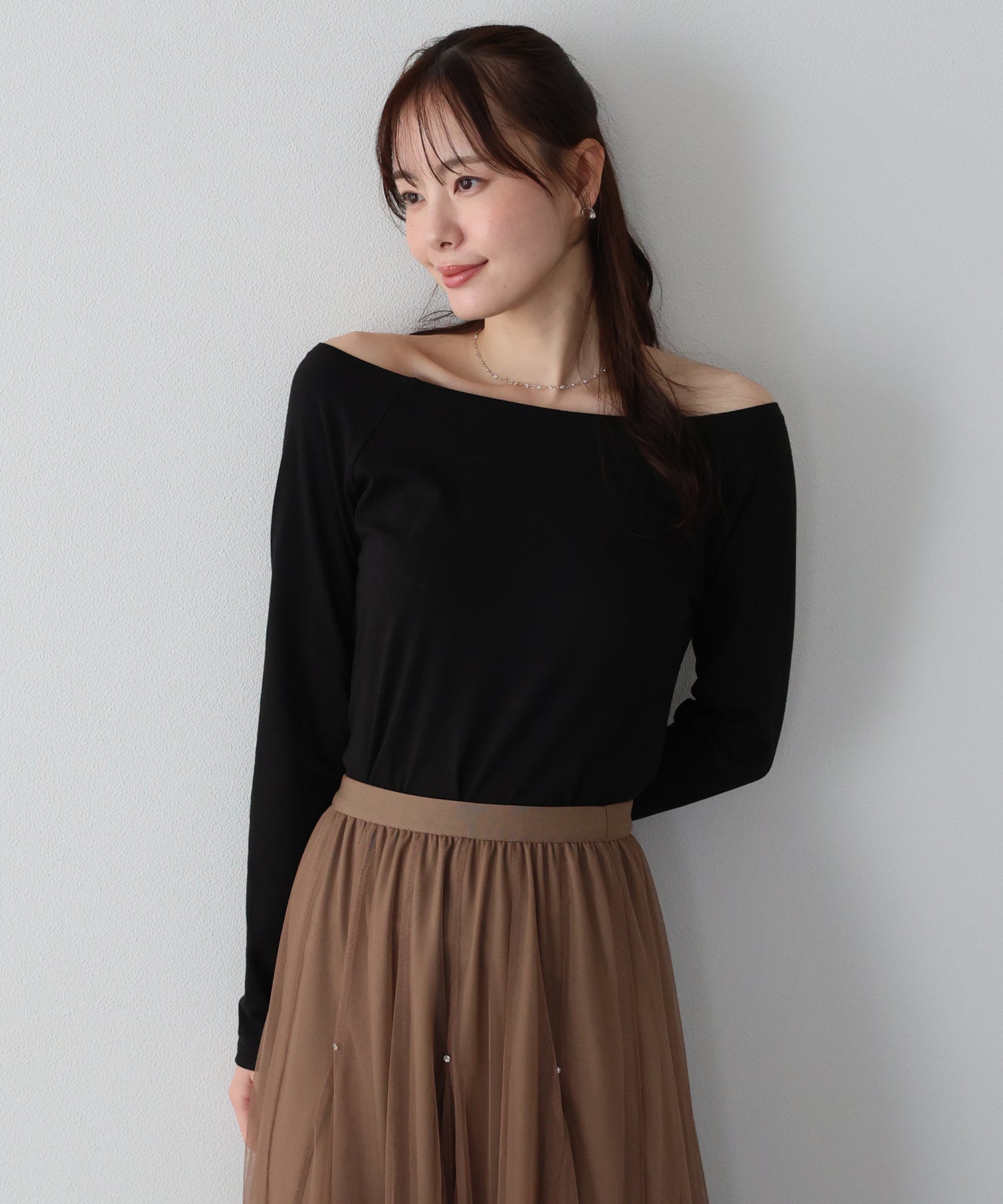 デコルテラインが大きく開いたオフショルTにはネックレスがマスト!