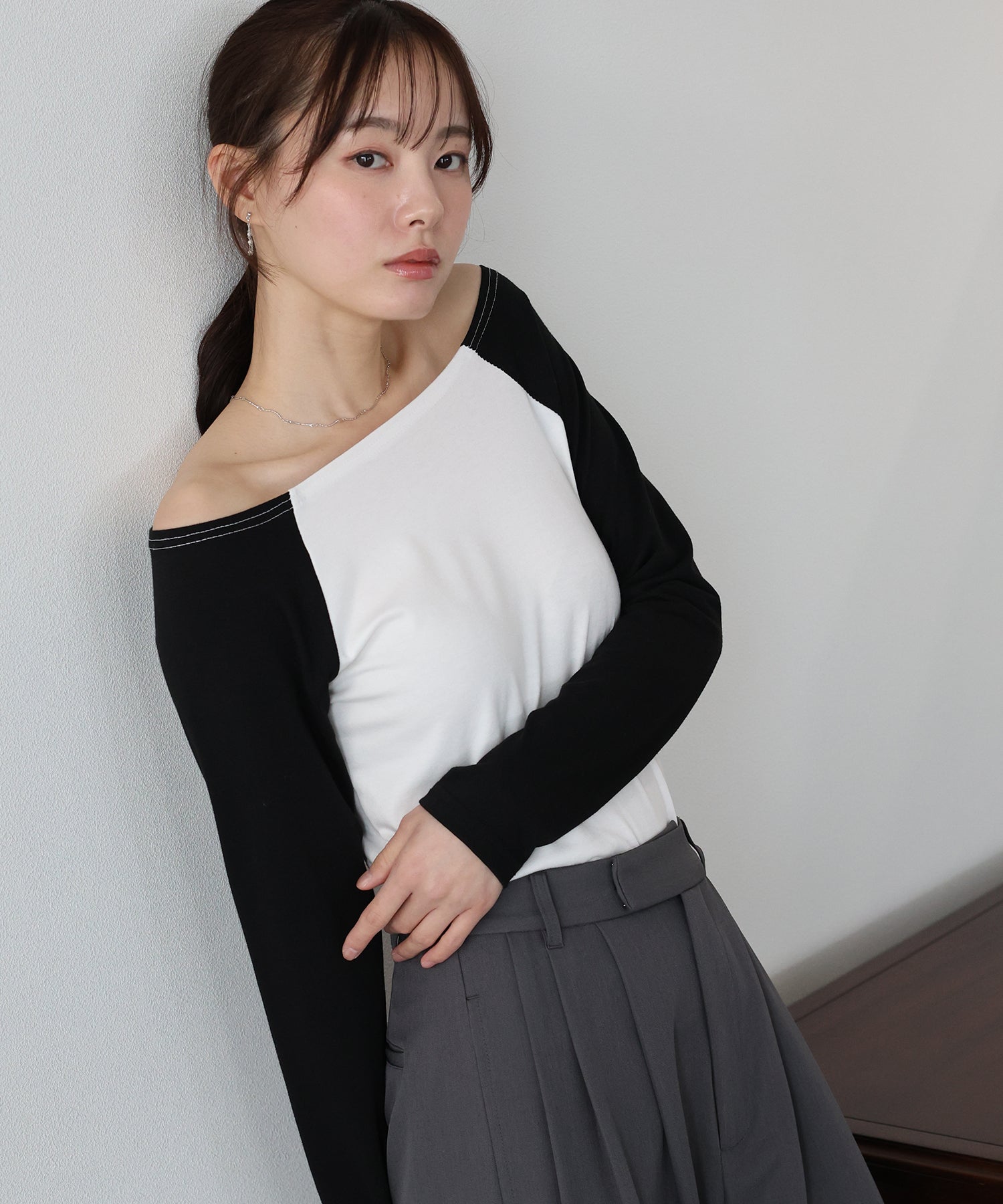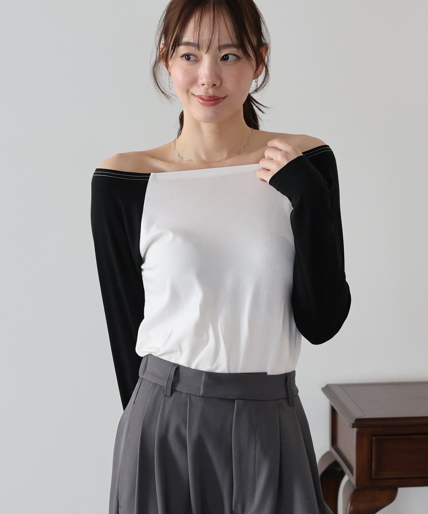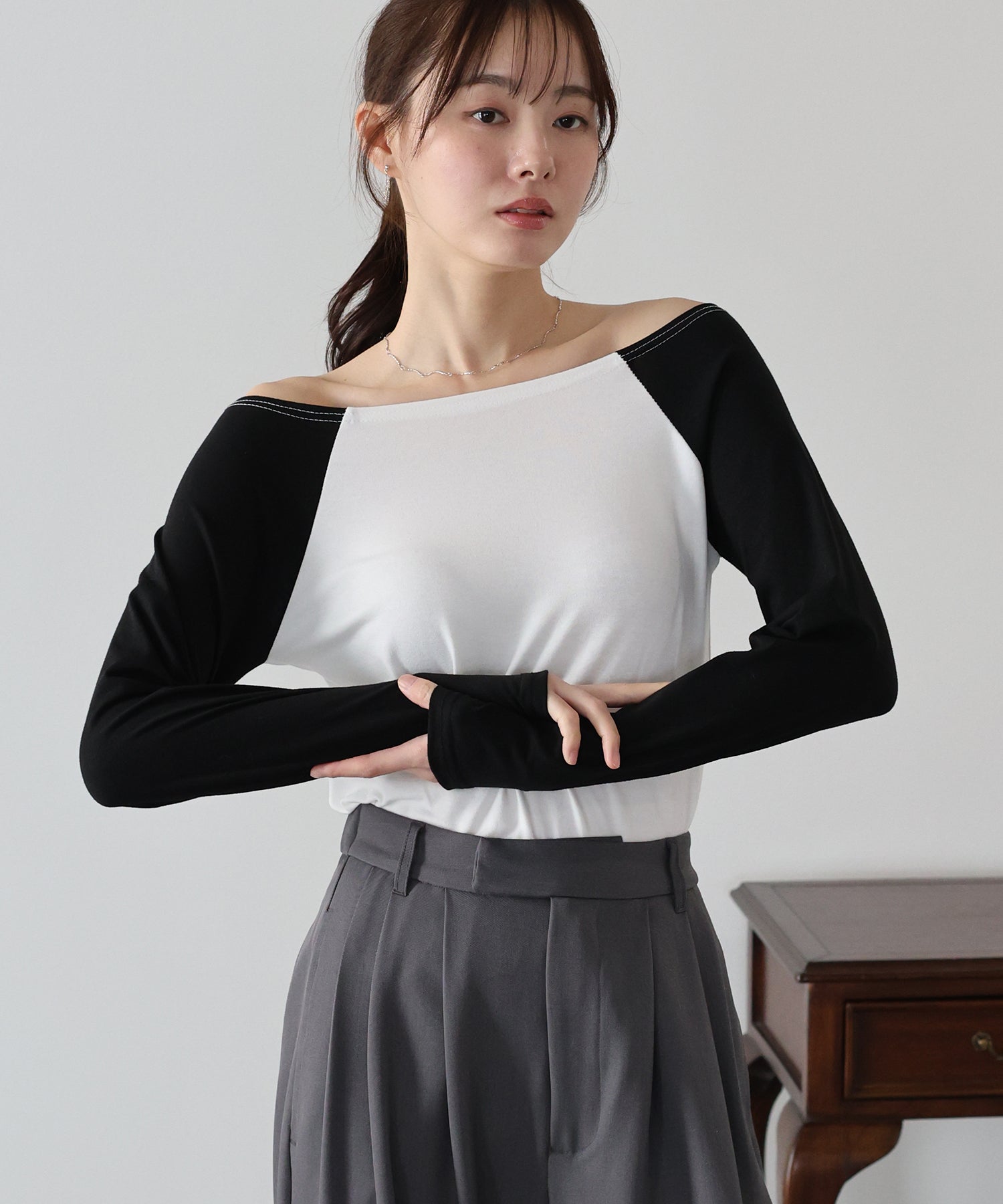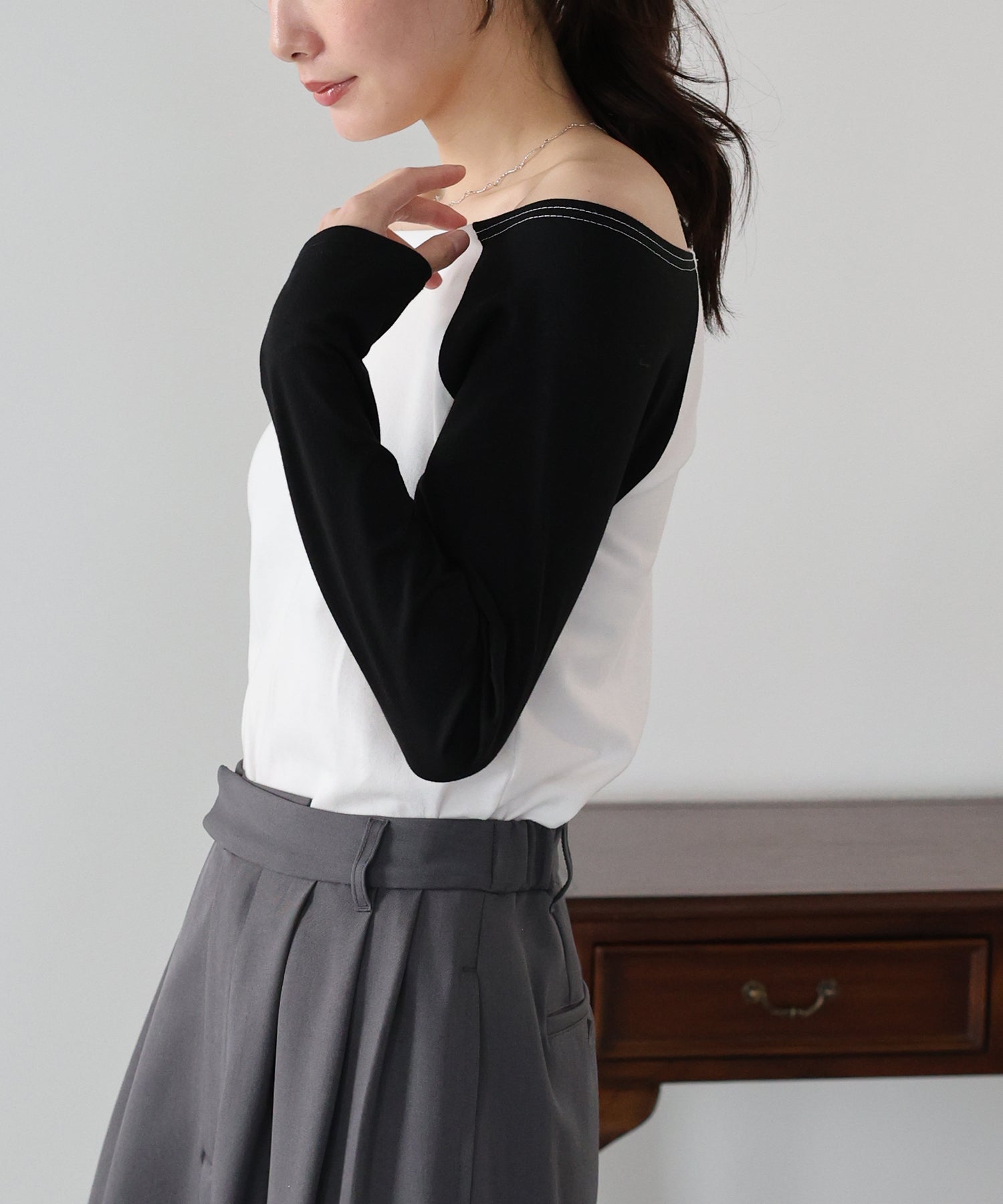 無地のブラックはフェミニンな印象に、バイカラー袖のホワイト系・グレー系はカジュアルなポイントをプラスしました。