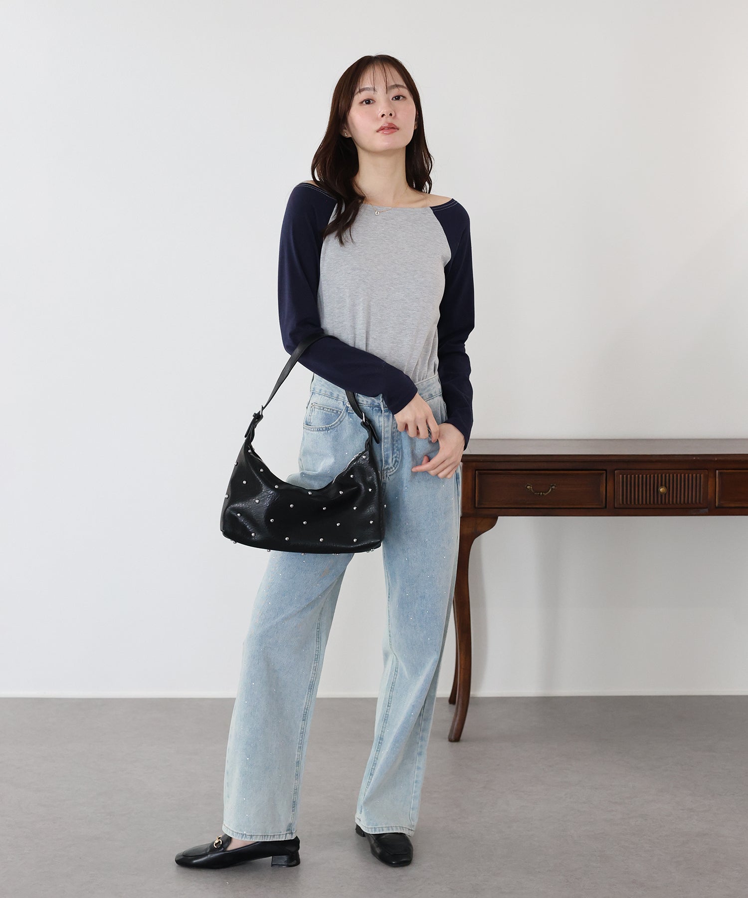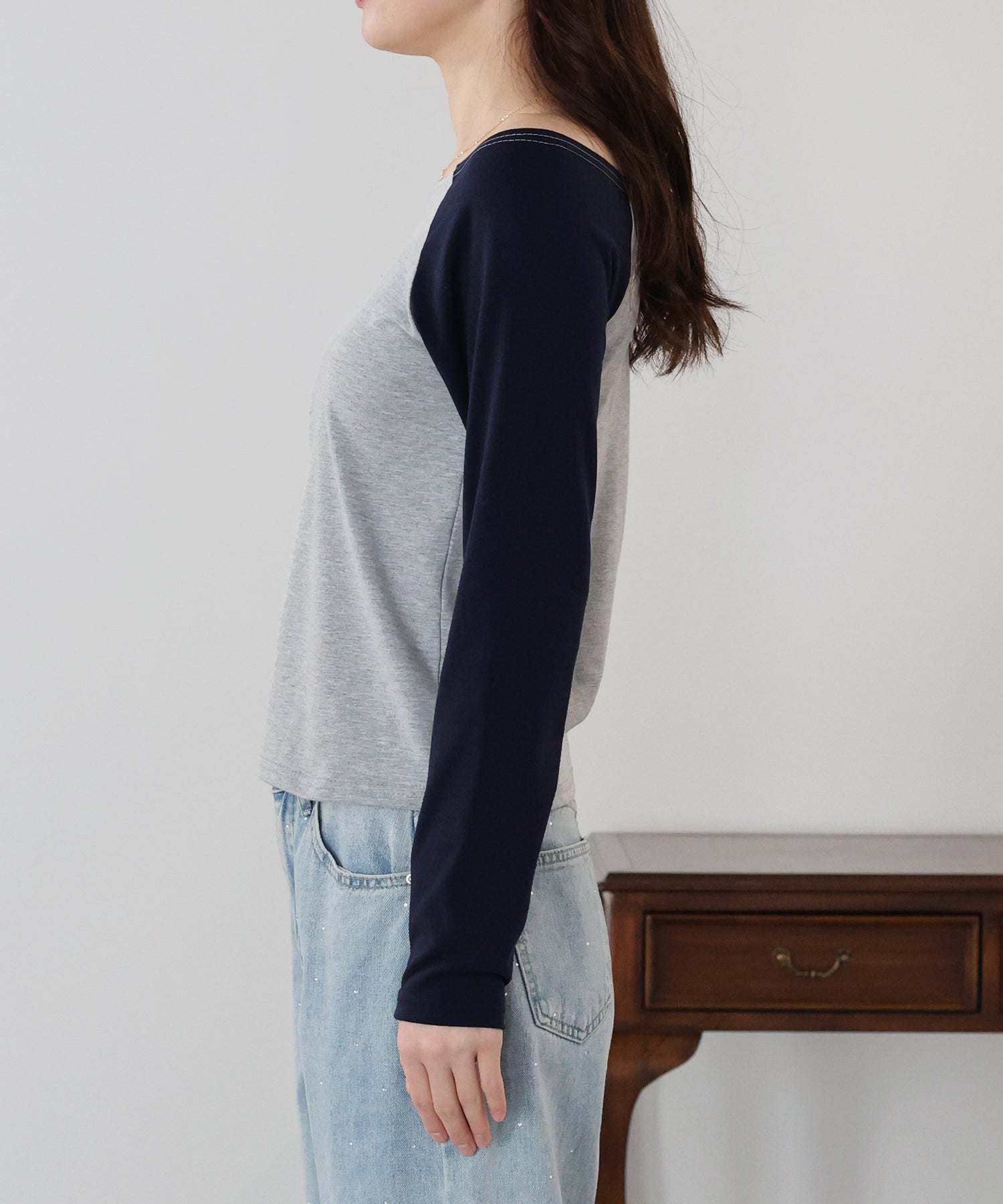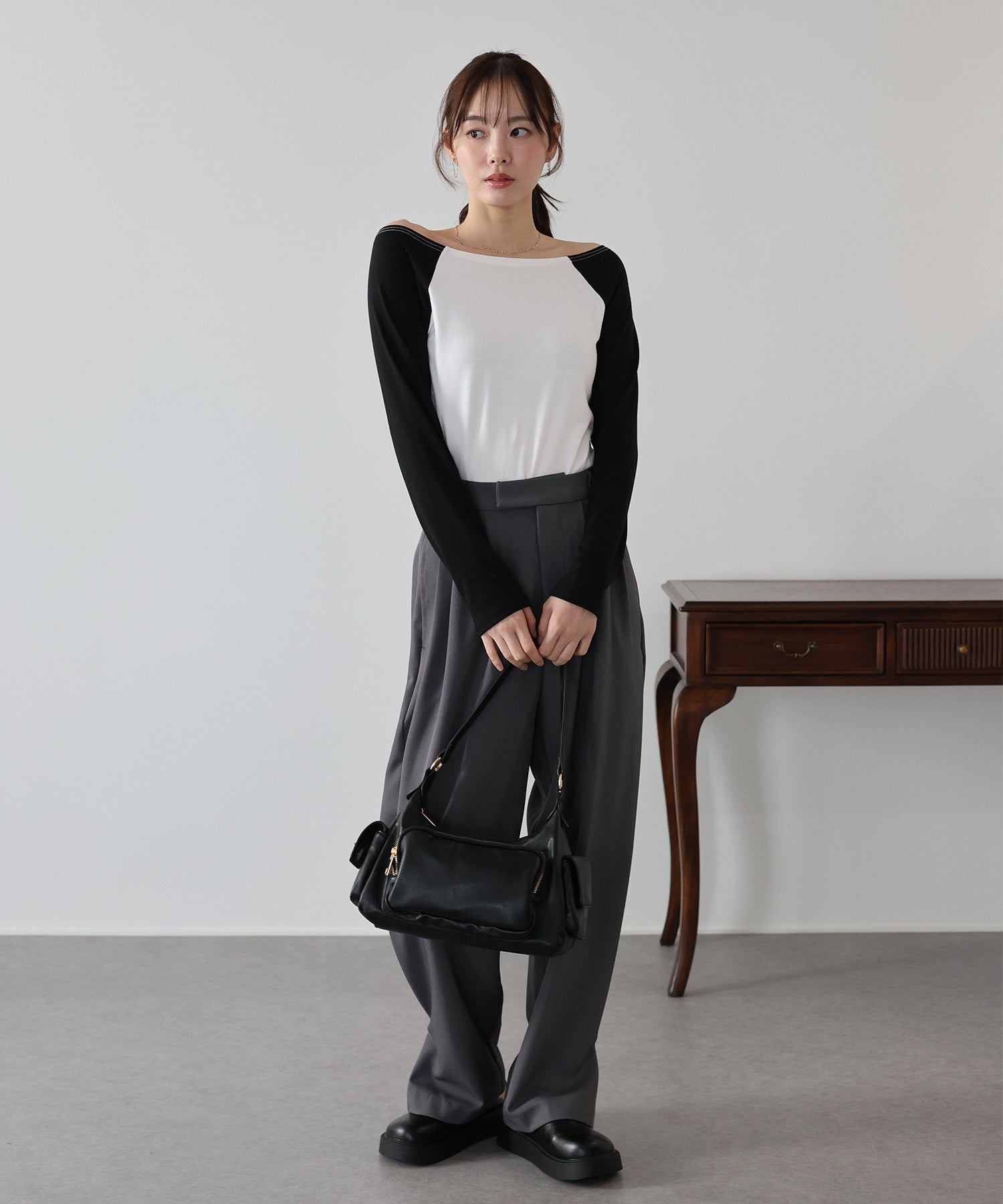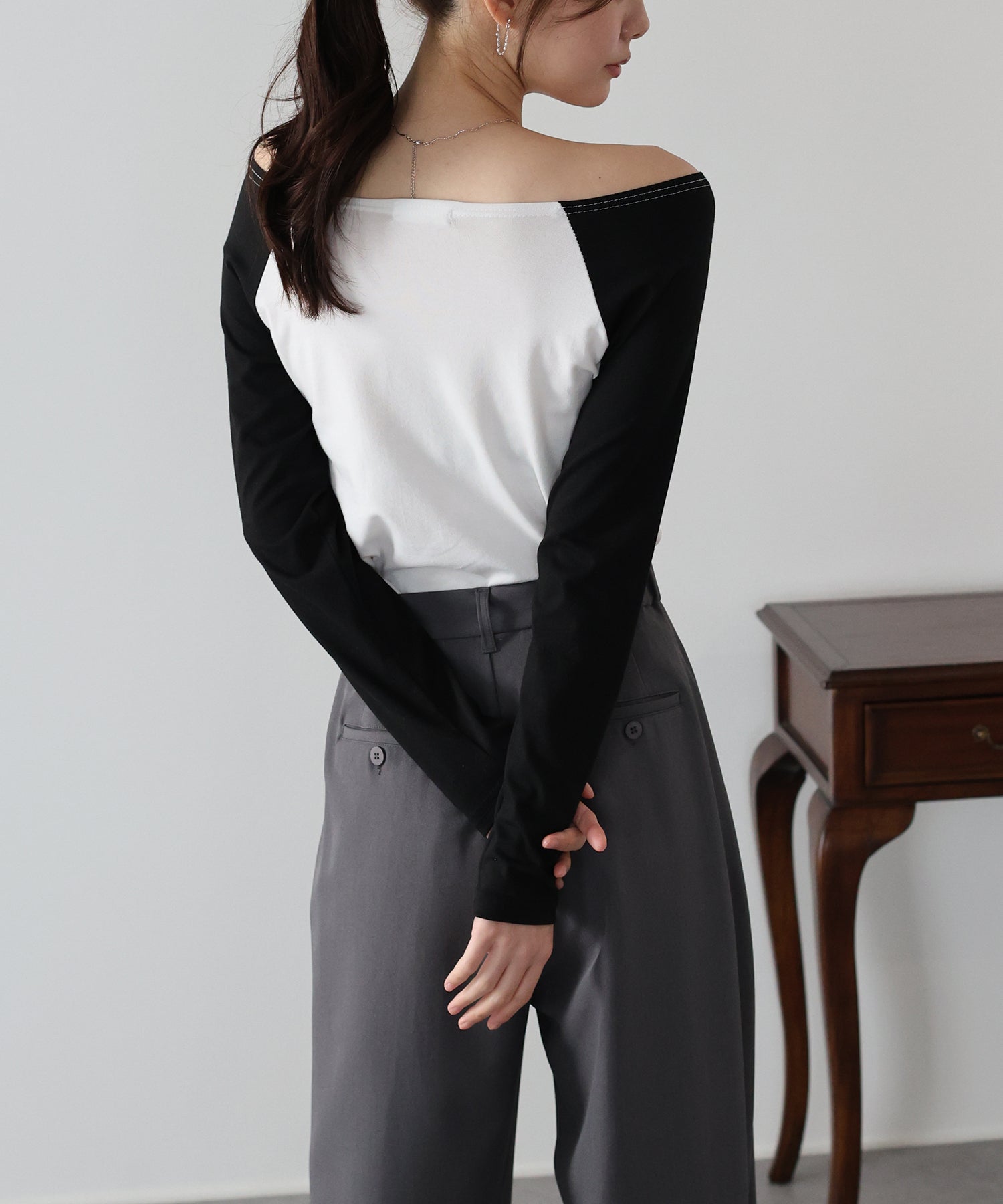 無地のブラックはフェミニンな印象に、バイカラー袖のホワイト系・グレー系はカジュアルなポイントをプラスしました。