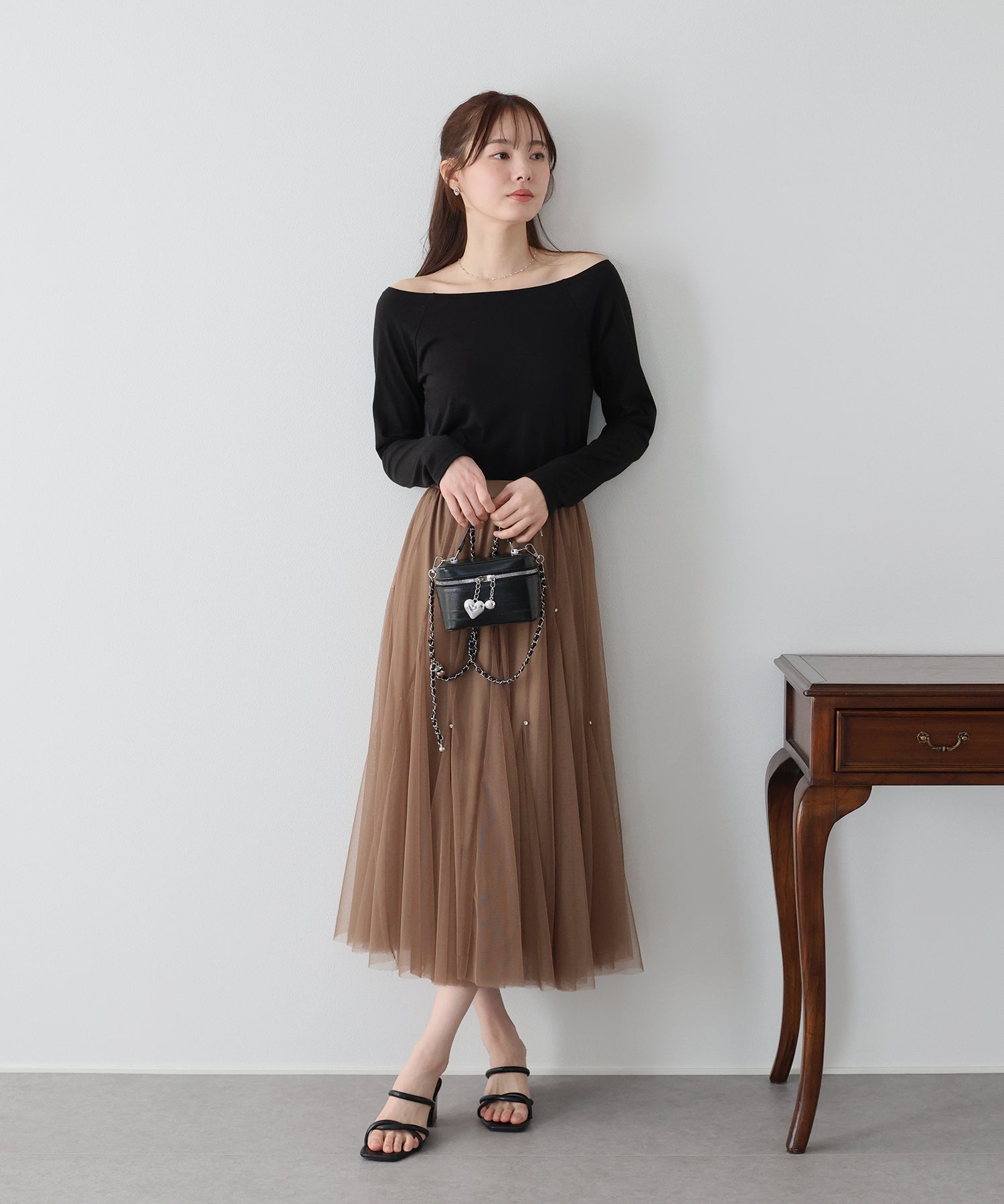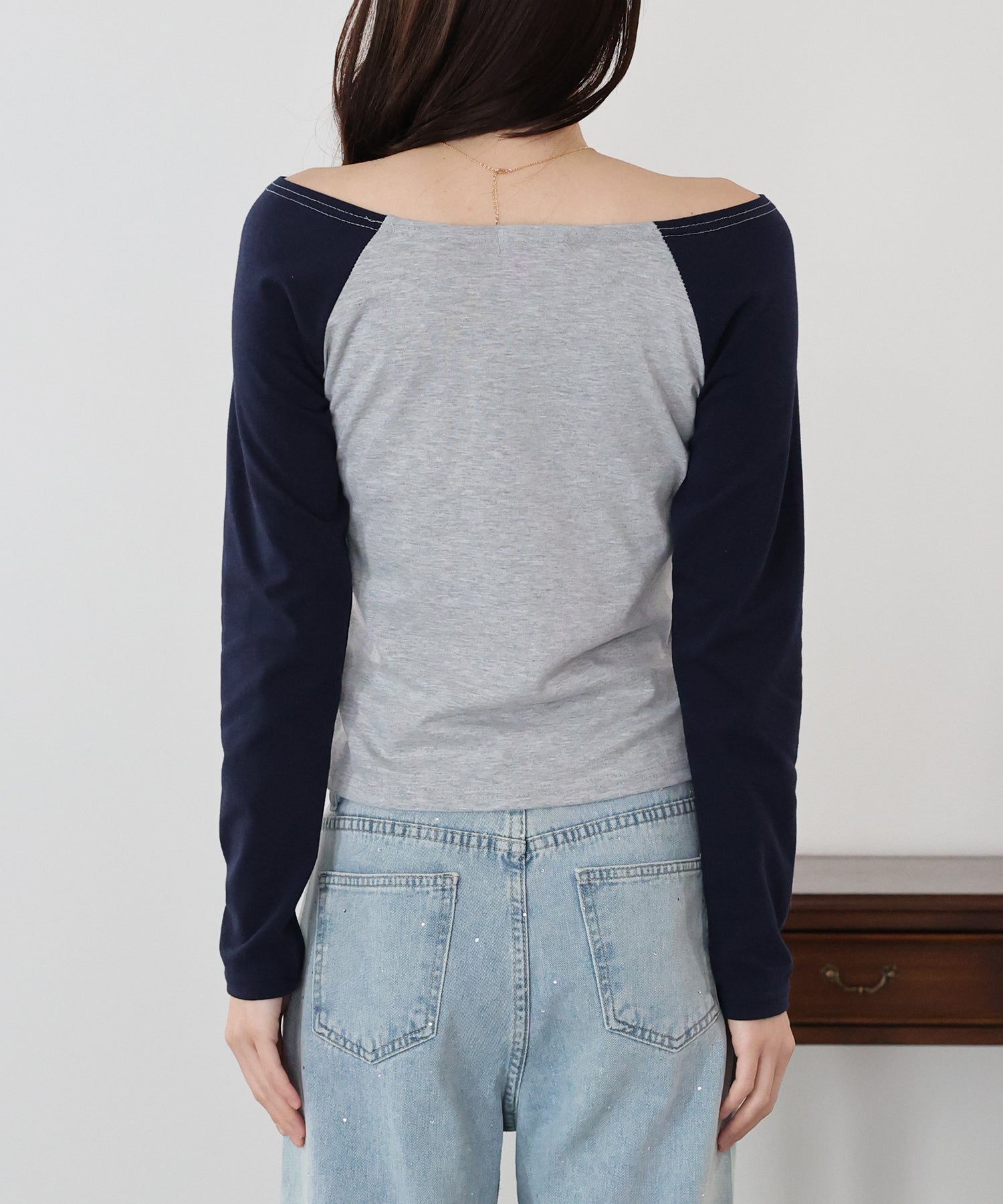 スッキリと開いたネックは、デコルテから肩のラインまで綺麗に魅せ女性らしい印象に演出してくれます。