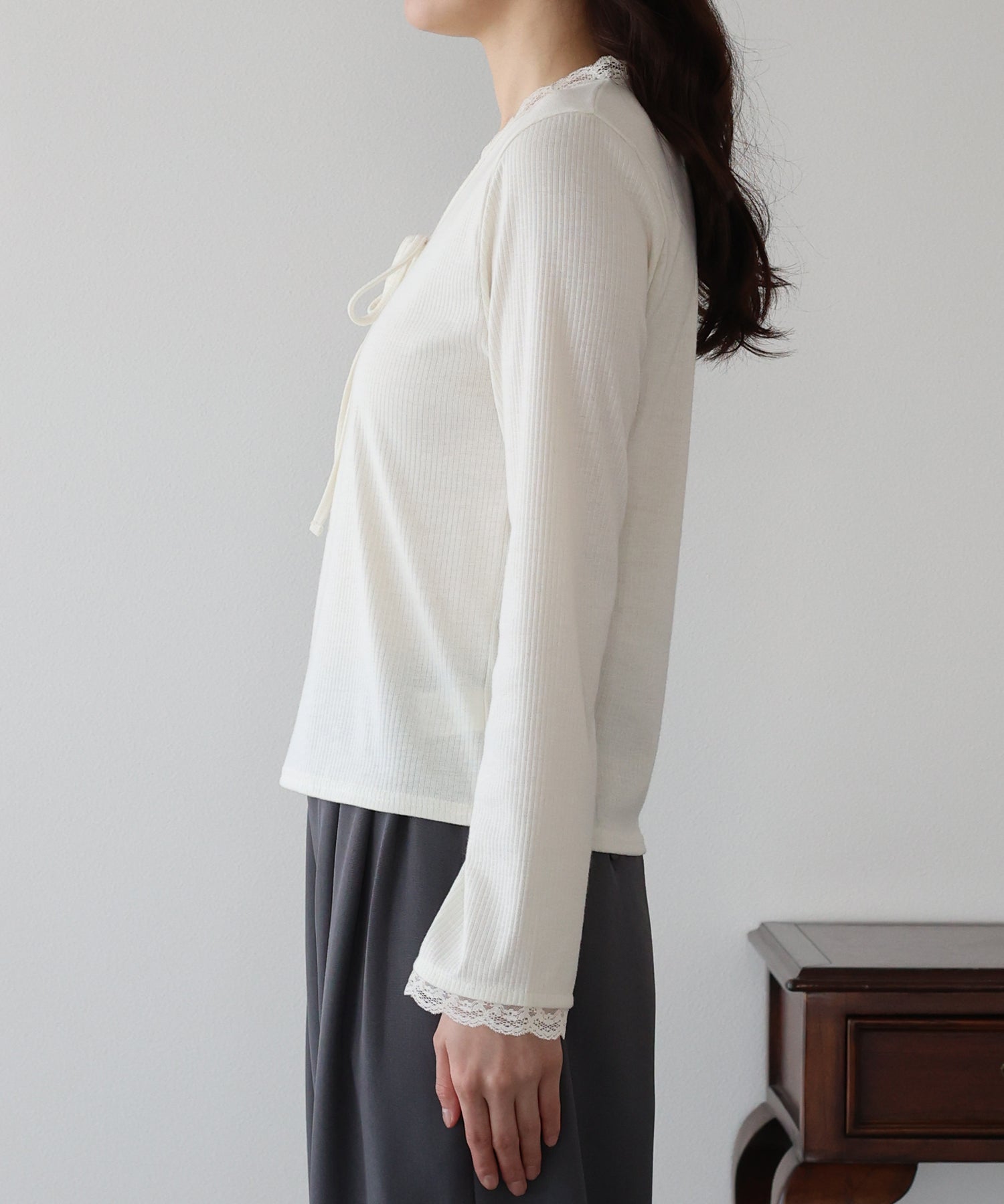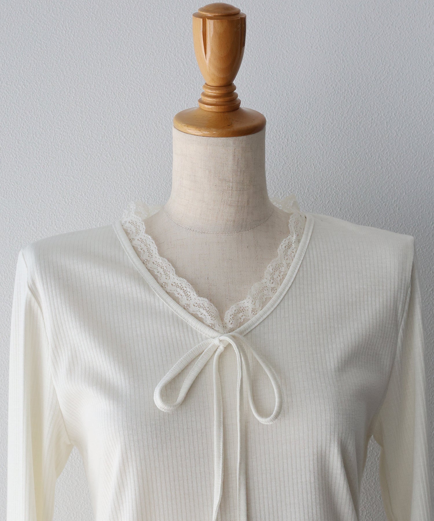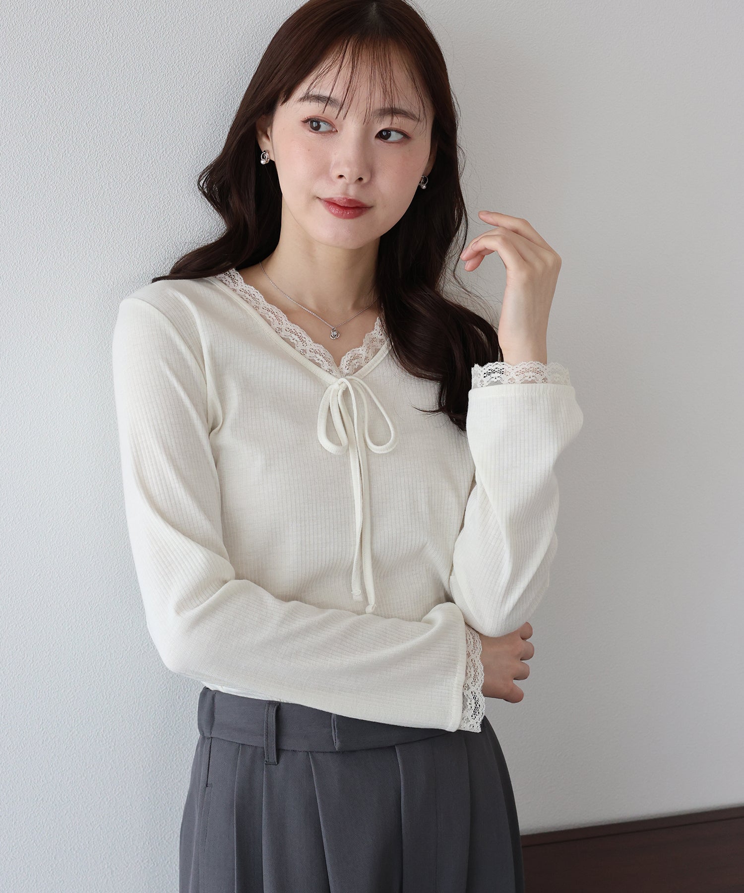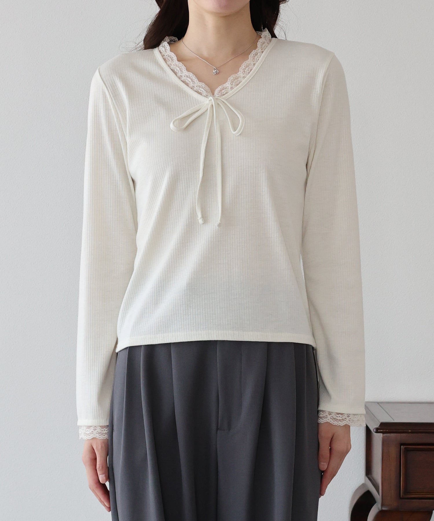 Vネックに沿った繊細なレースフリルと、胸元のリボンが、顔周りを華やかな印象に見せてくれます。