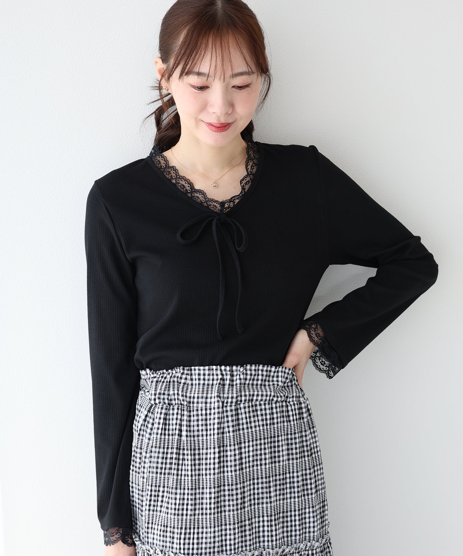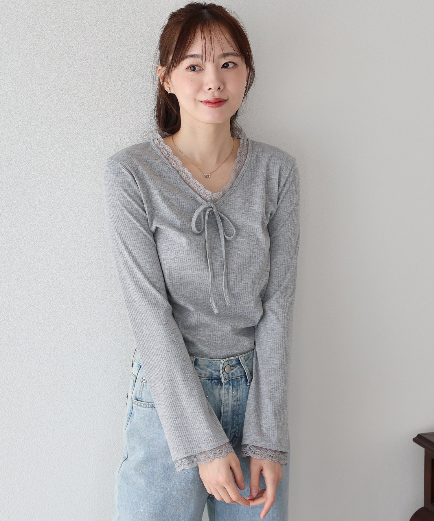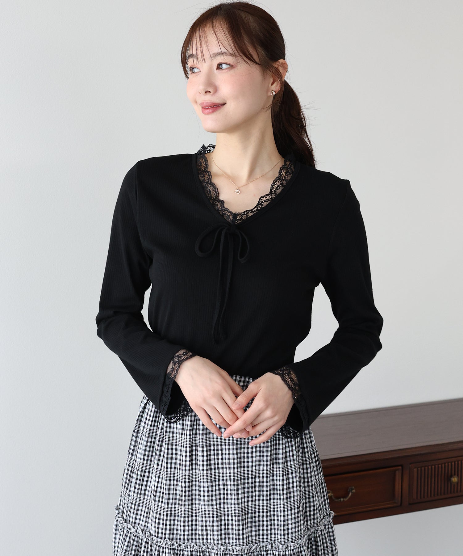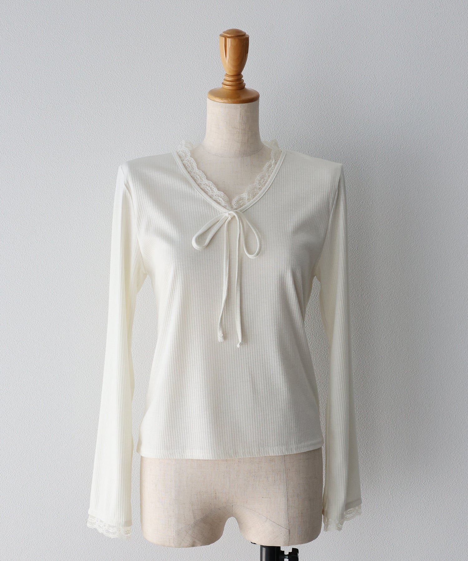 Vネックに沿った繊細なレースフリルと、胸元のリボンが、顔周りを華やかな印象に見せてくれます。
