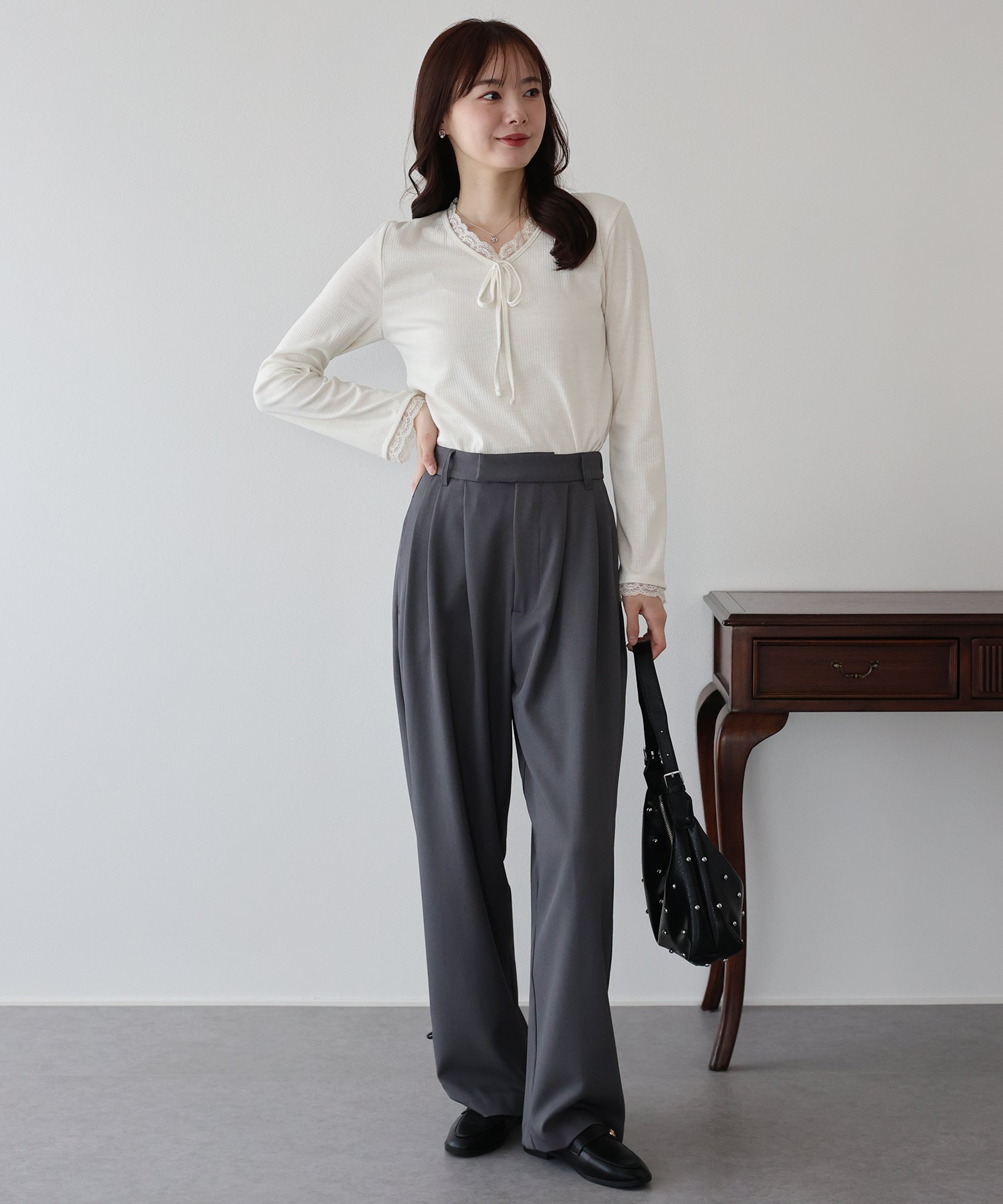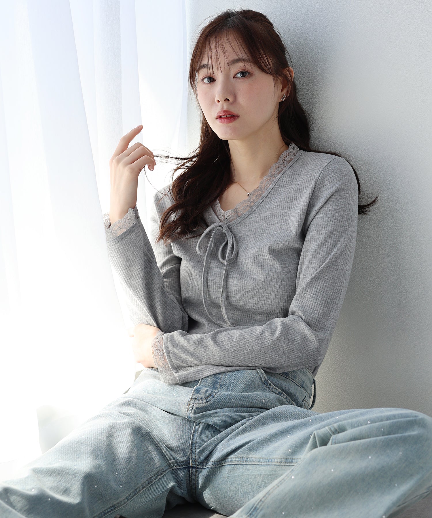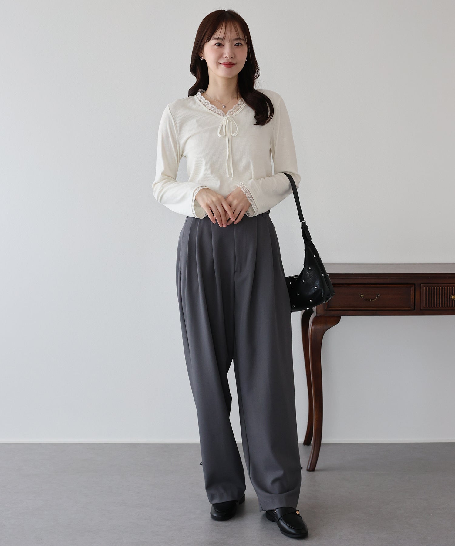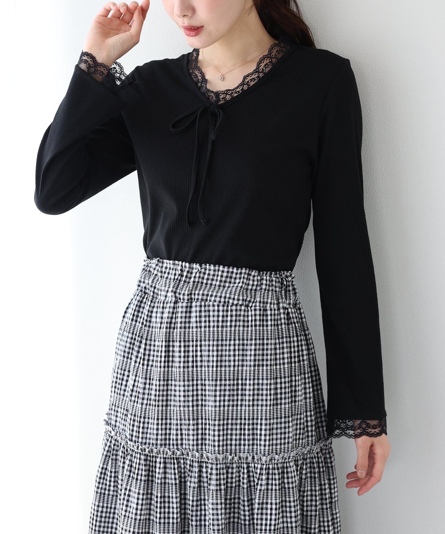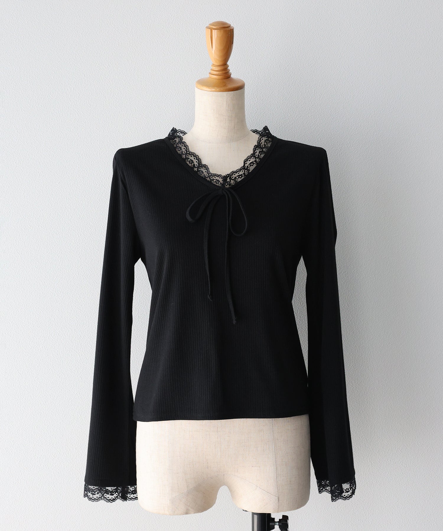 Vネックに沿った繊細なレースフリルと、胸元のリボンが、顔周りを華やかな印象に見せてくれます。