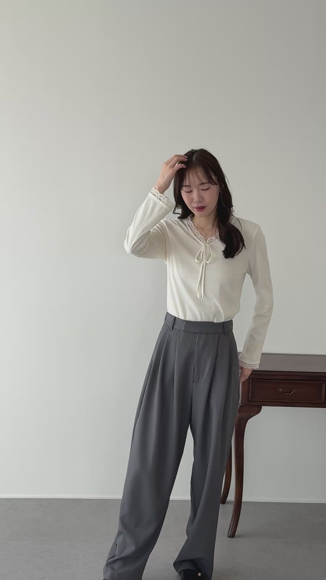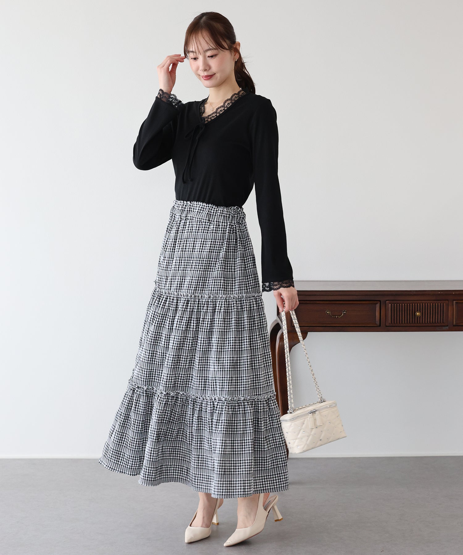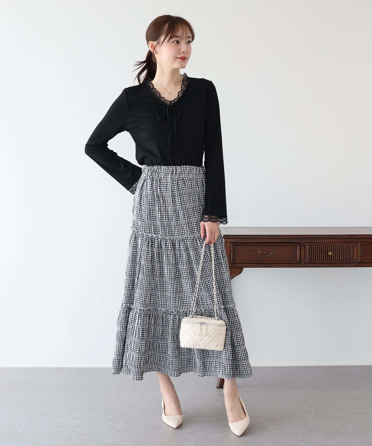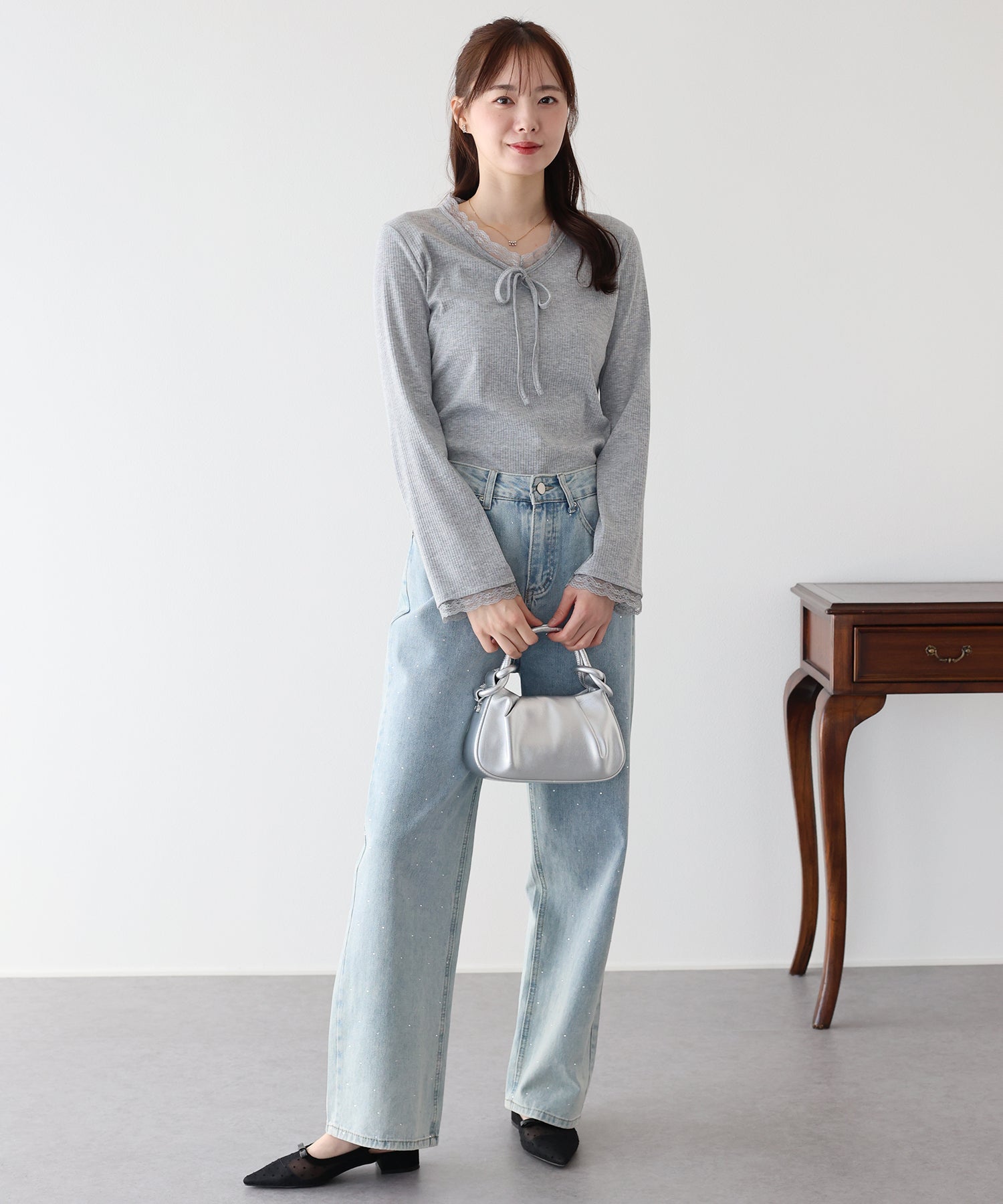 Vネックに沿った繊細なレースフリルと、胸元のリボンが、顔周りを華やかな印象に見せてくれます。