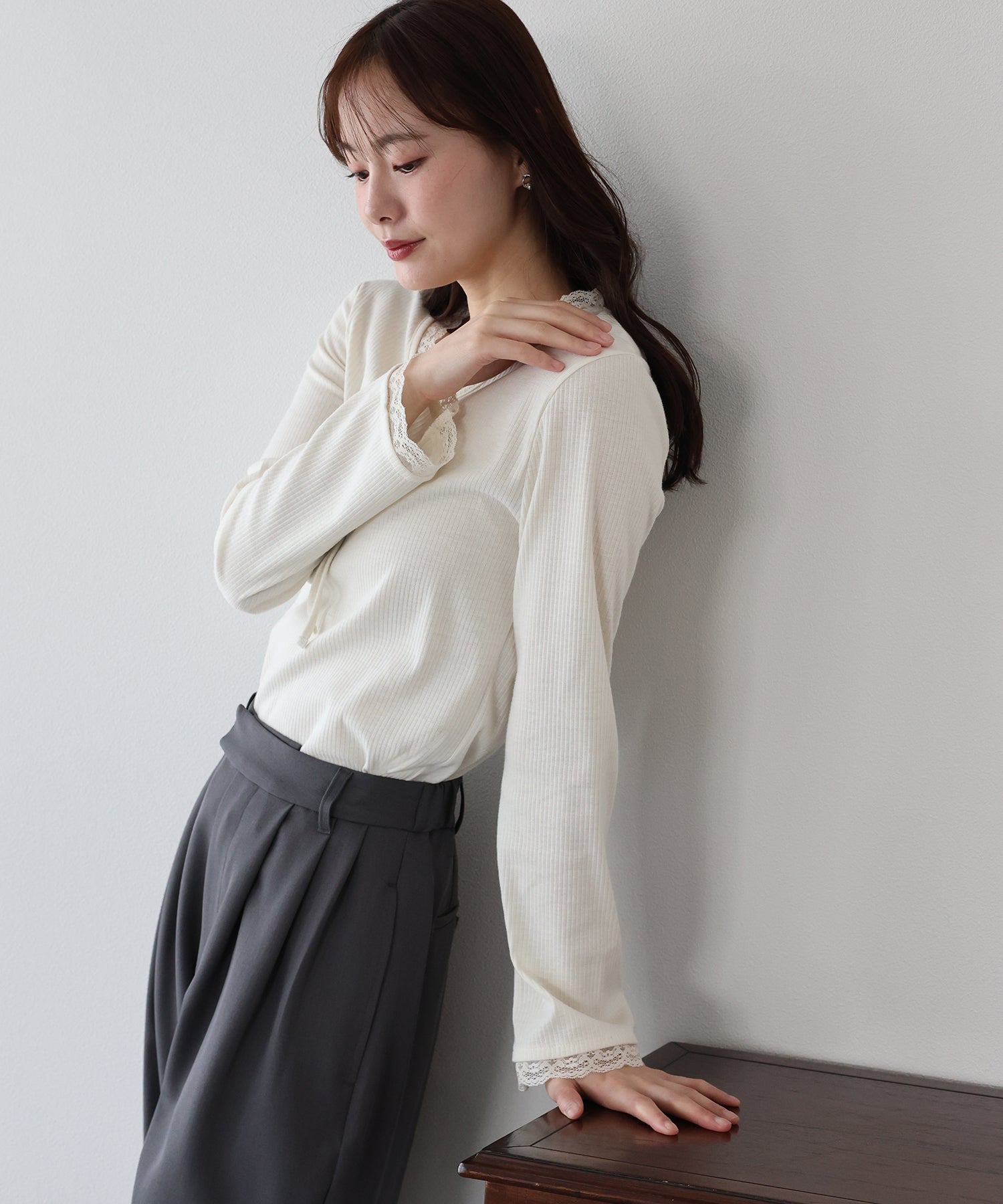 繊細なレースをネックと袖口にドッキングしたトレンド感のある上品リブカットソー。