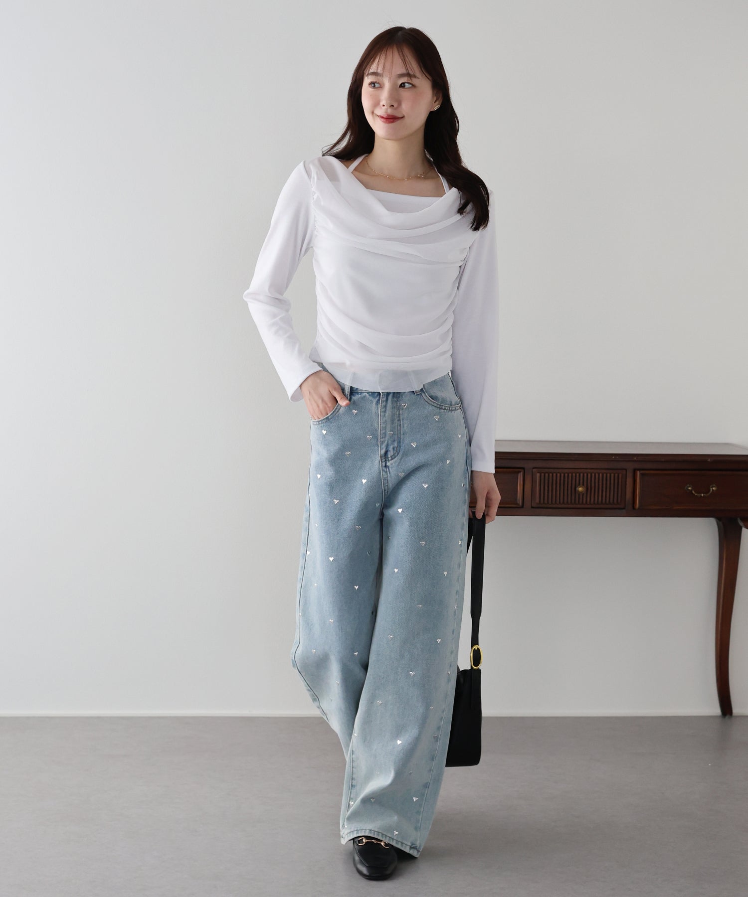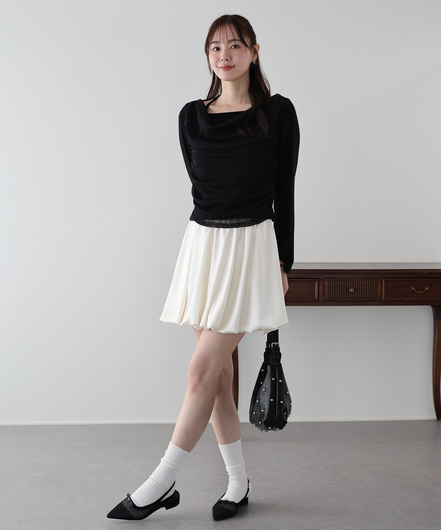胸元のチュールはほどよく透け感があるので、インナーによってさまざまなスタイリングが可能◎