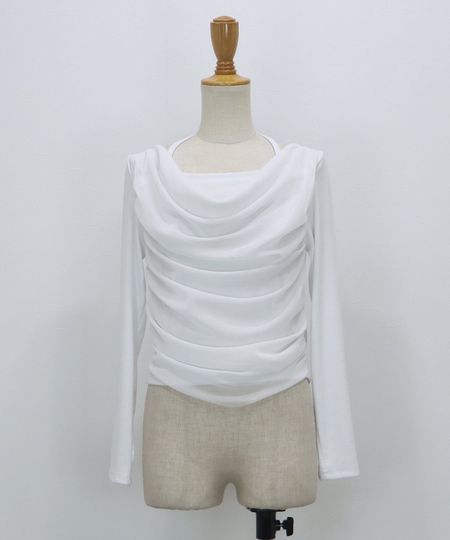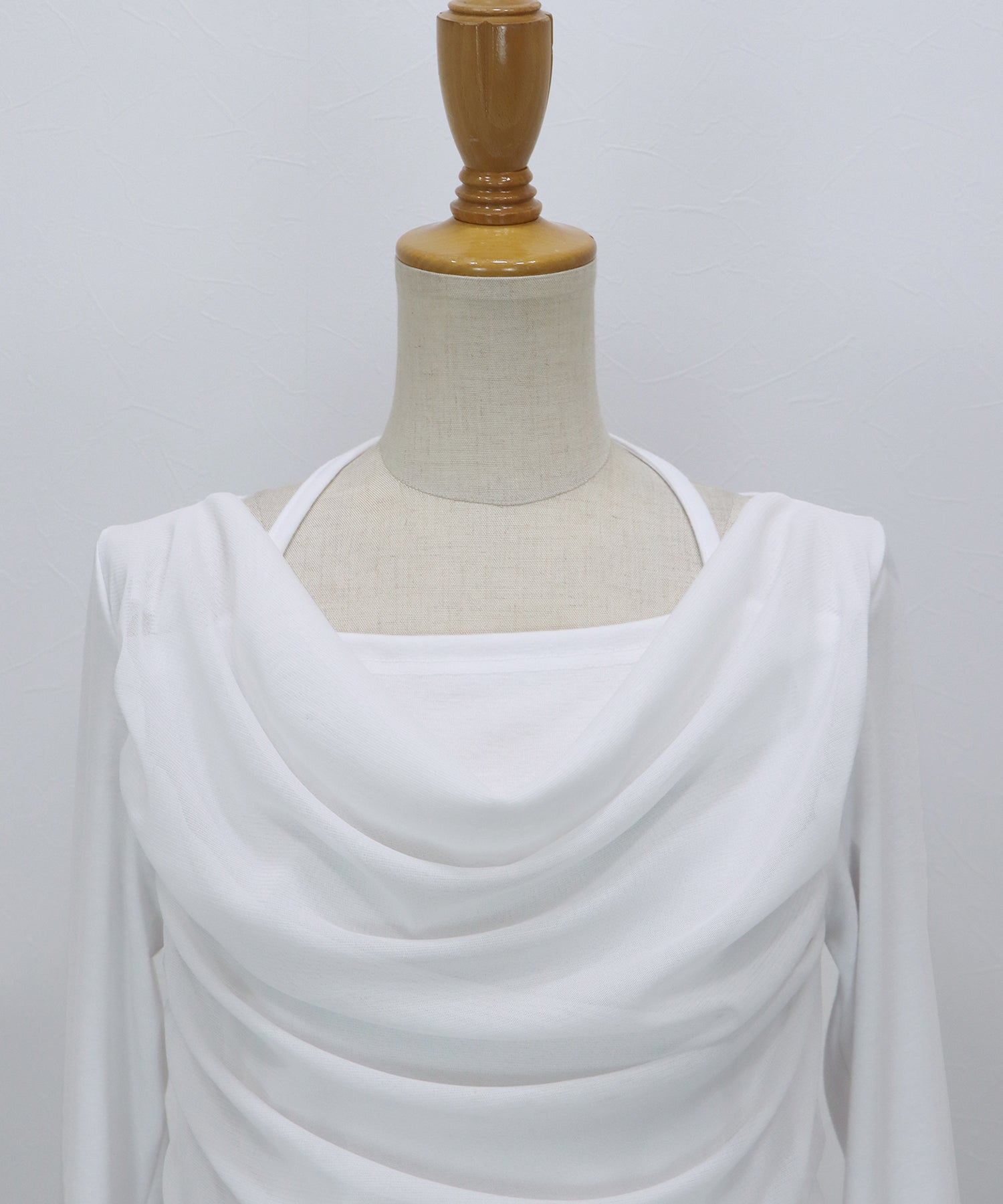 デコルテを美しく見せてくれるドレープデザインで、フェミニンさをプラス。