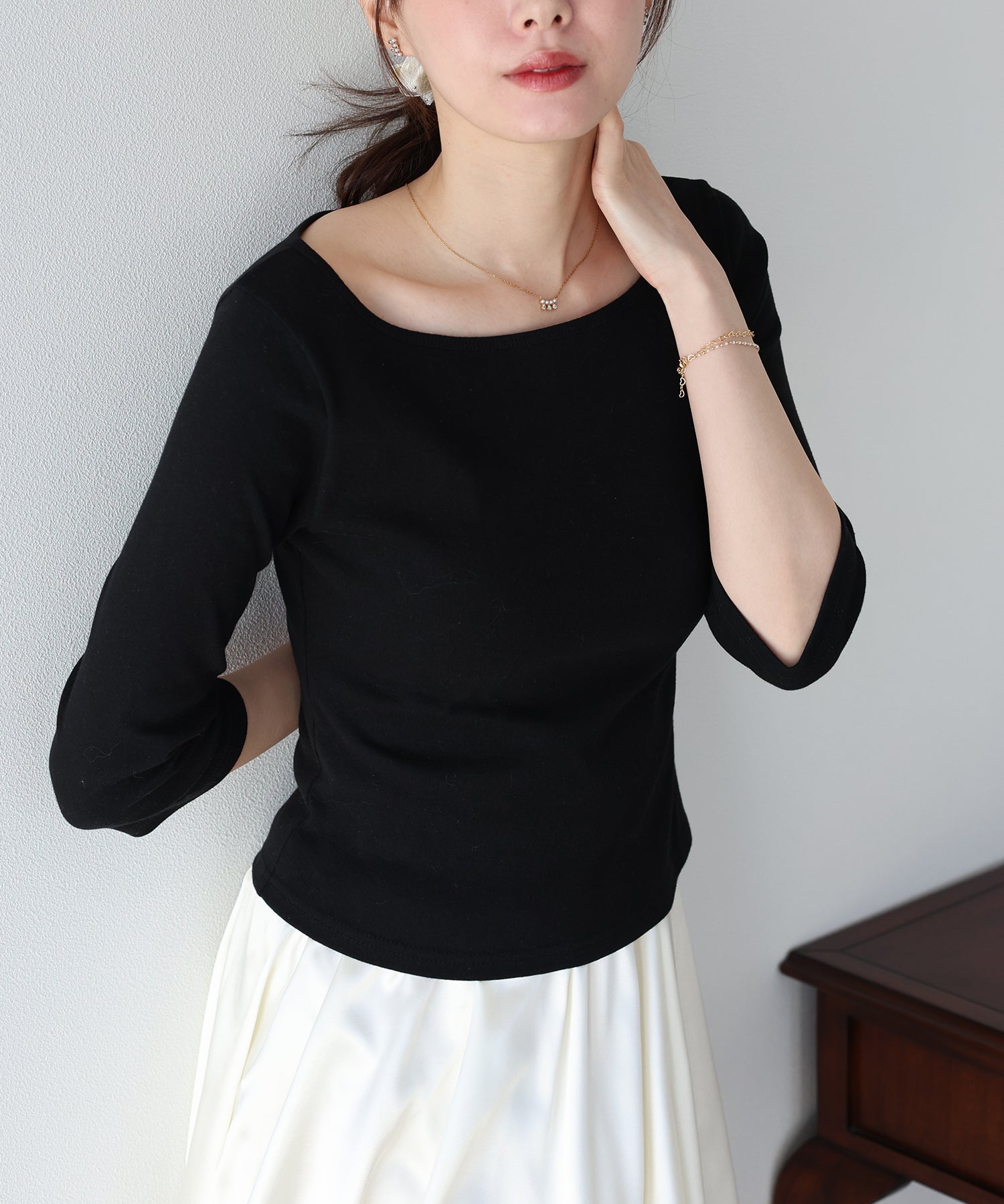 すっきりと開いたネックラインが女性らしい印象を演出し、