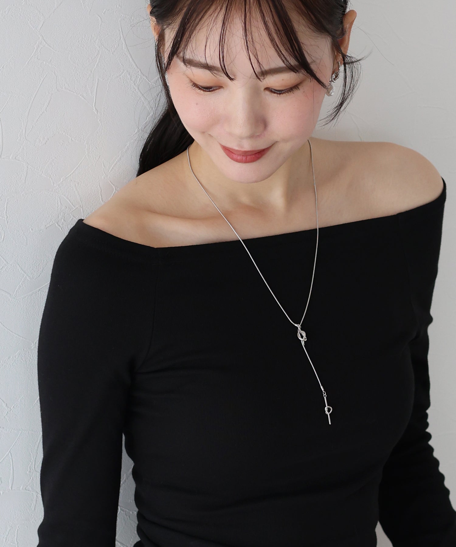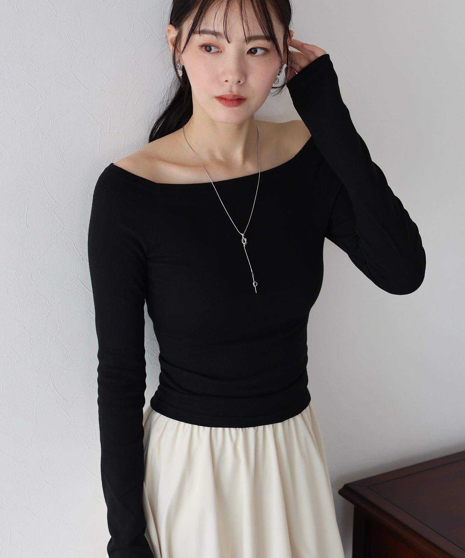 デコルテラインが大きく開いたオフショルTにはネックレスがマスト!