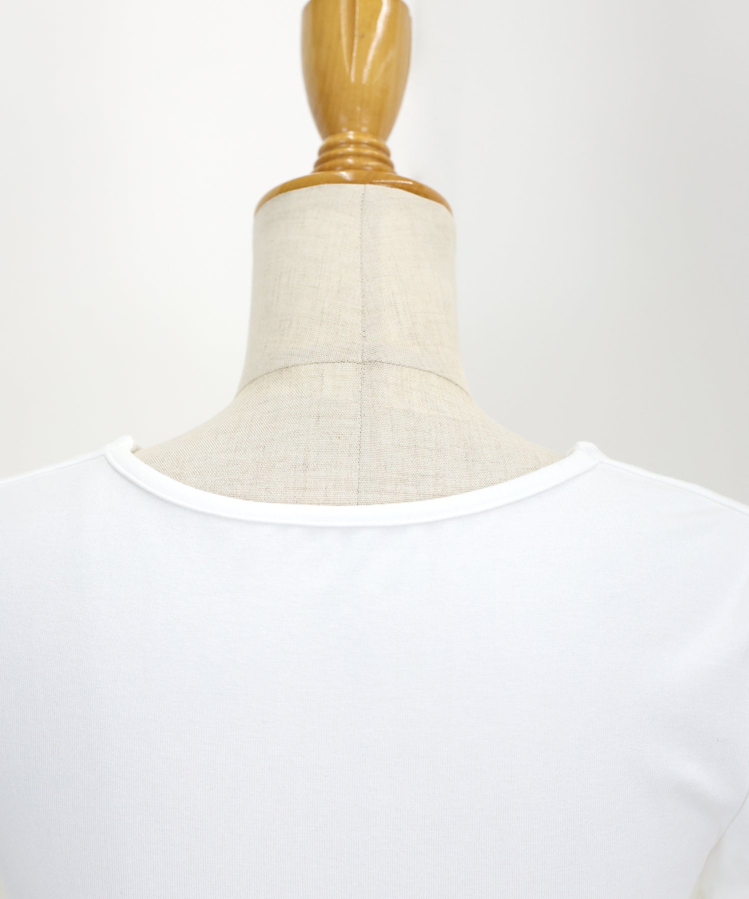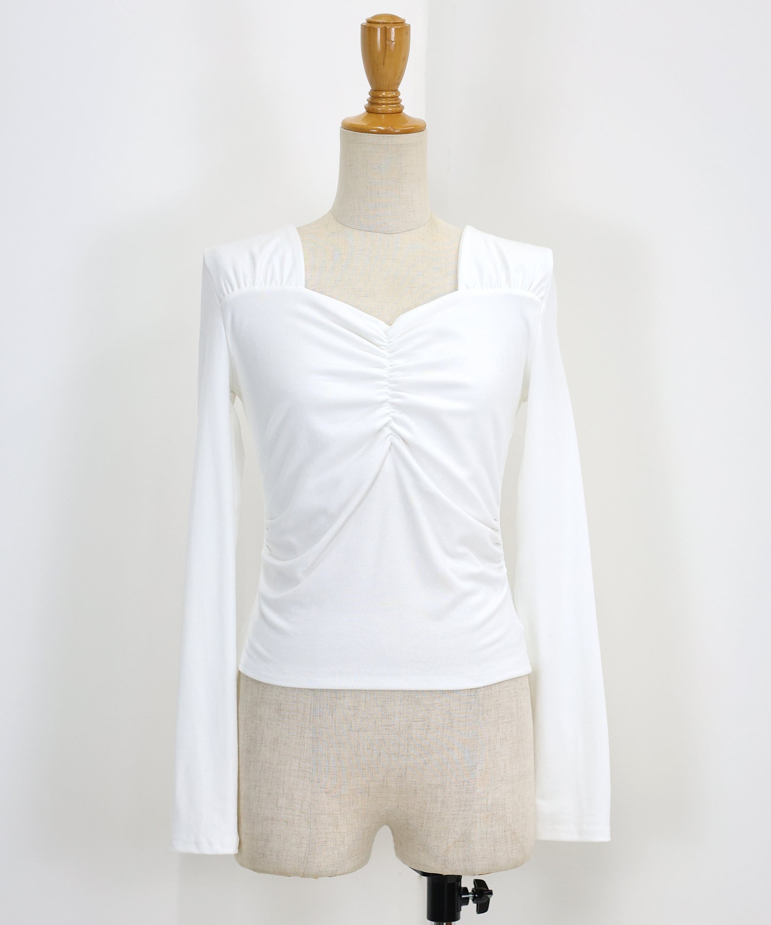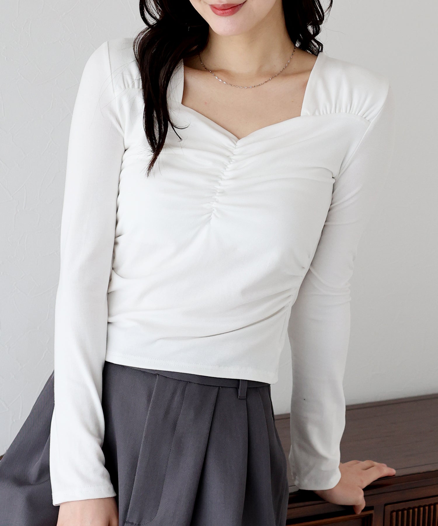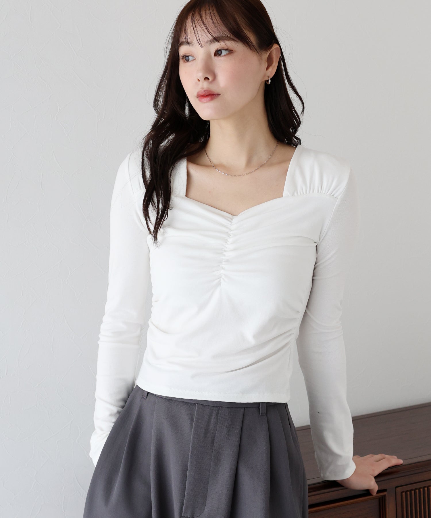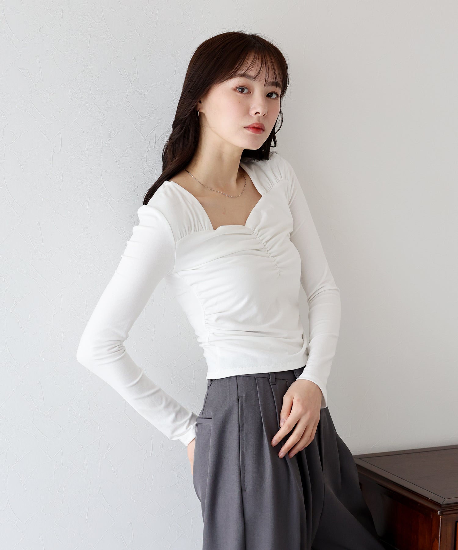 デコルテを美しく引き立てるハートネックが目を惹くカットソー。