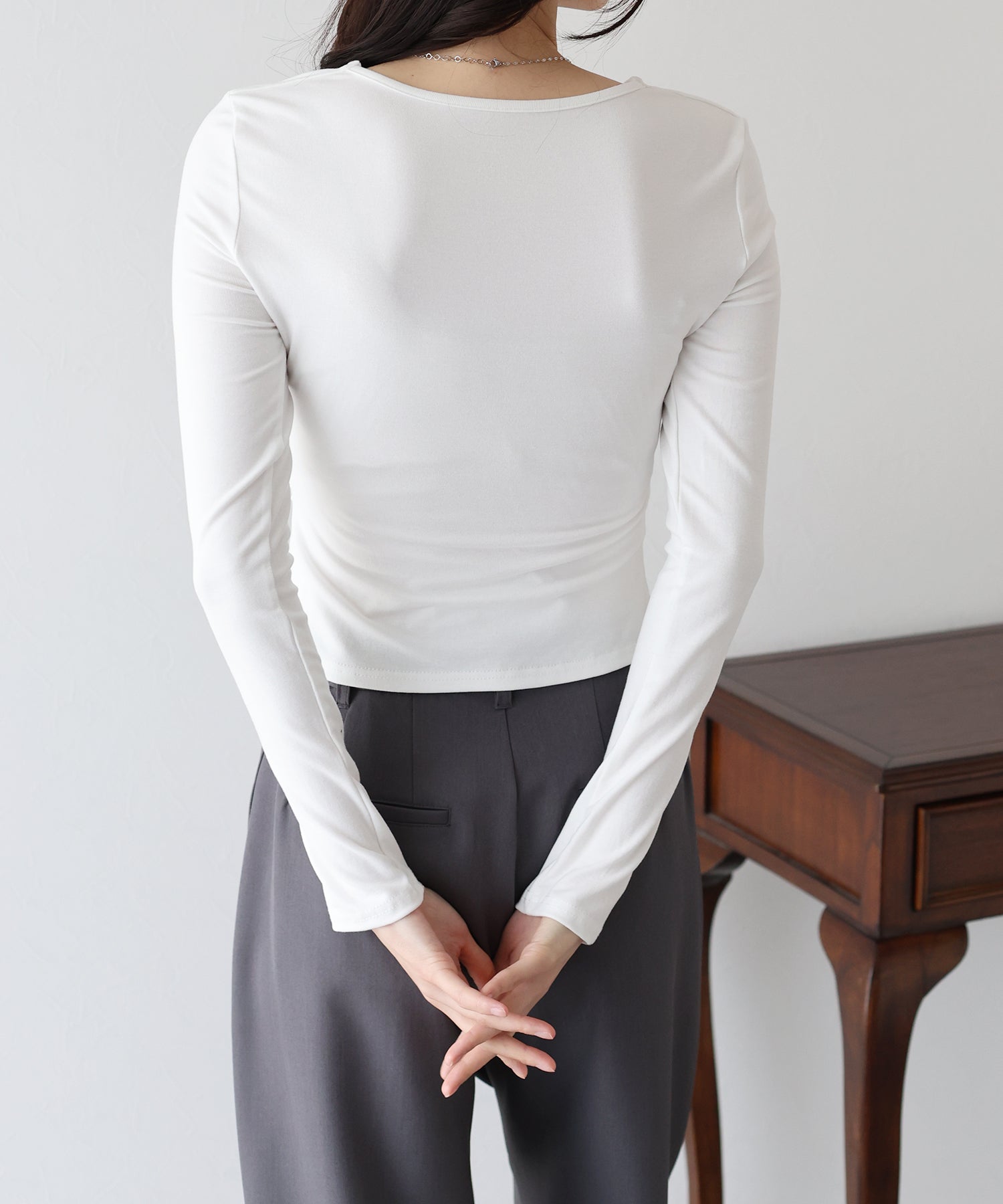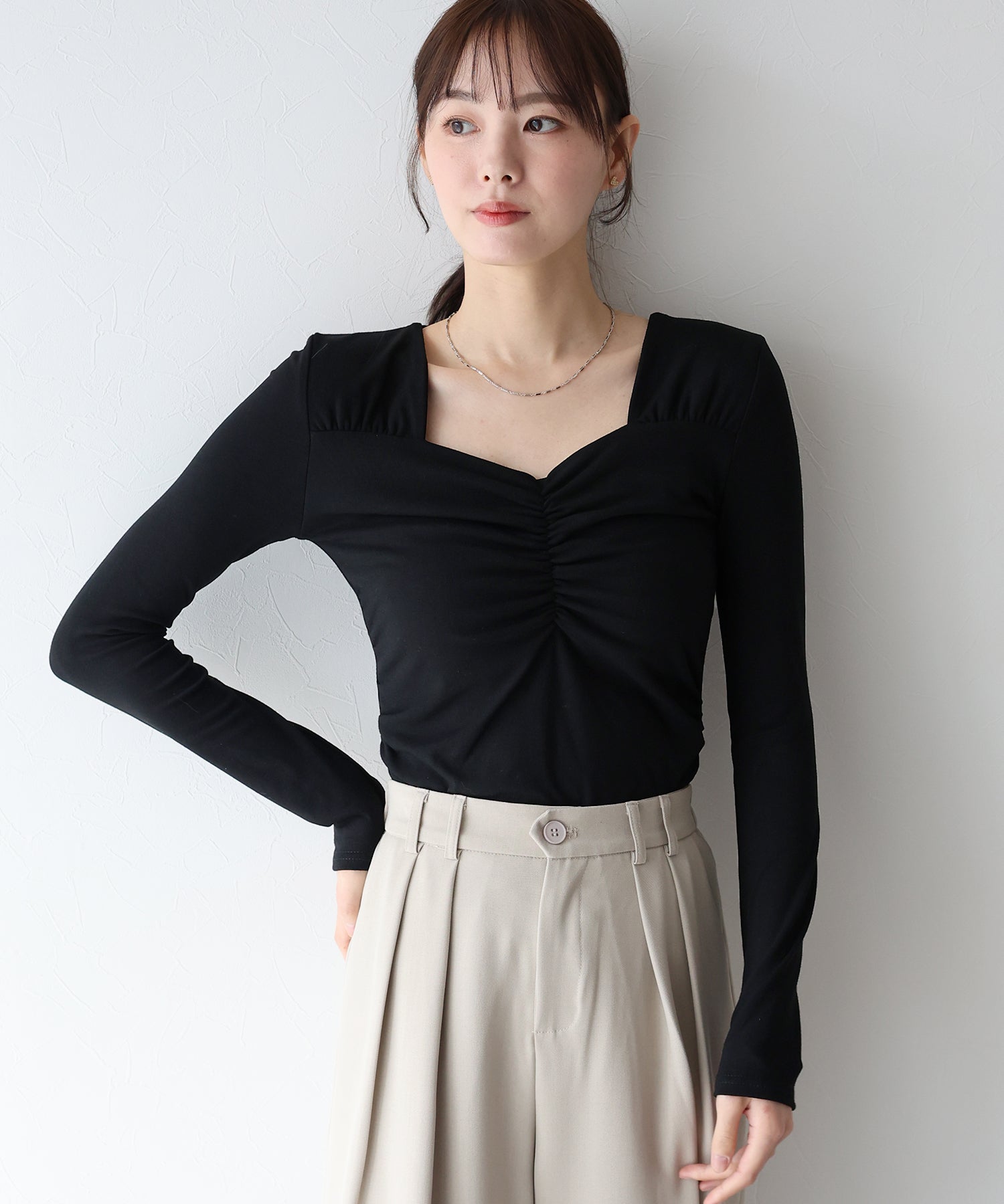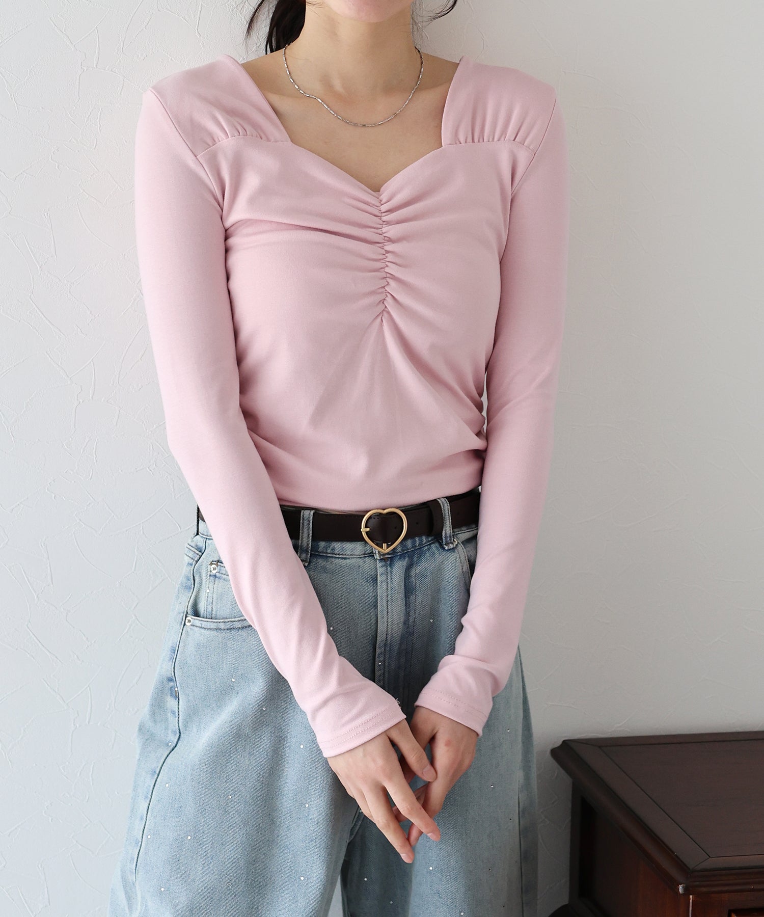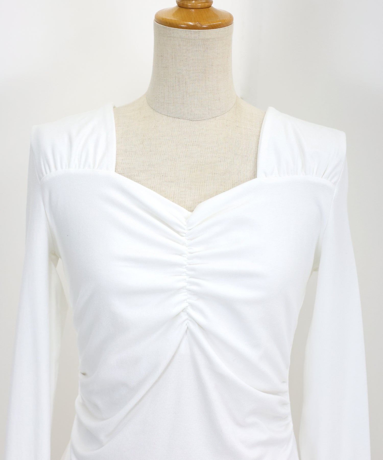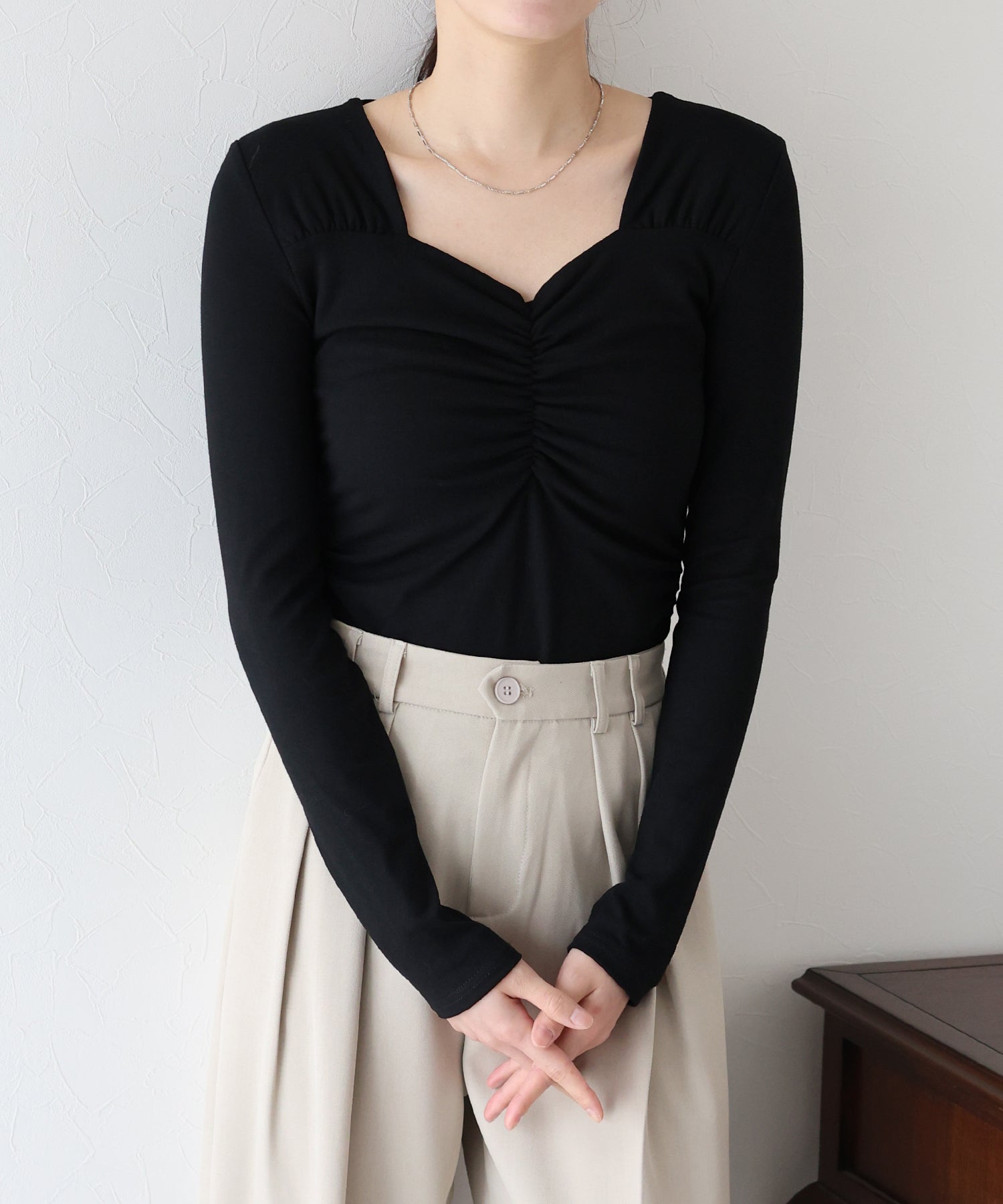 デコルテを美しく引き立てるハートネックが目を惹くカットソー。