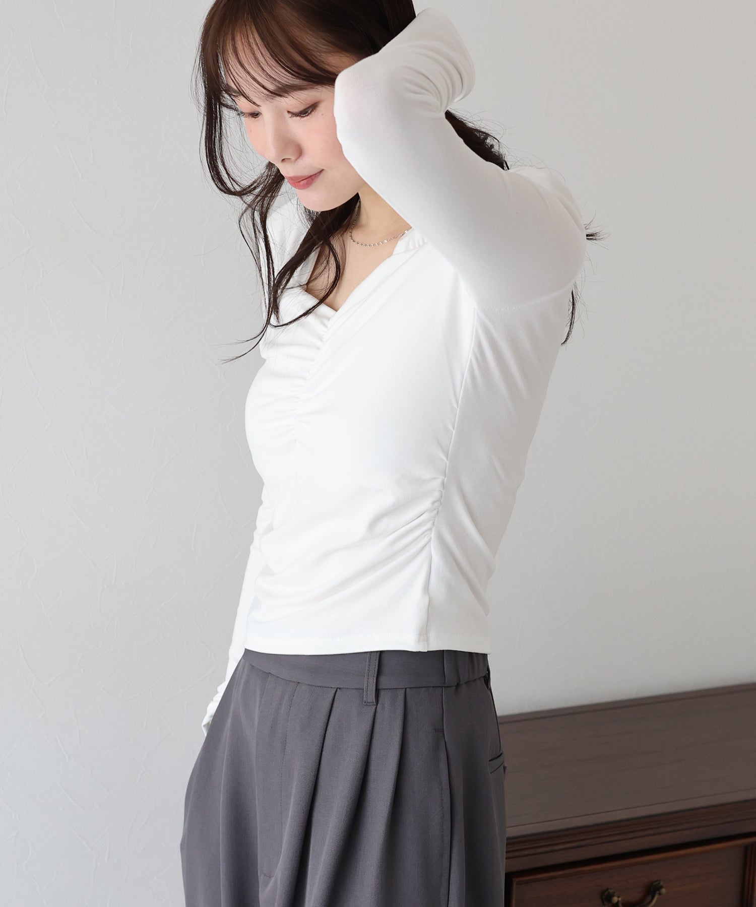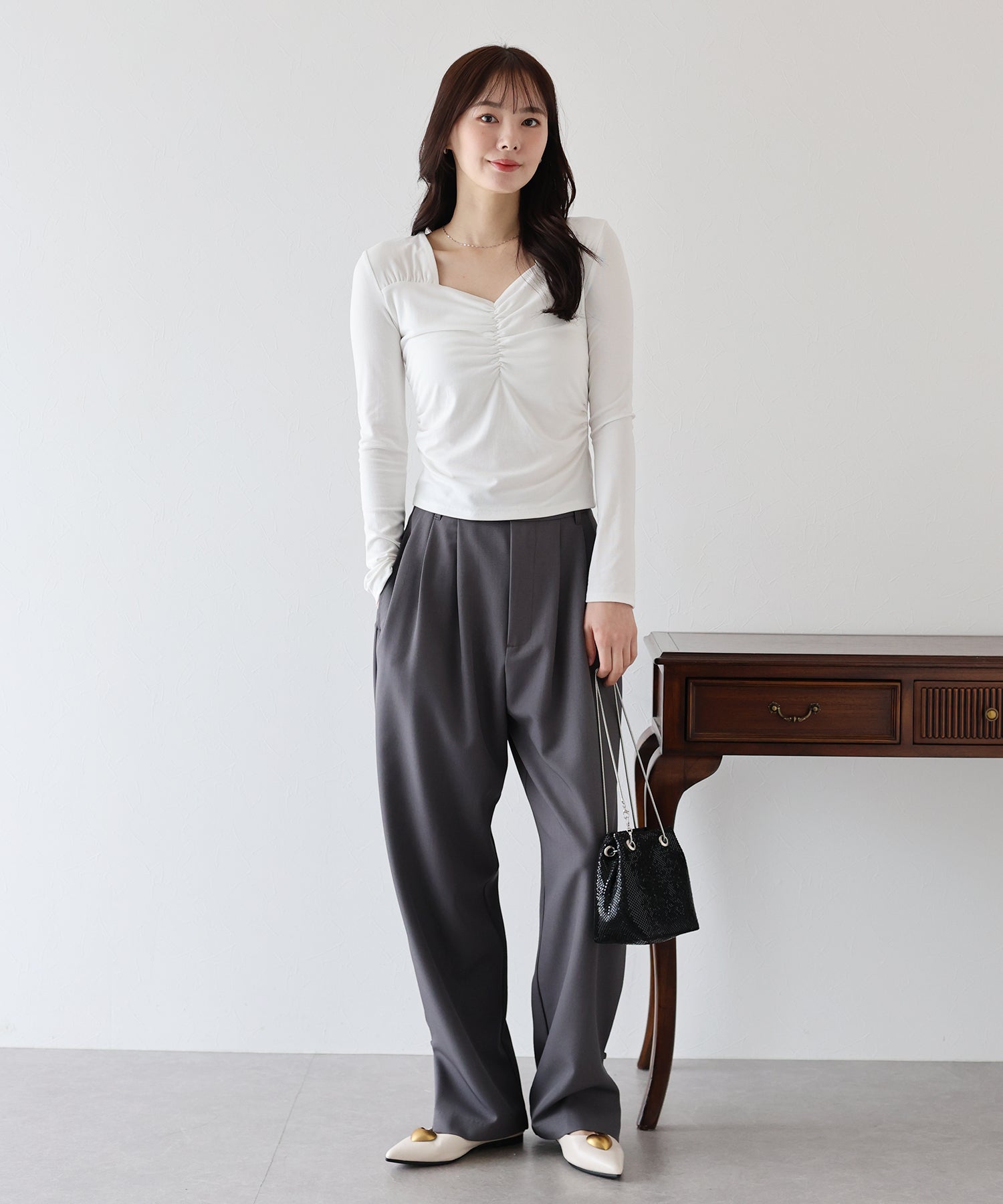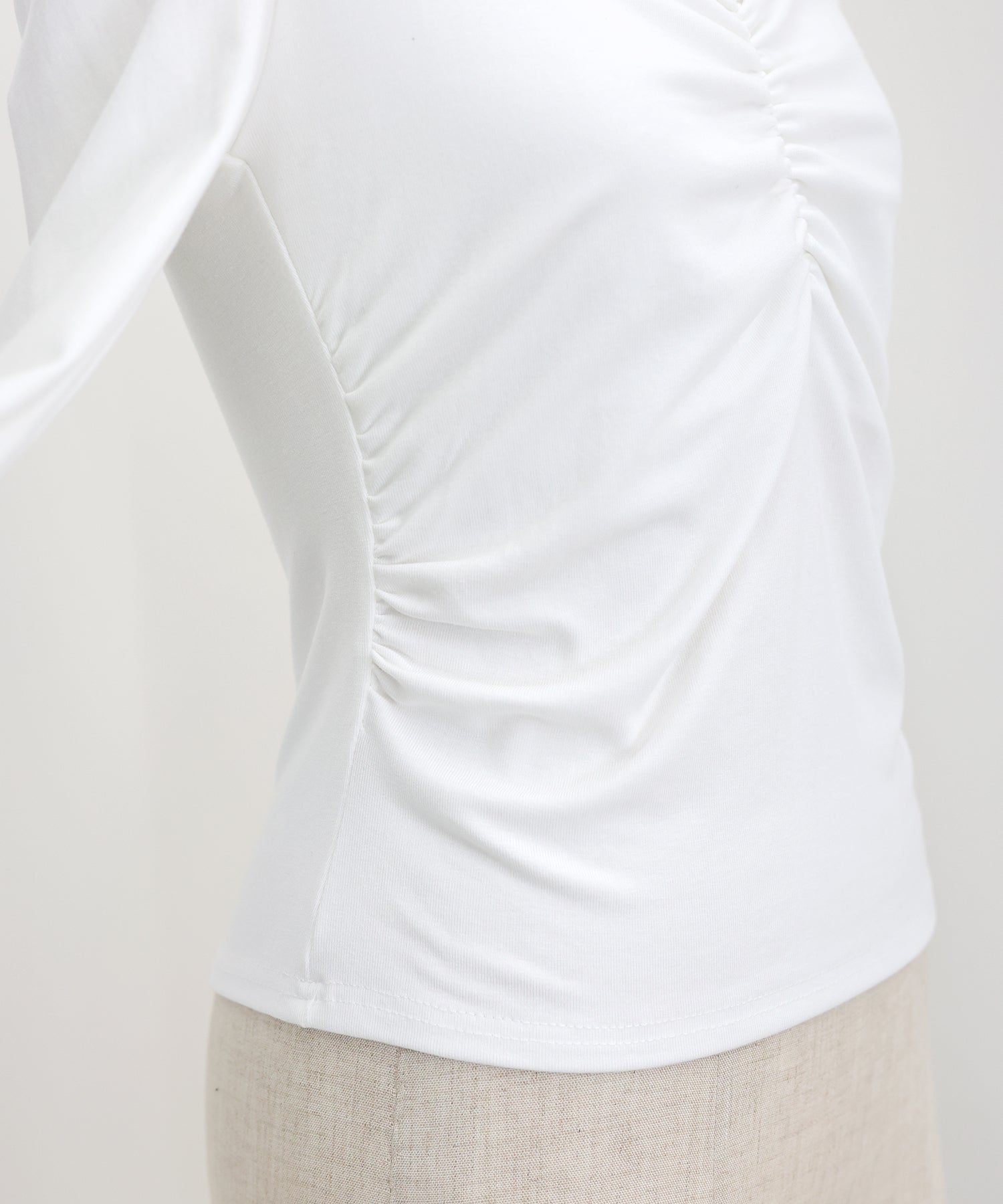 胸元のシャーリングでフェミニンなポイントをプラス。