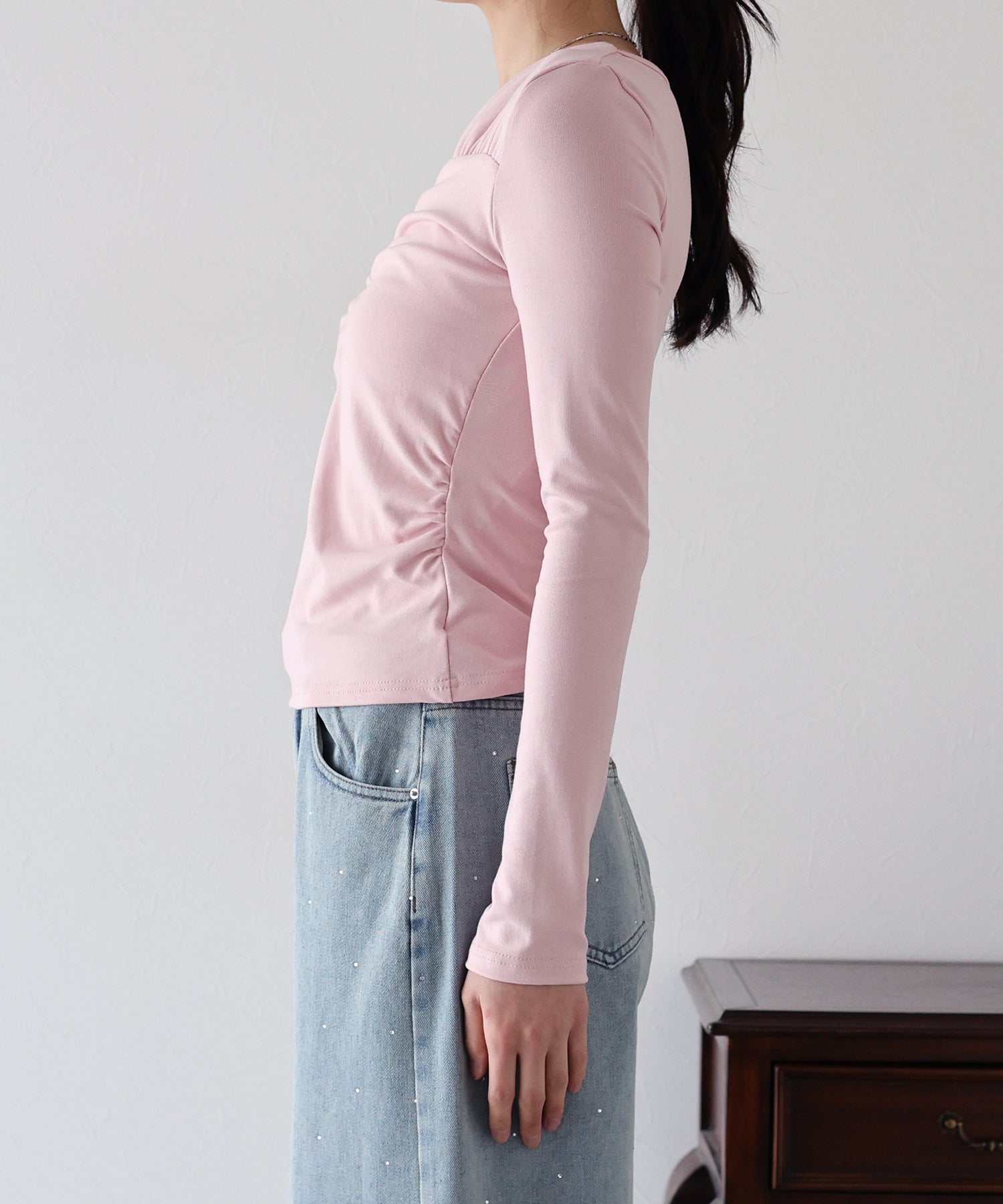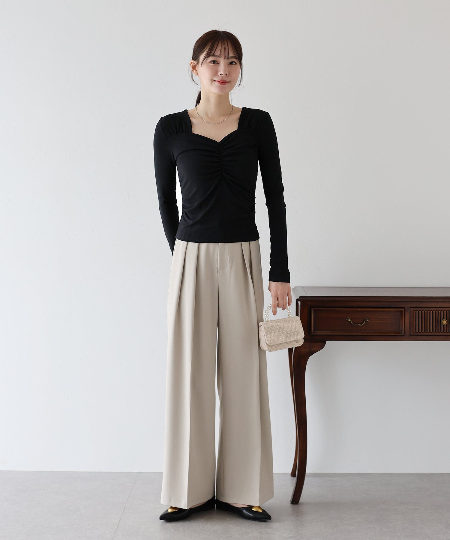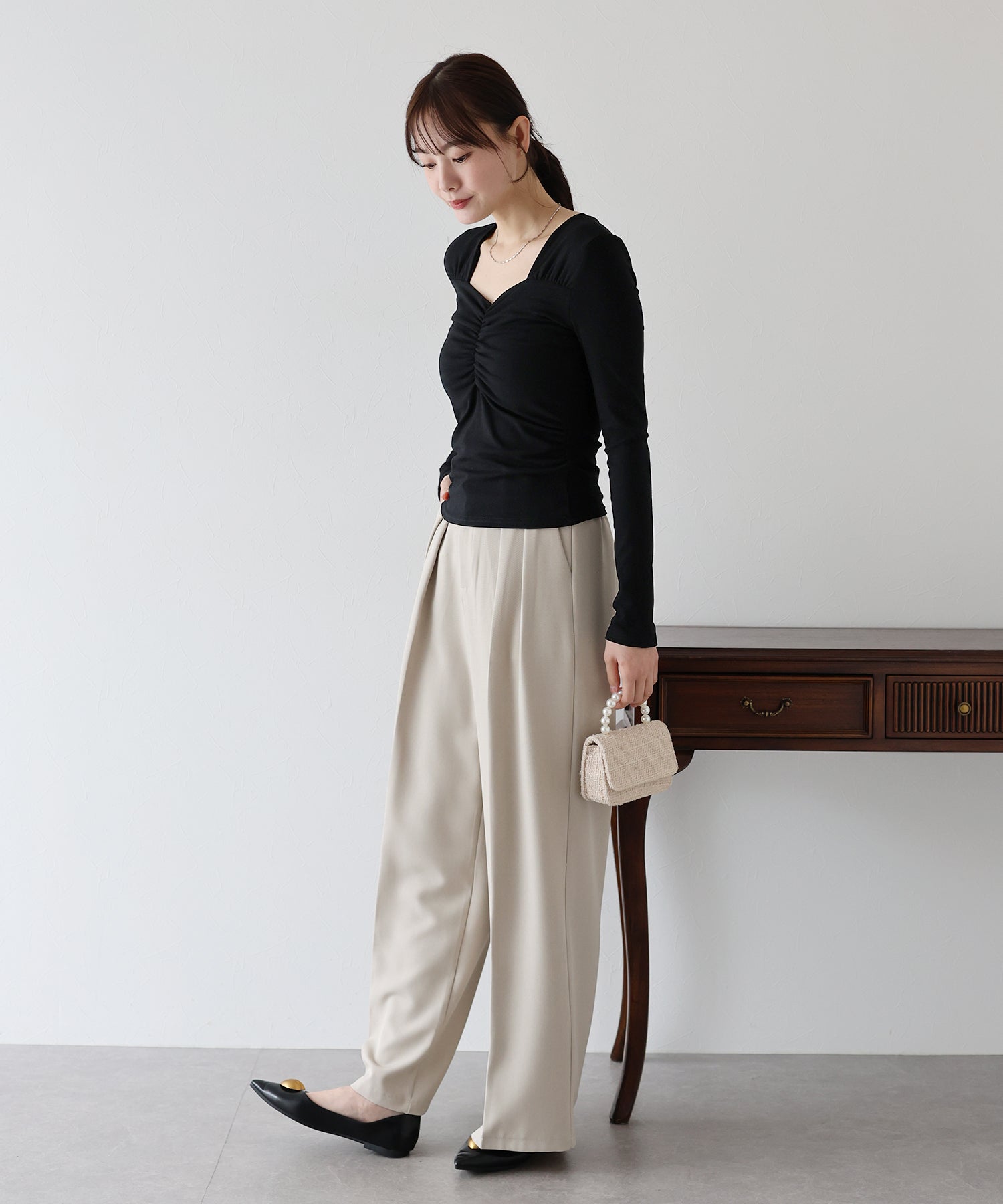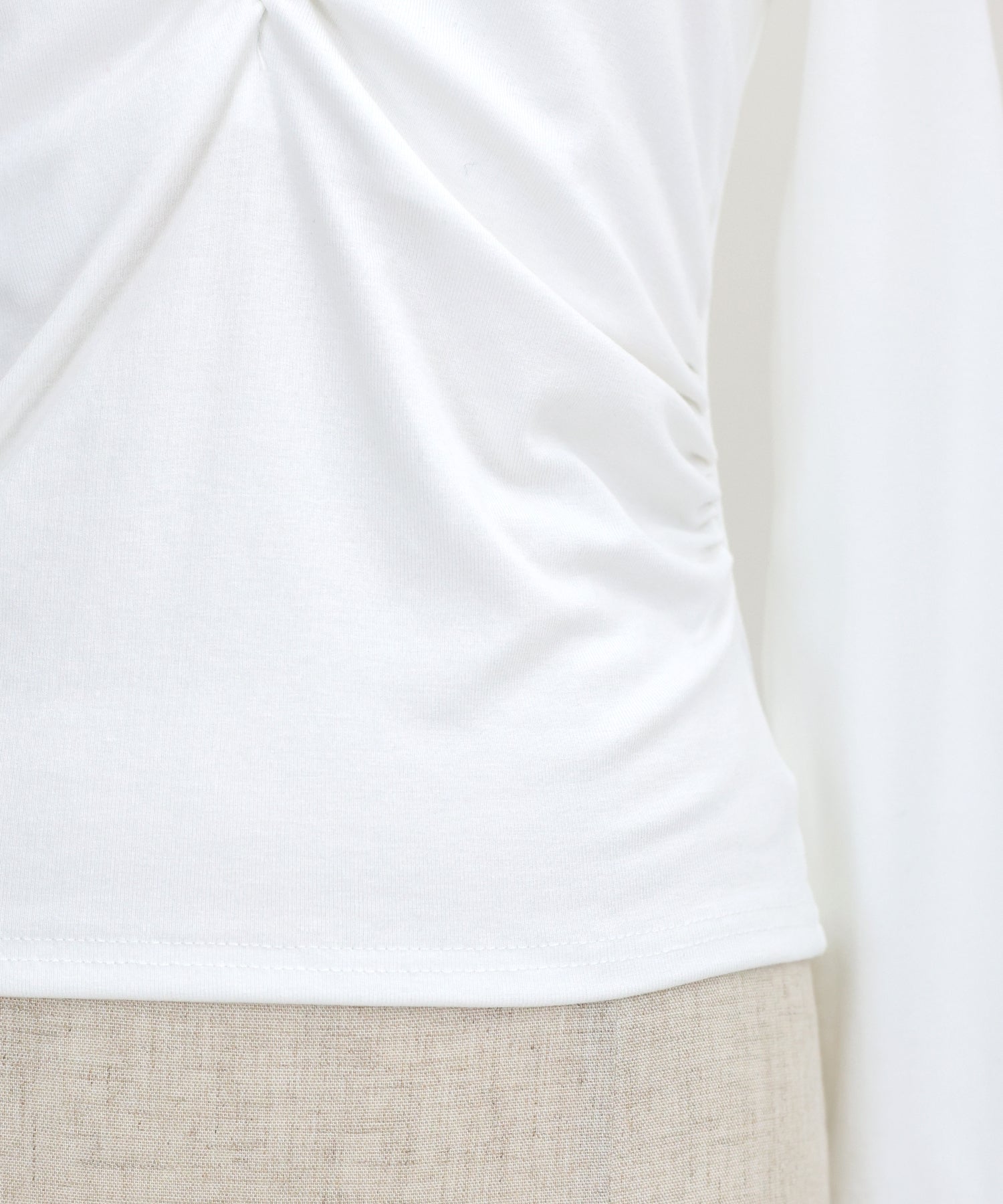 胸元のシャーリングでフェミニンなポイントをプラス。