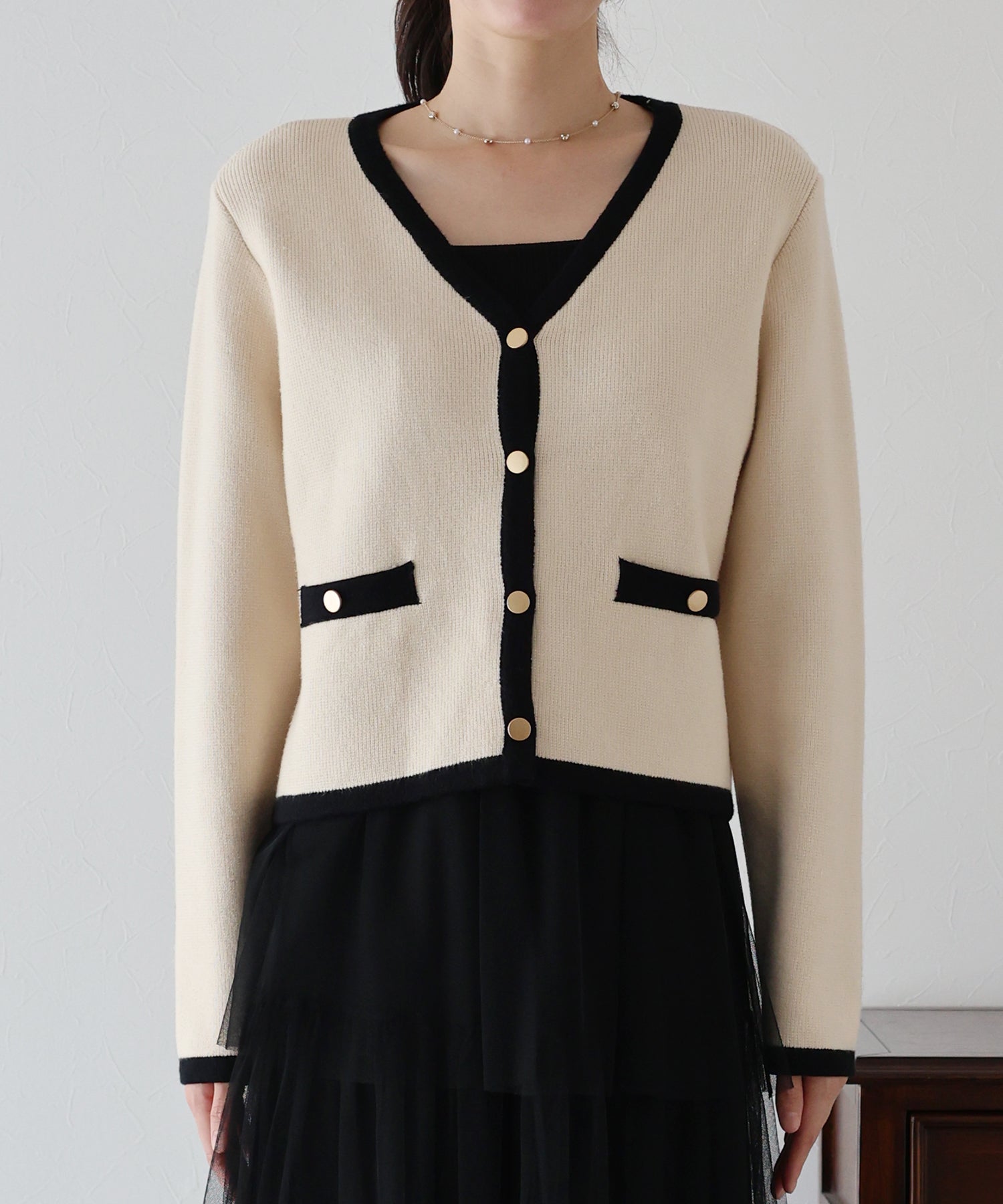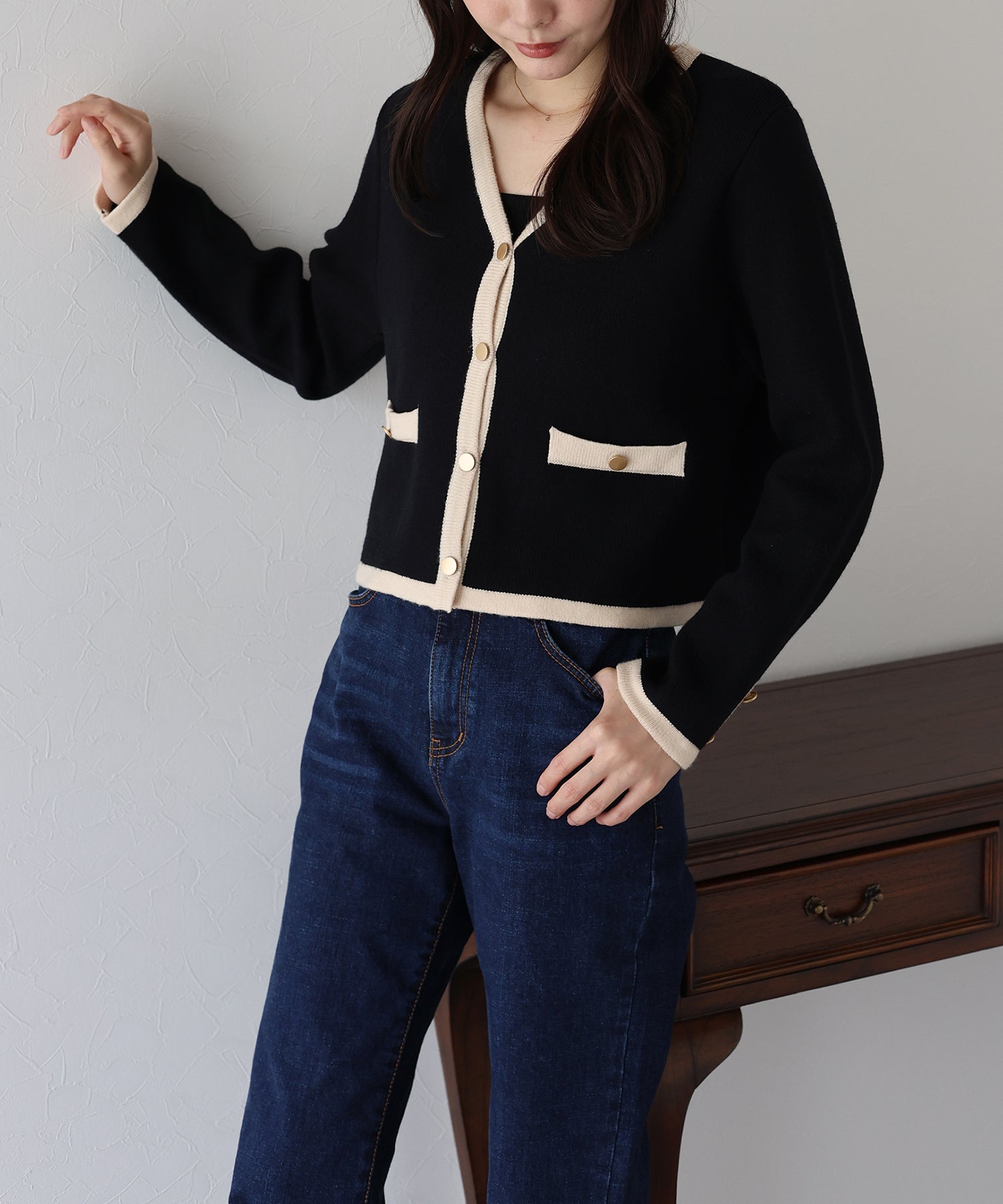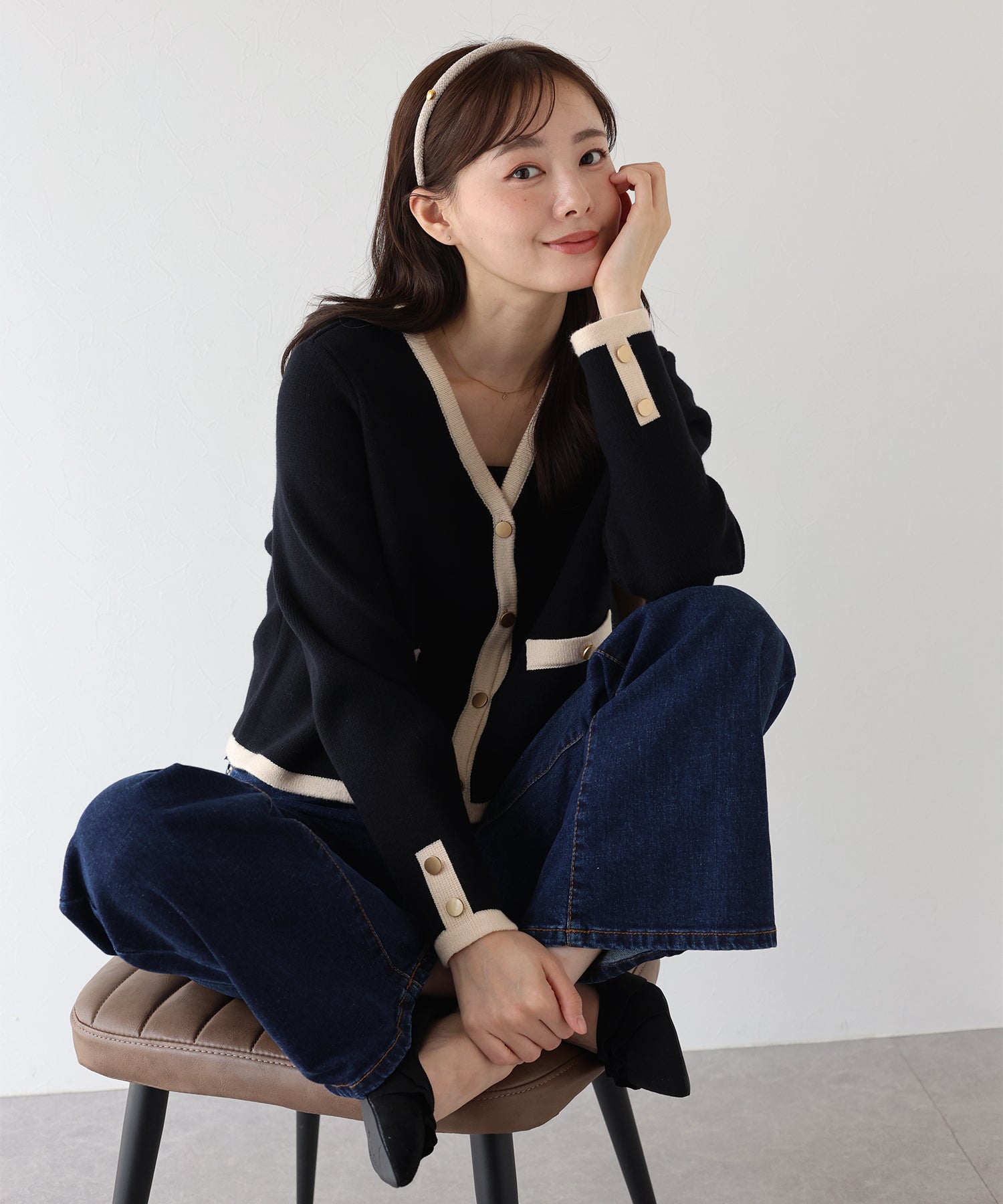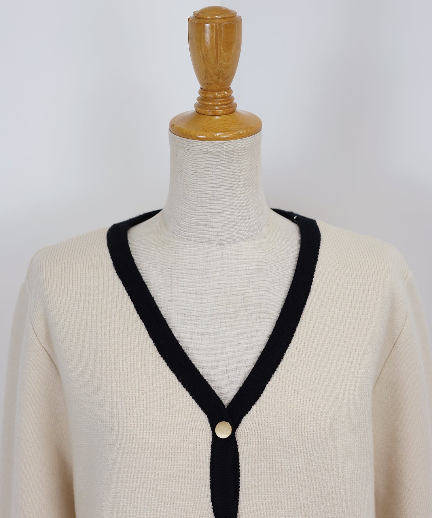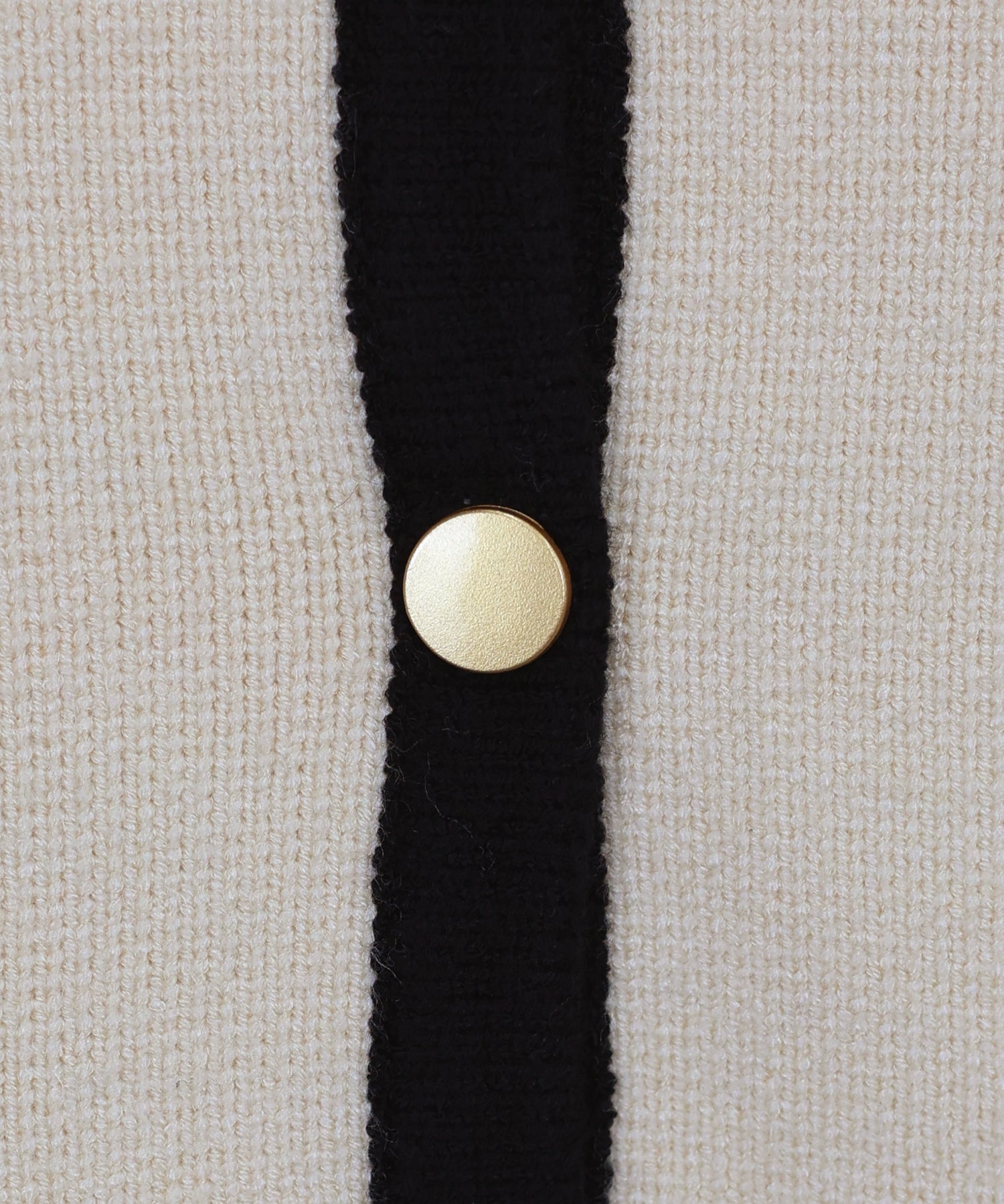 配色に金釦がアクセントになったVネックニットカーディガン。