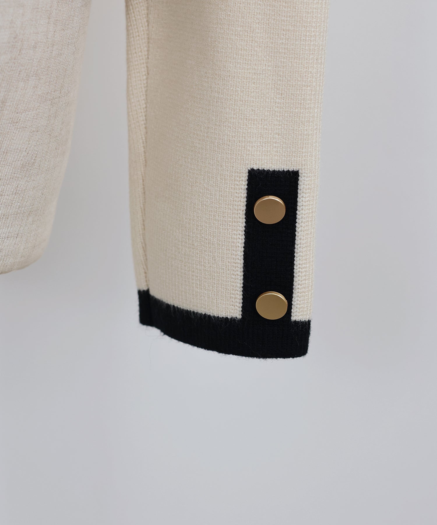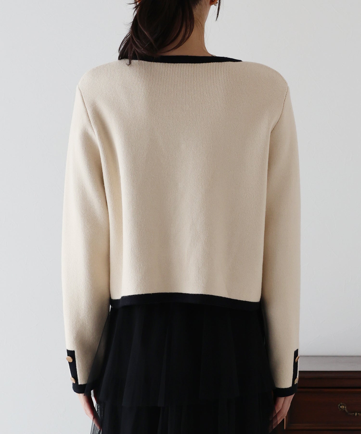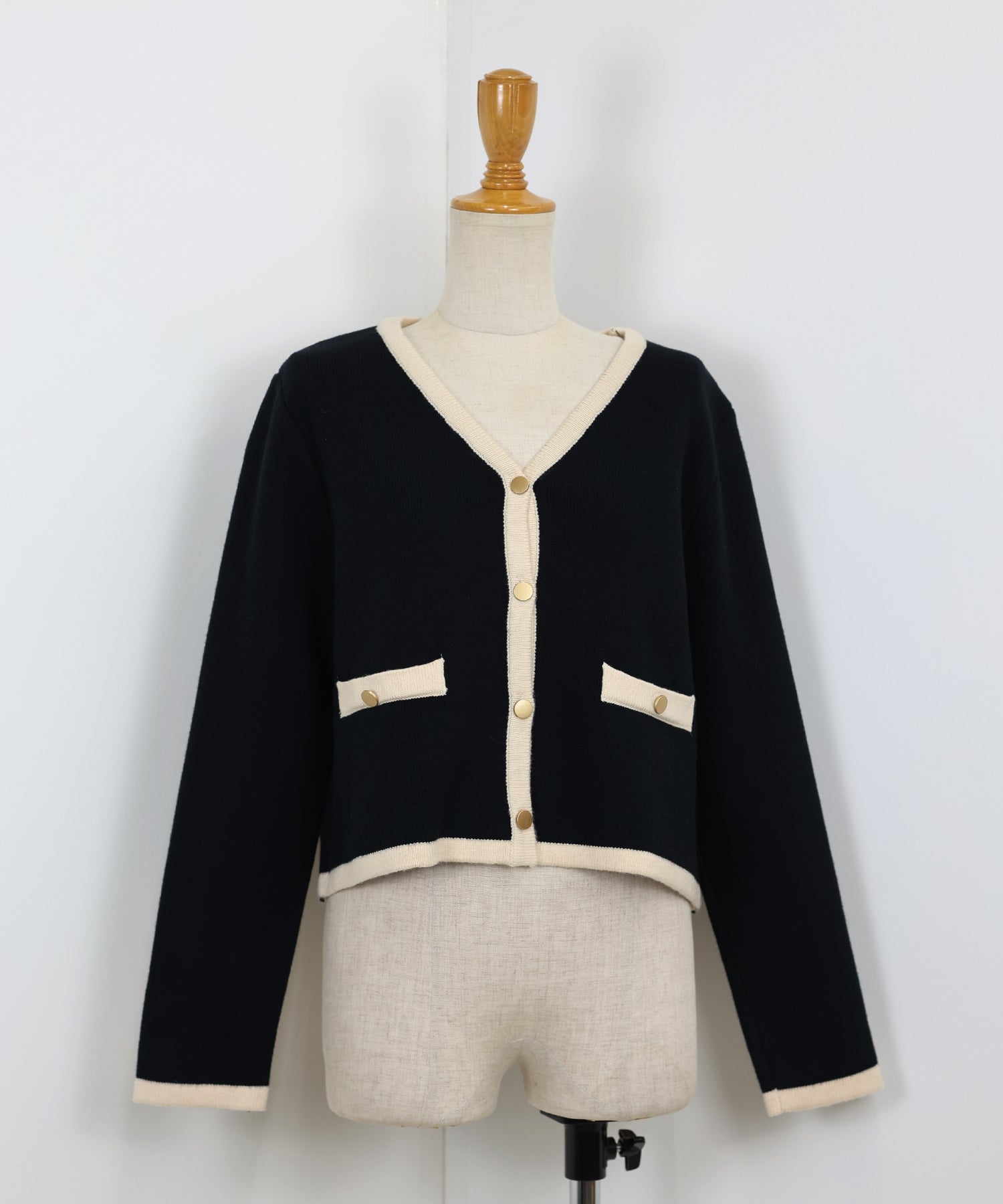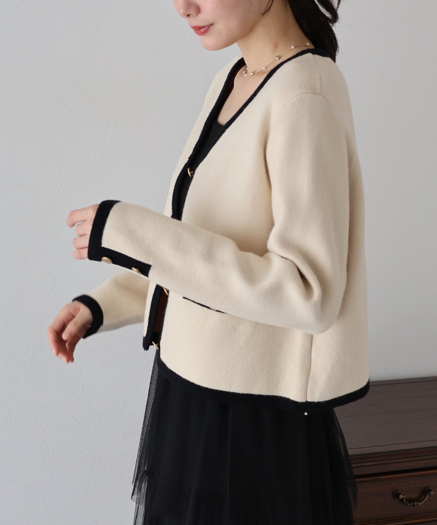 配色に金釦がアクセントになったVネックニットカーディガン。