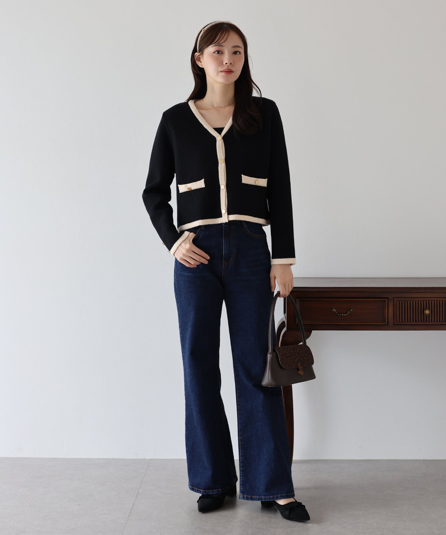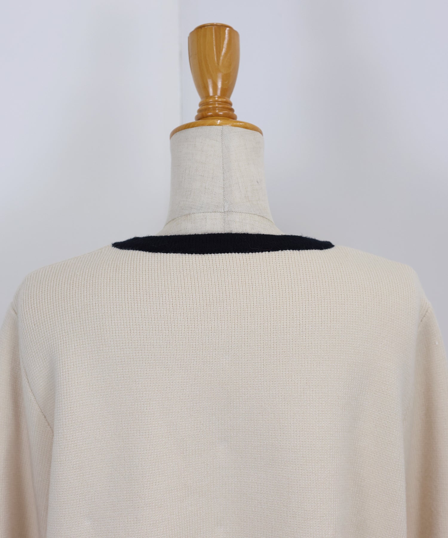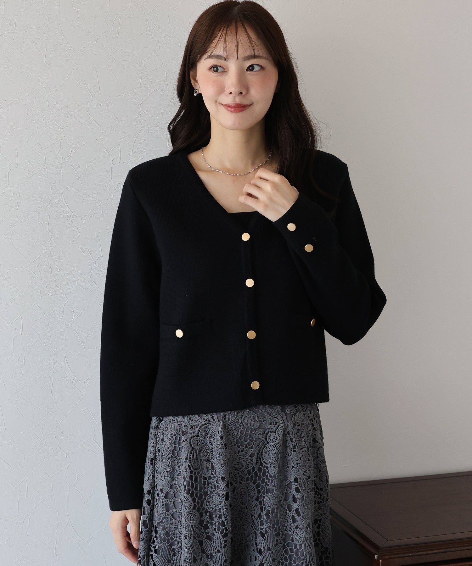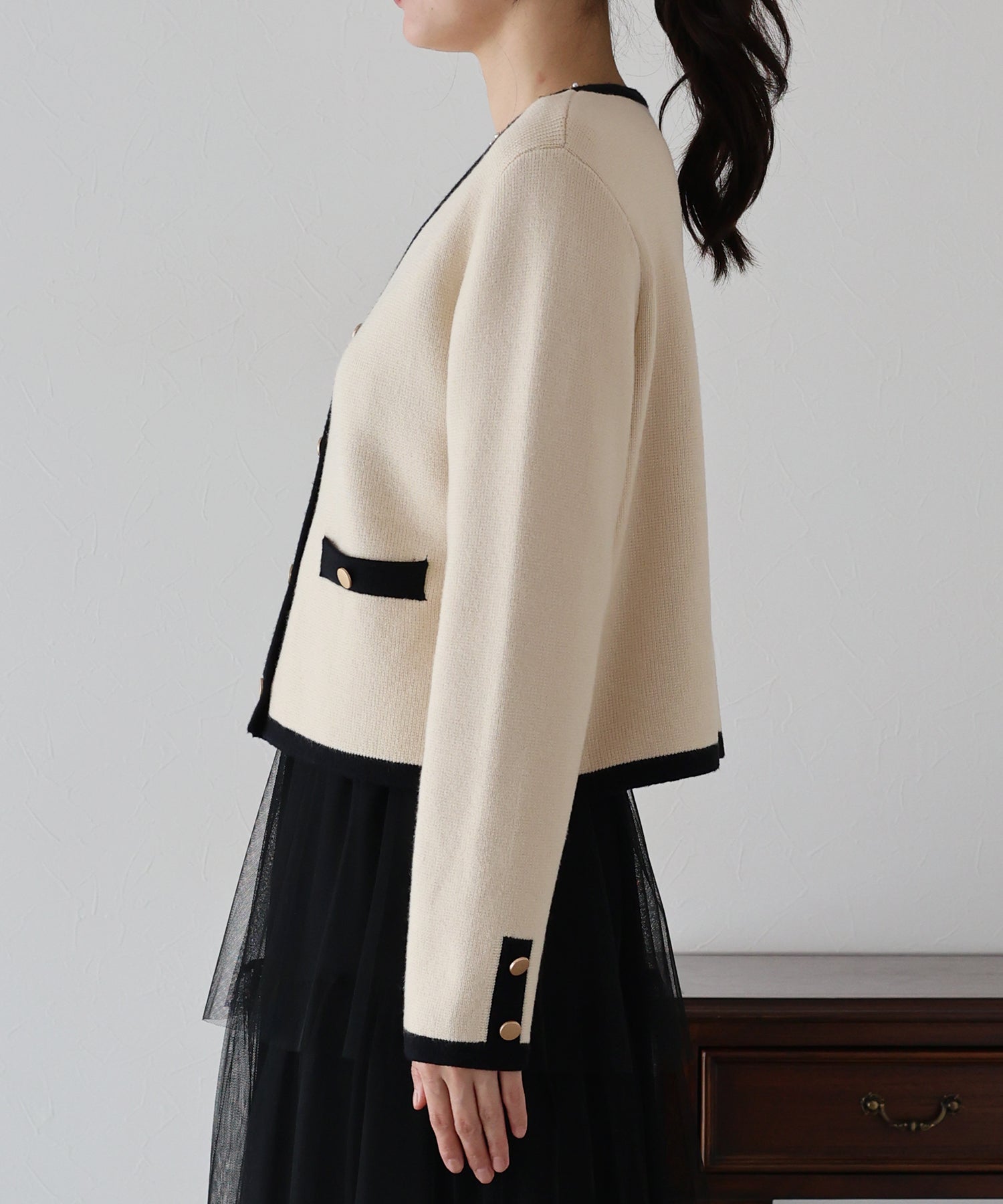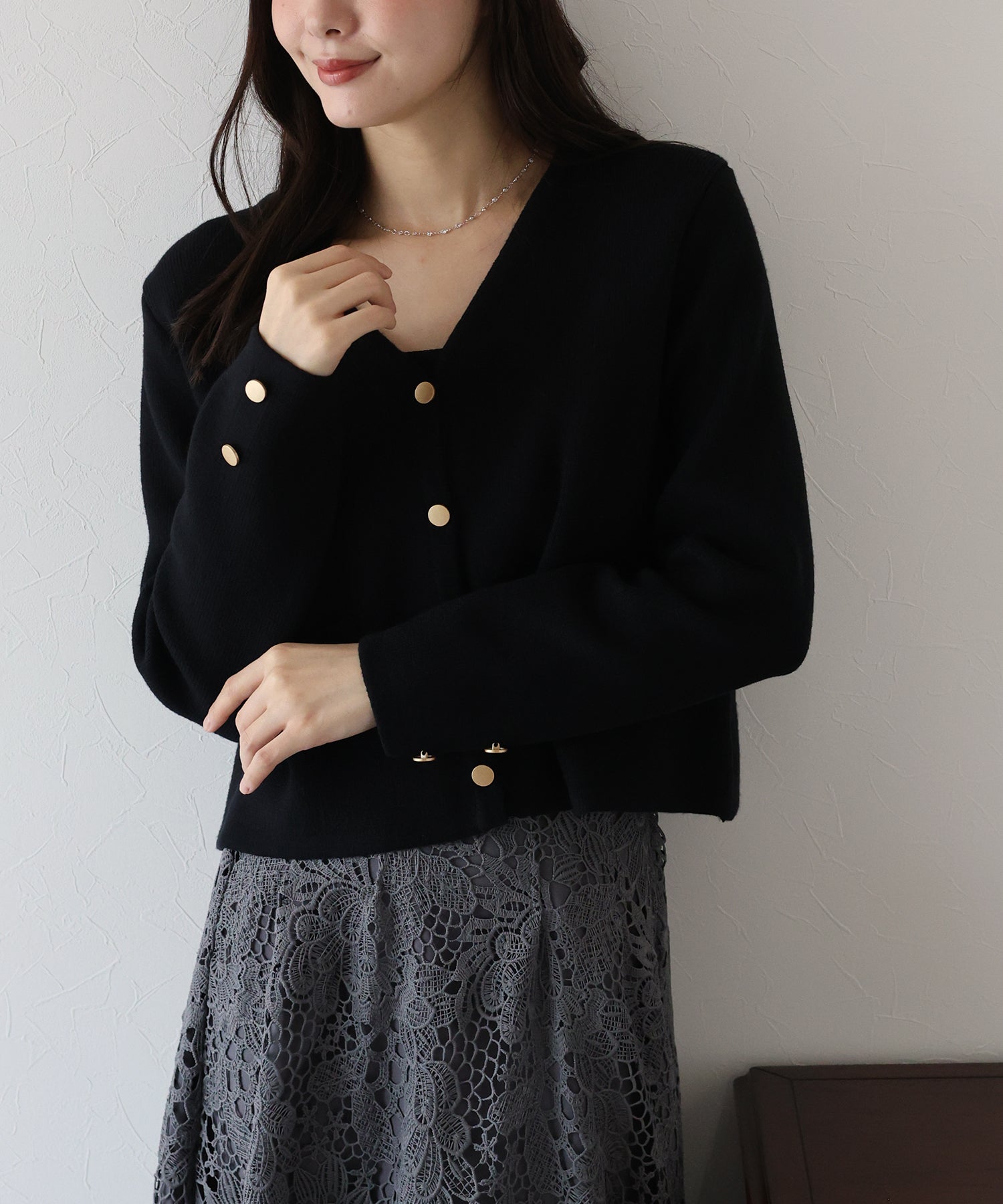 配色に金釦がアクセントになったVネックニットカーディガン。