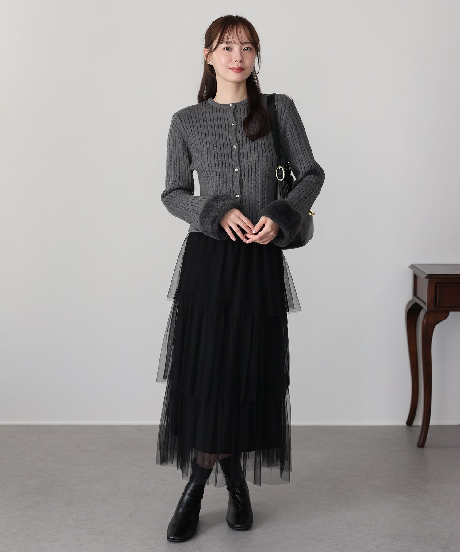 ケーブルニットのカーディガンに季節感のあるファーをあしらったトップス。