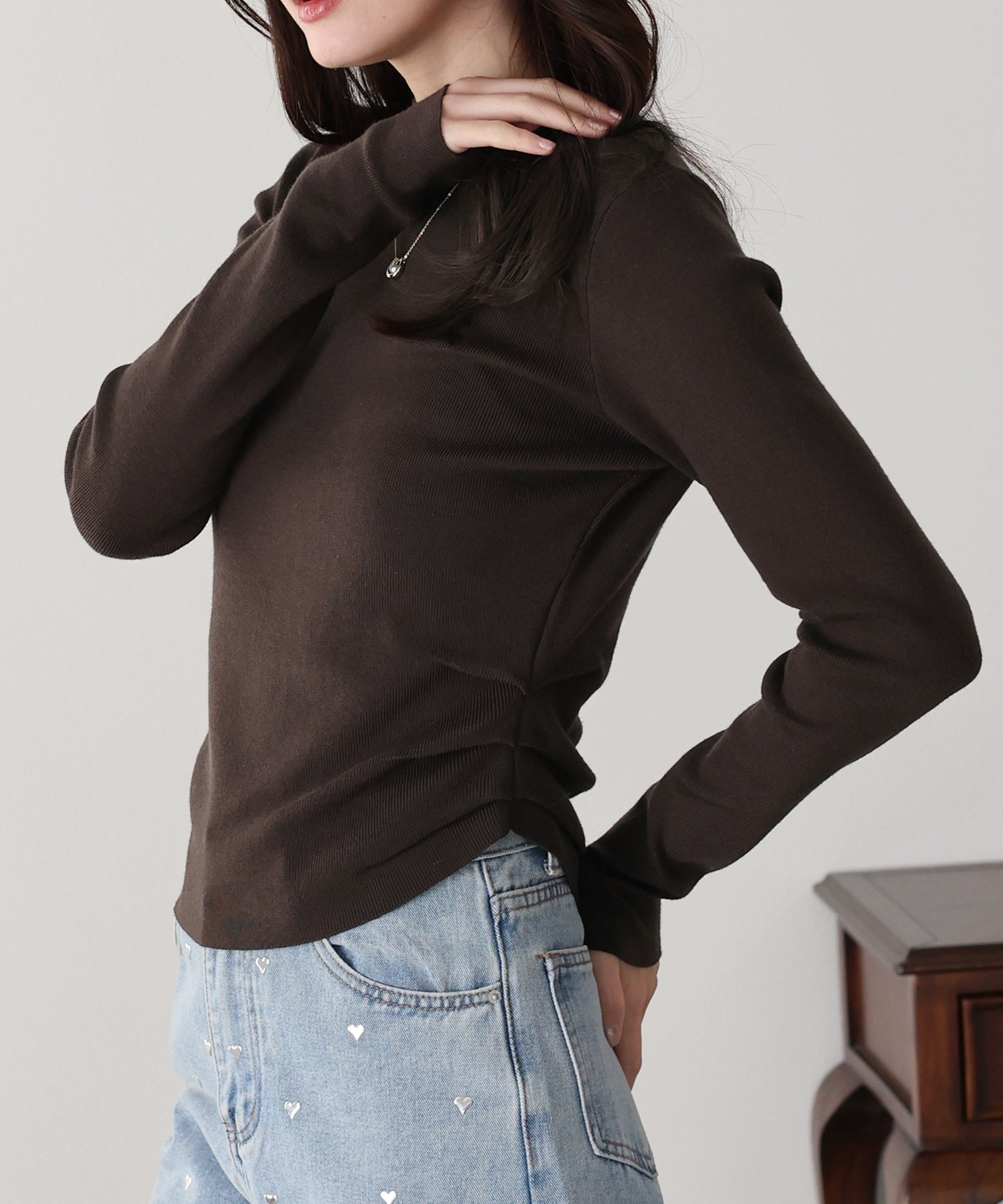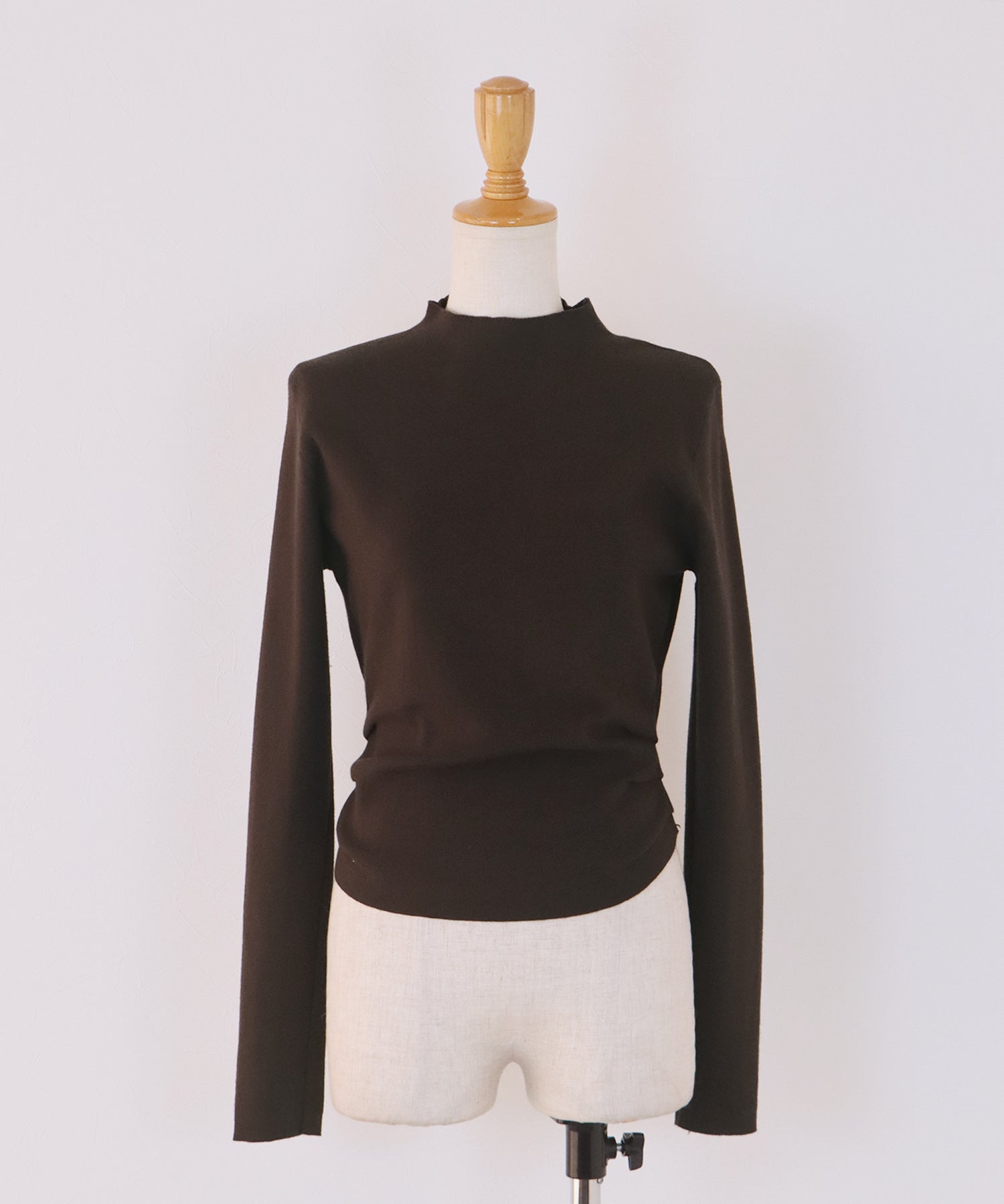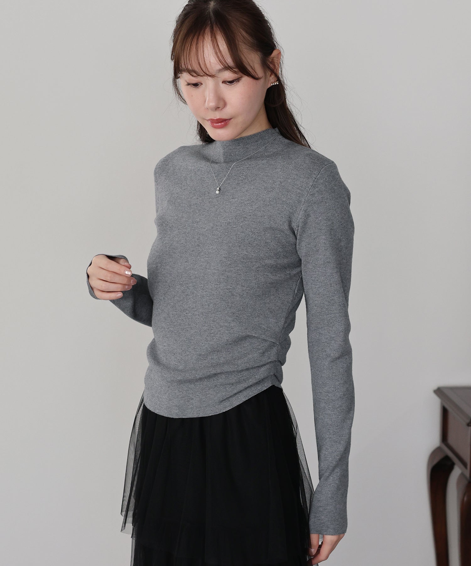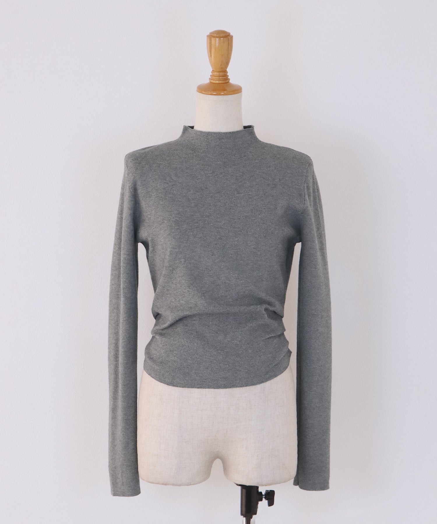 ハイネックとサイドタックが上品な印象のニットトップス。