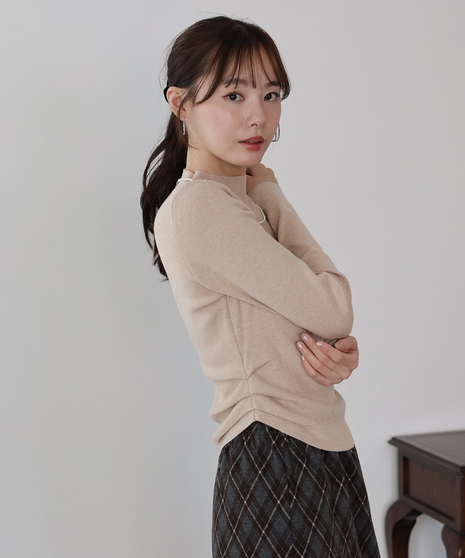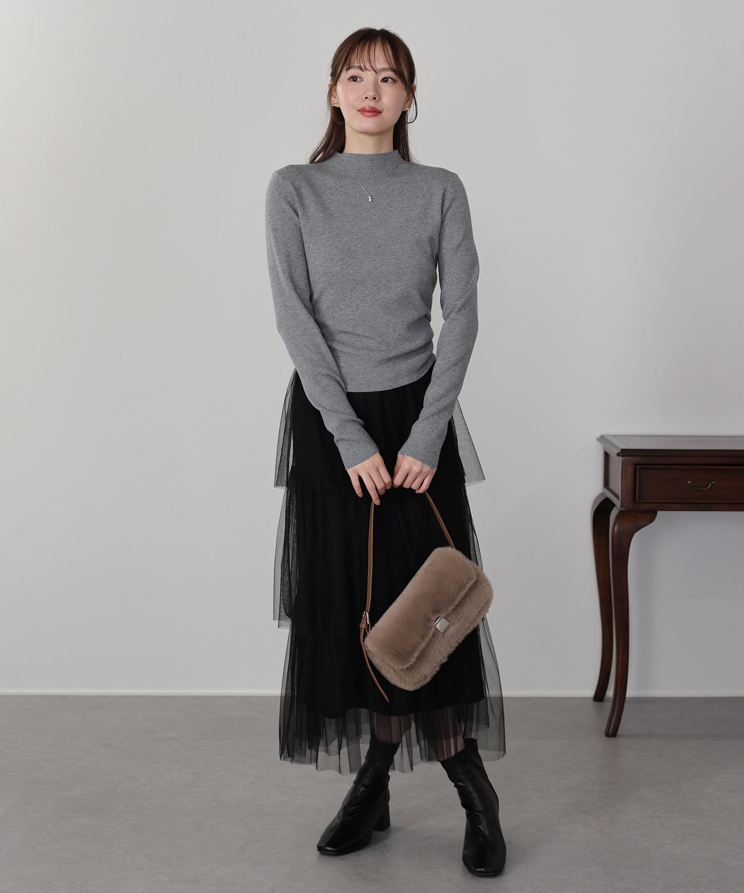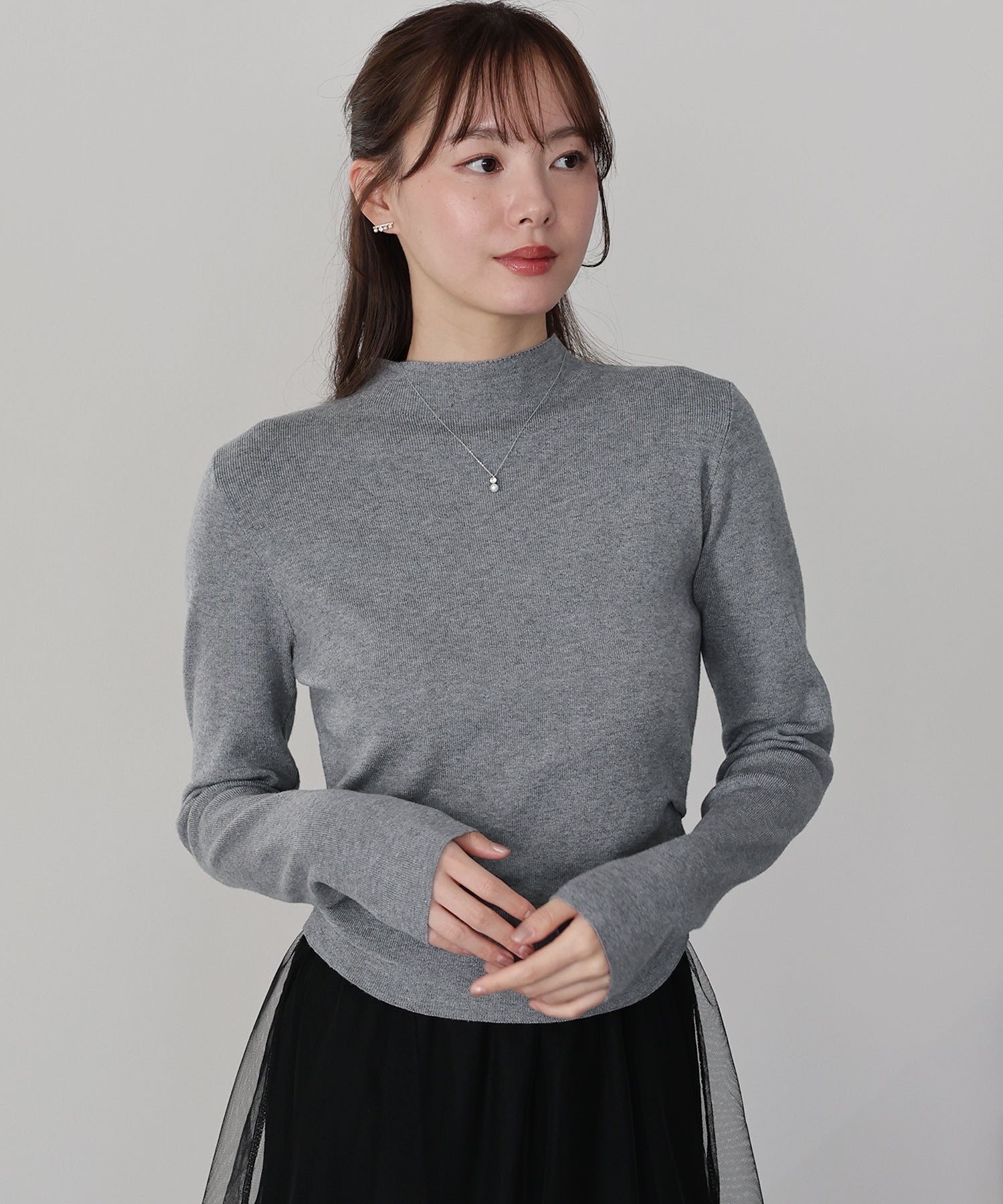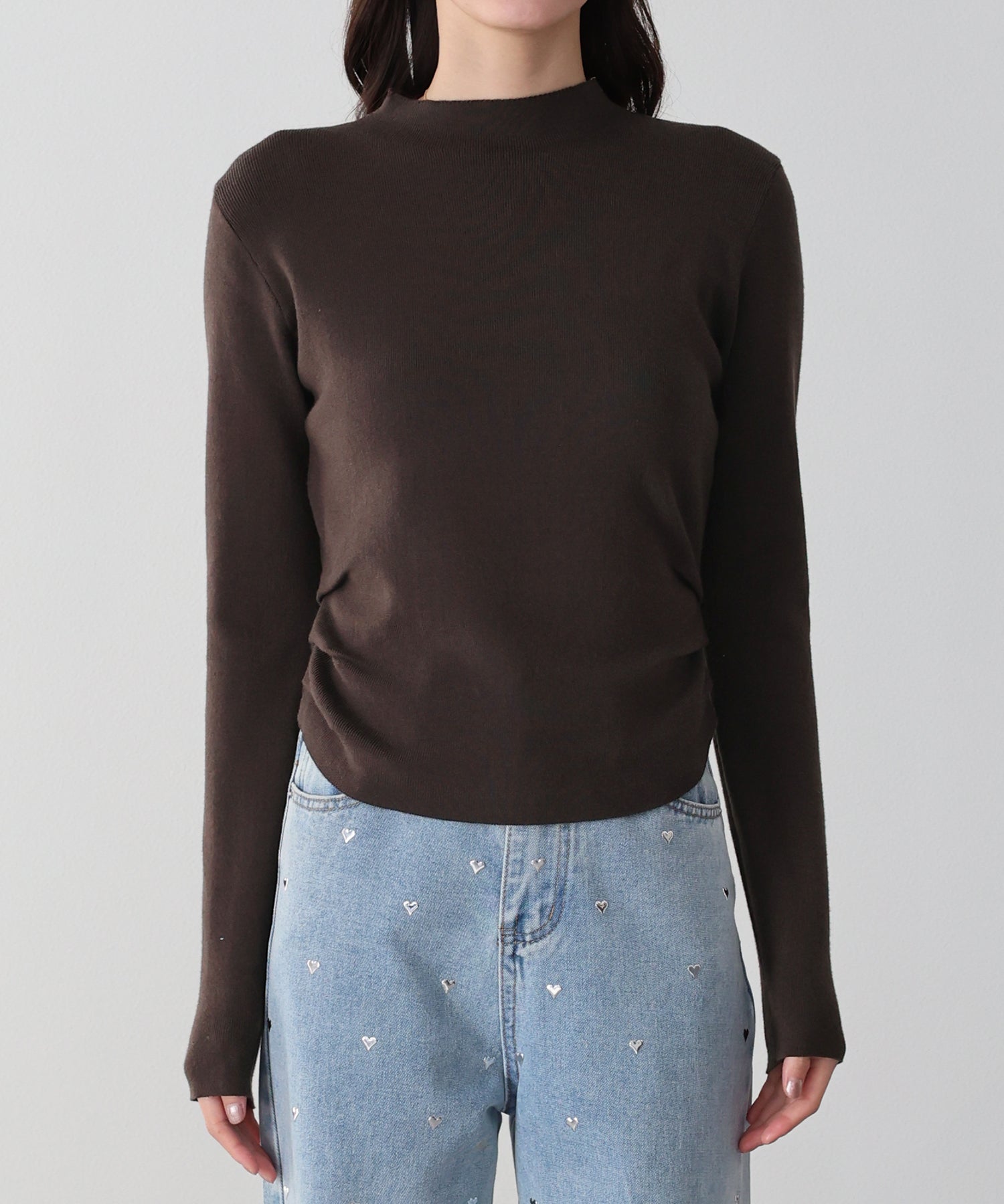 ハイネックとサイドタックが上品な印象のニットトップス。
