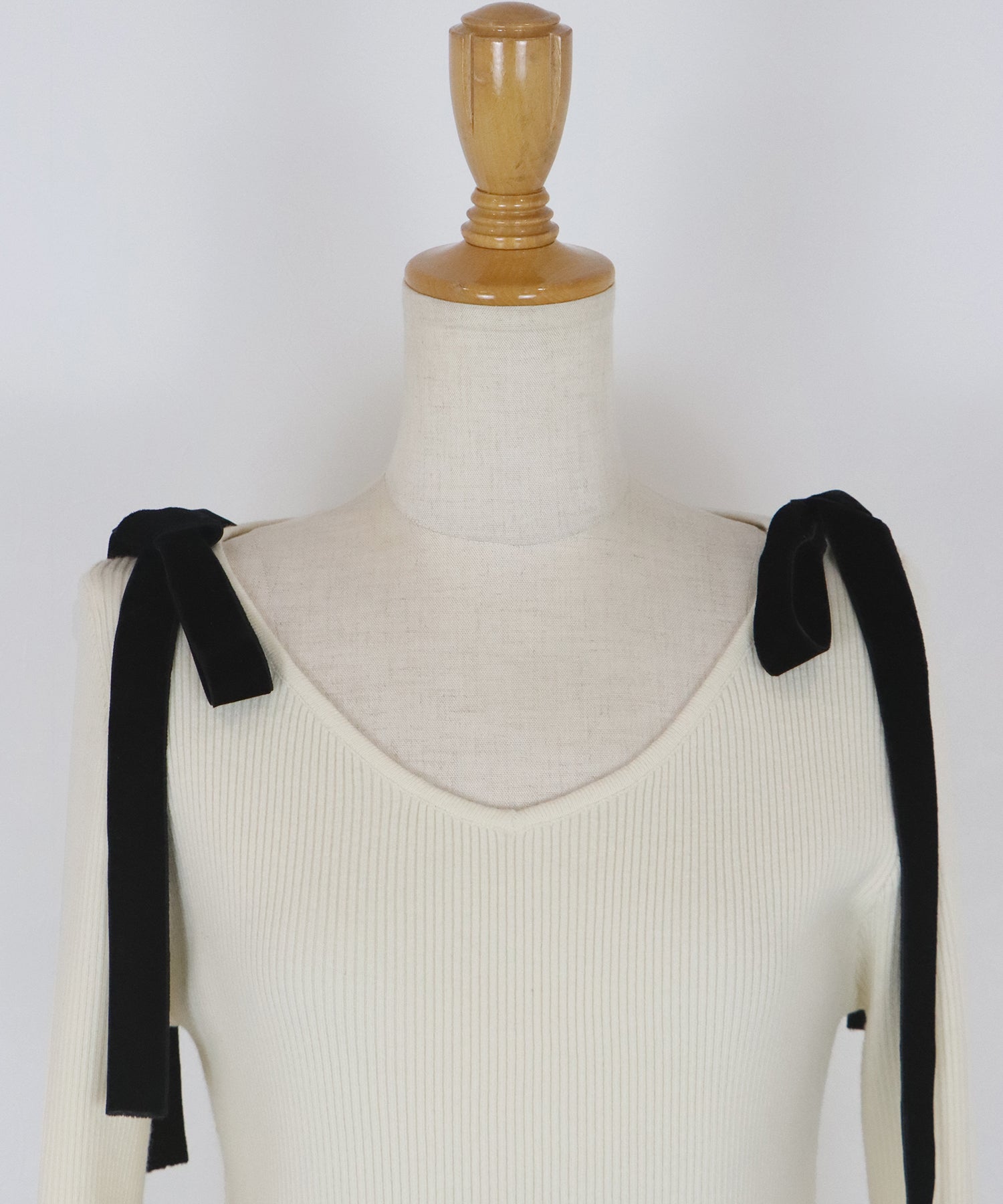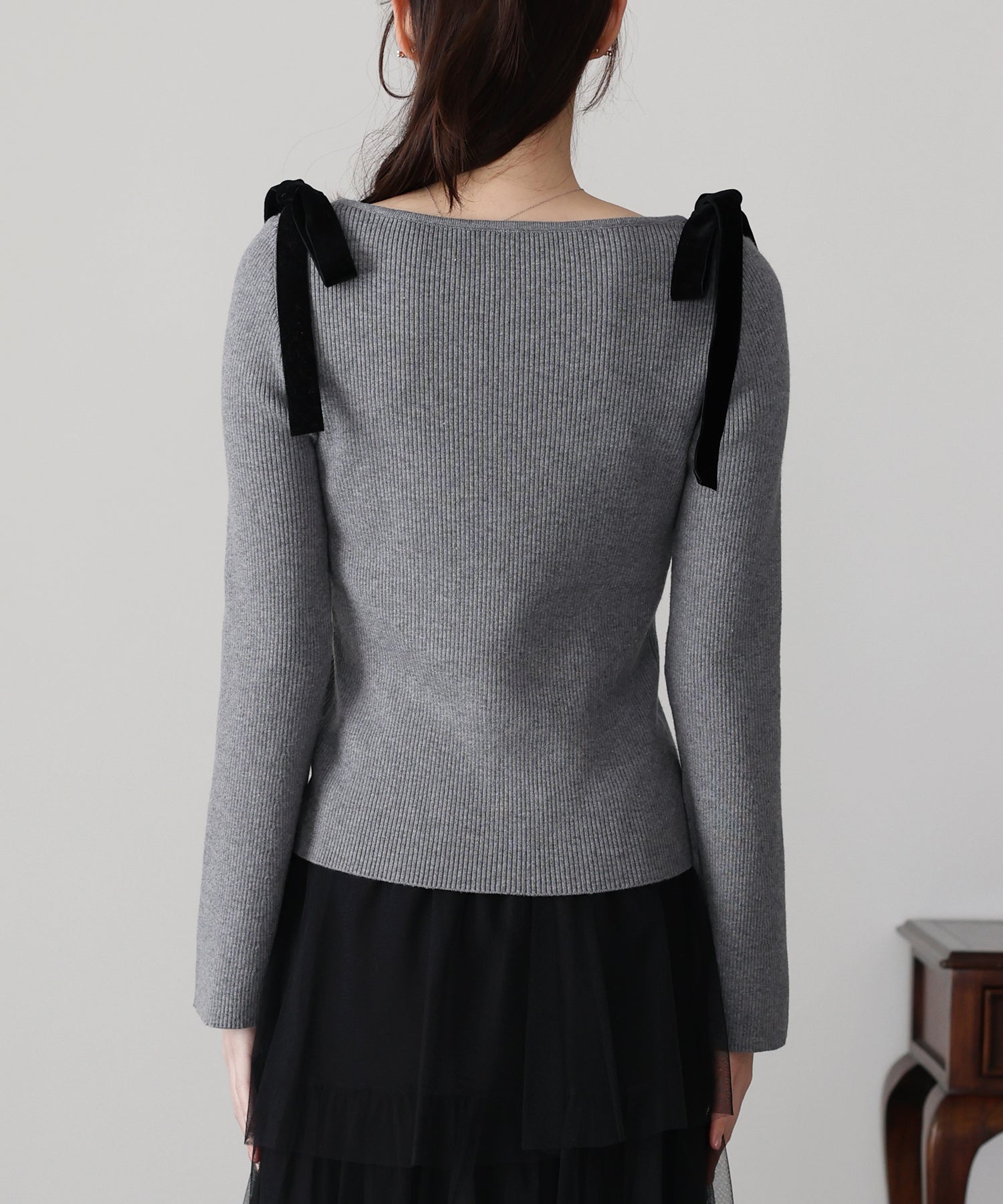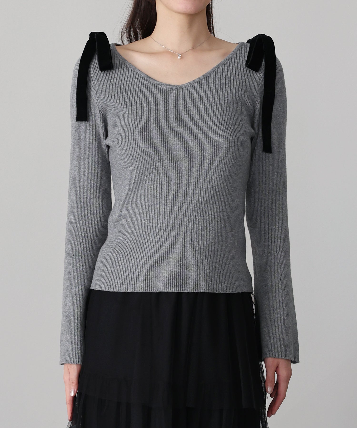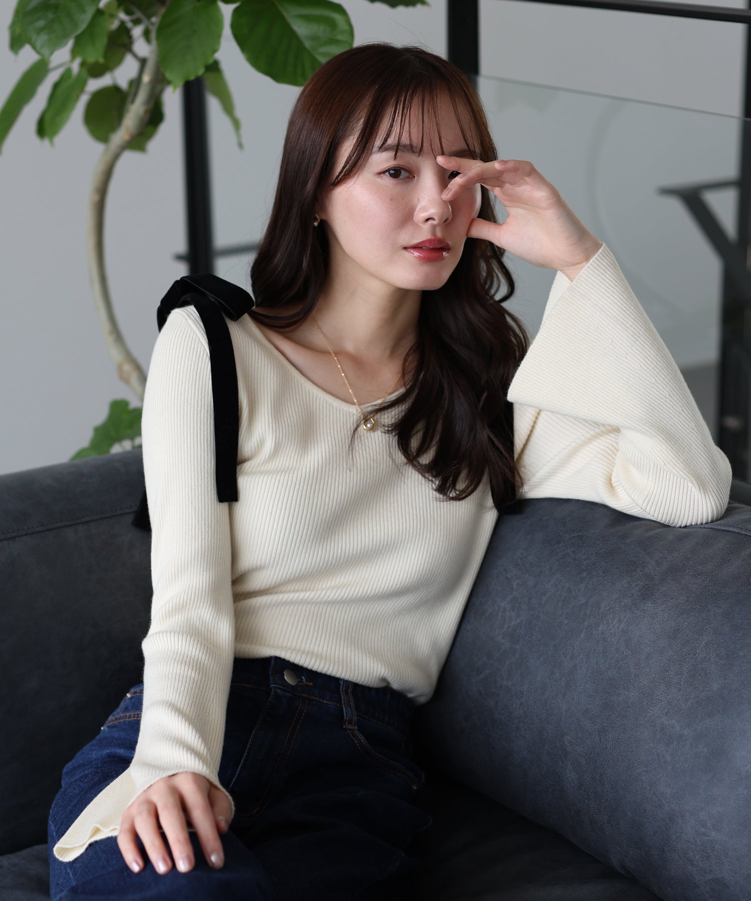 両肩にあしらったベロアリボンが大人かわいい雰囲気のフェミニンなニット。