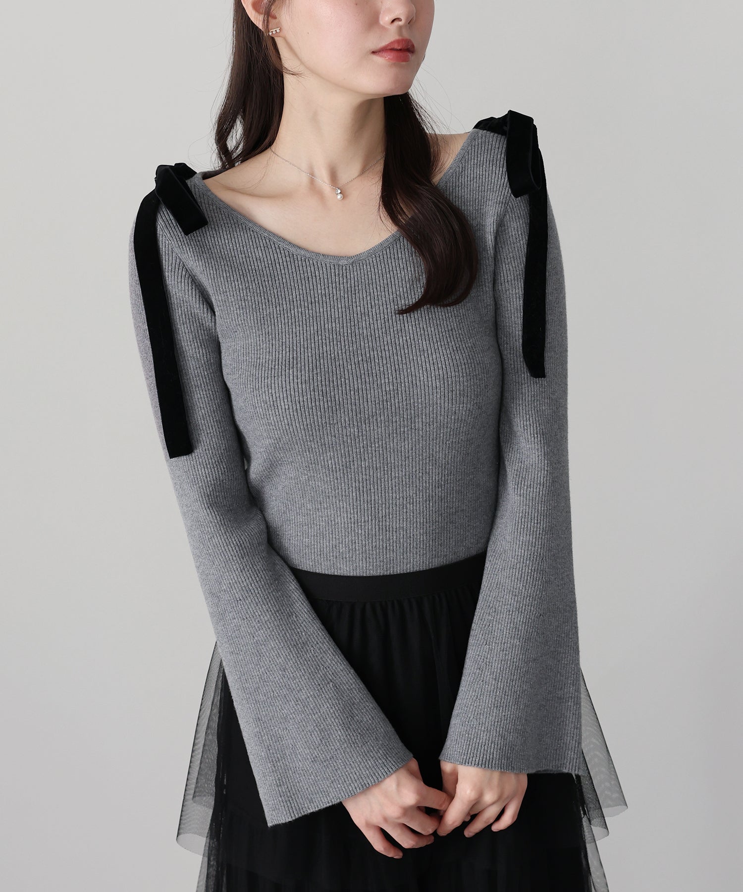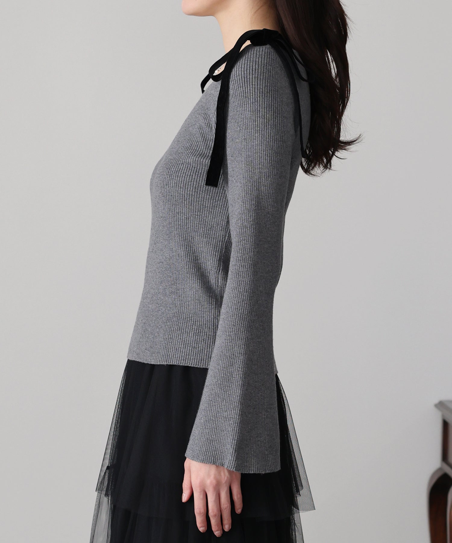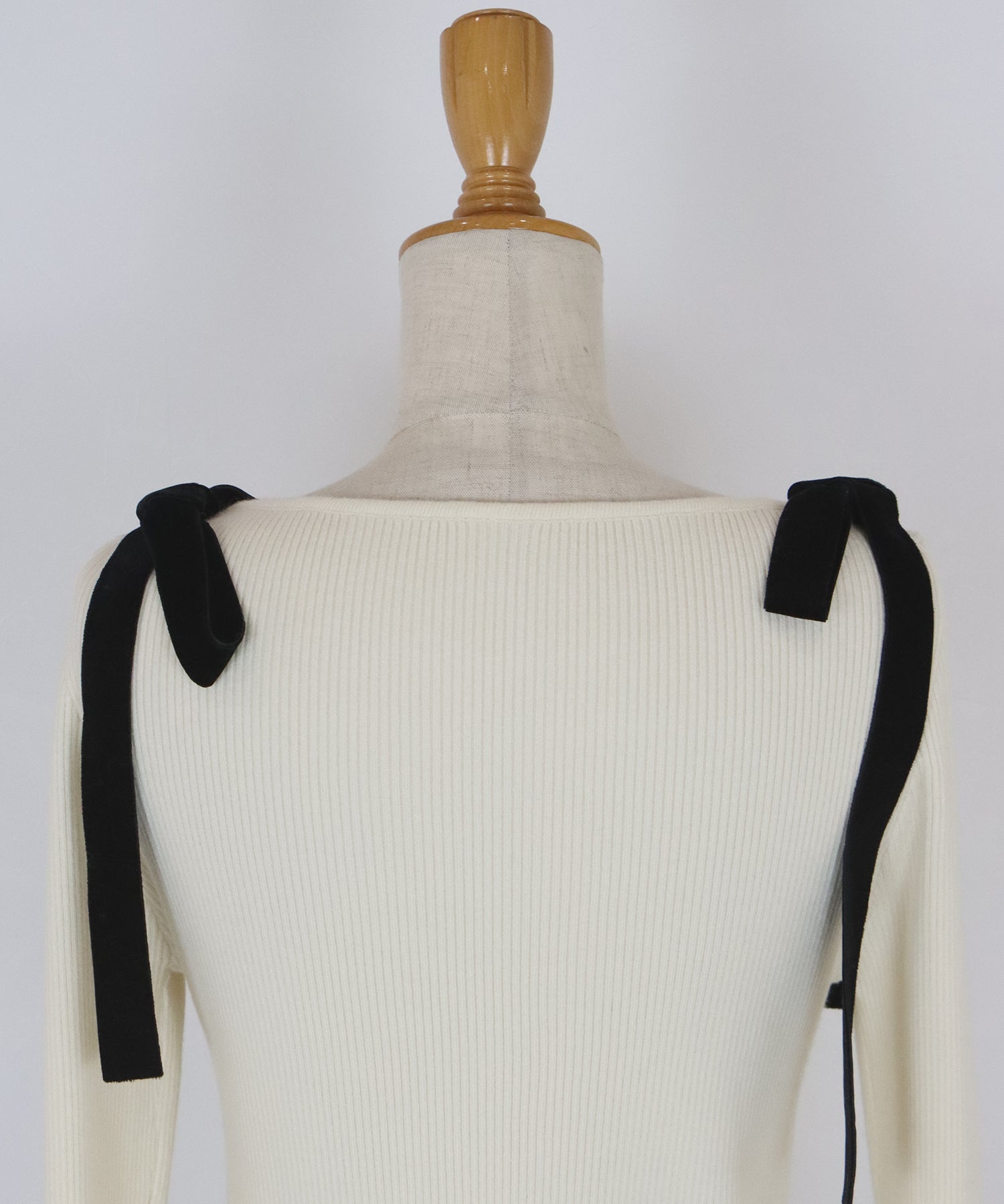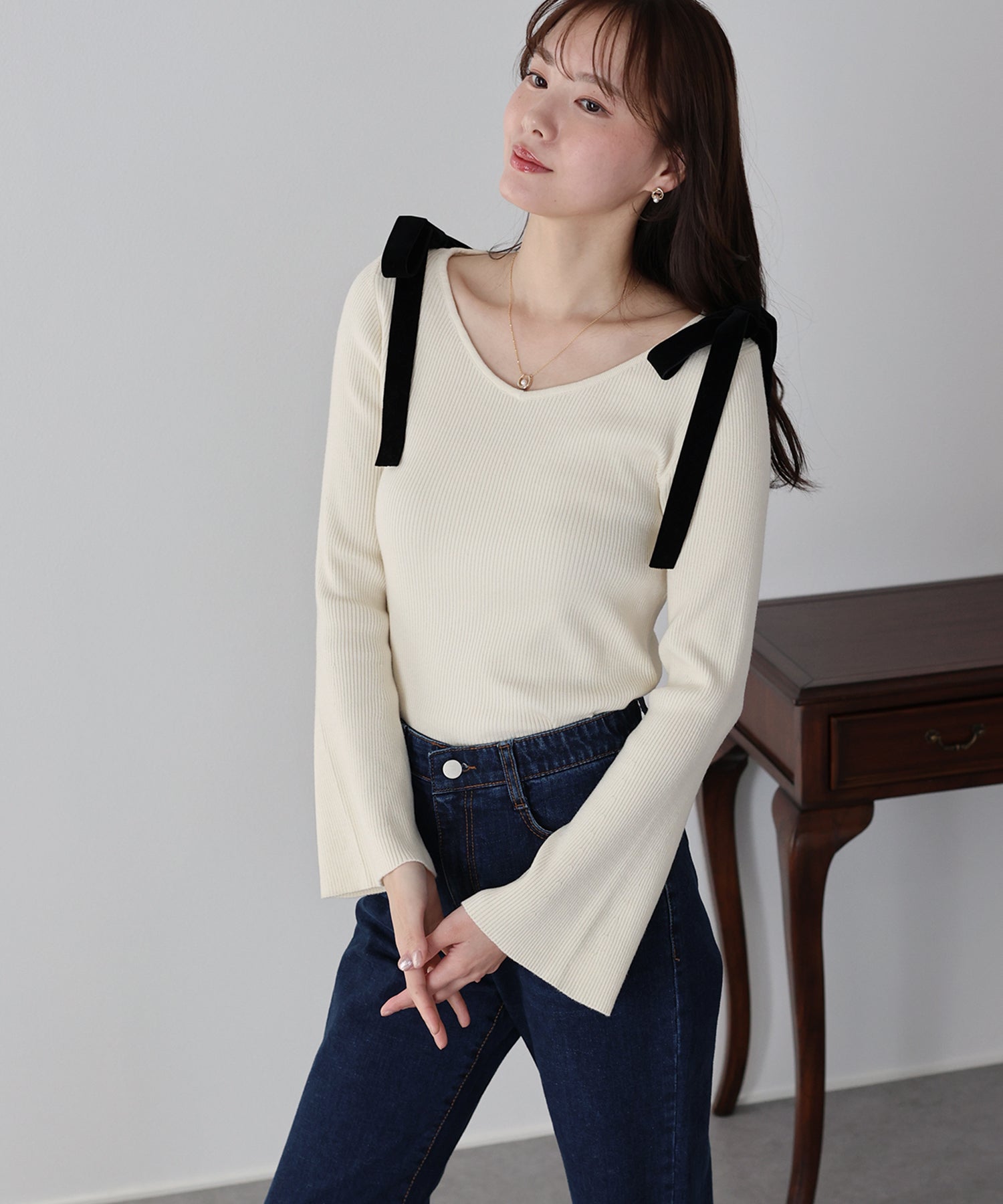 両肩にあしらったベロアリボンが大人かわいい雰囲気のフェミニンなニット。