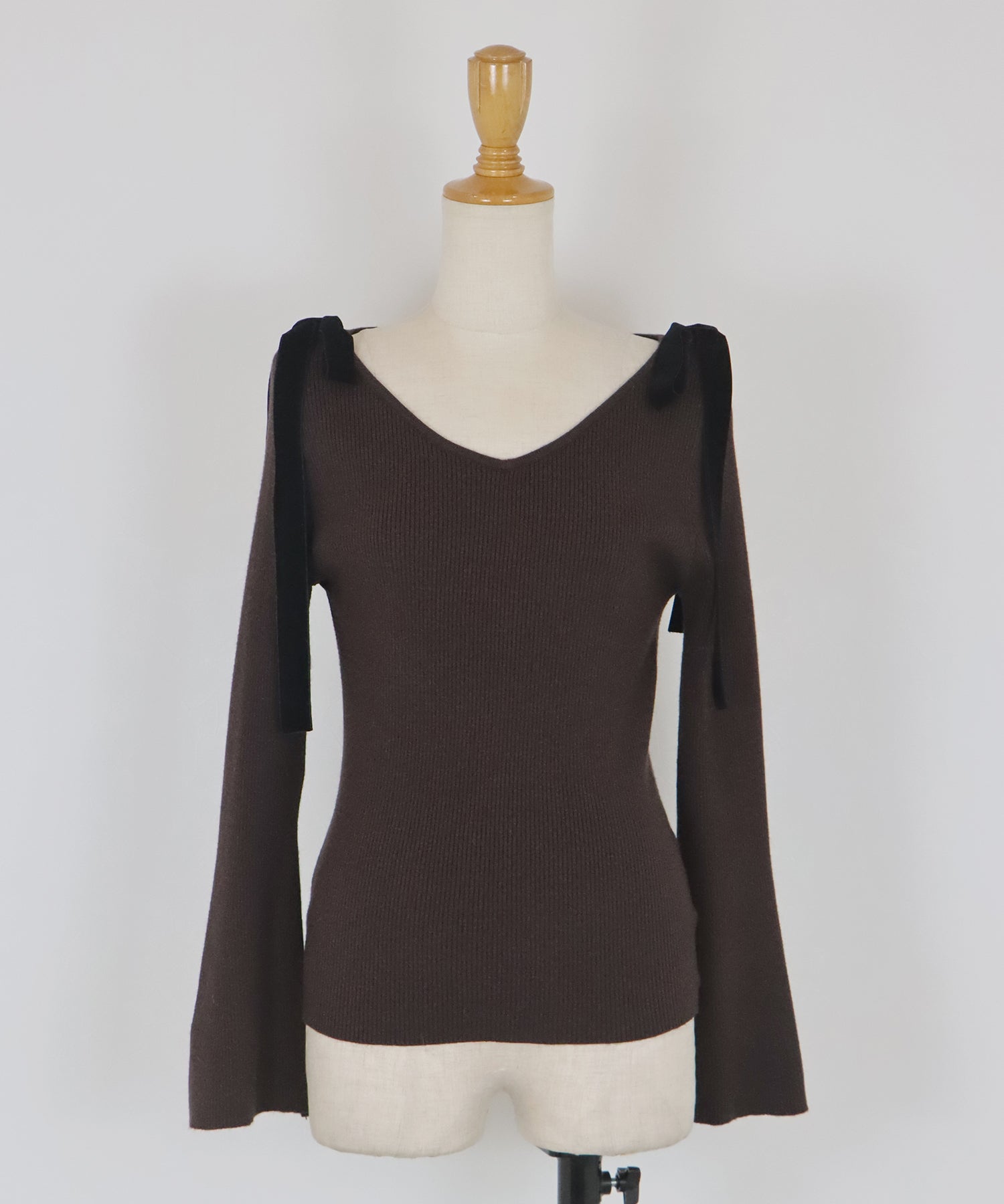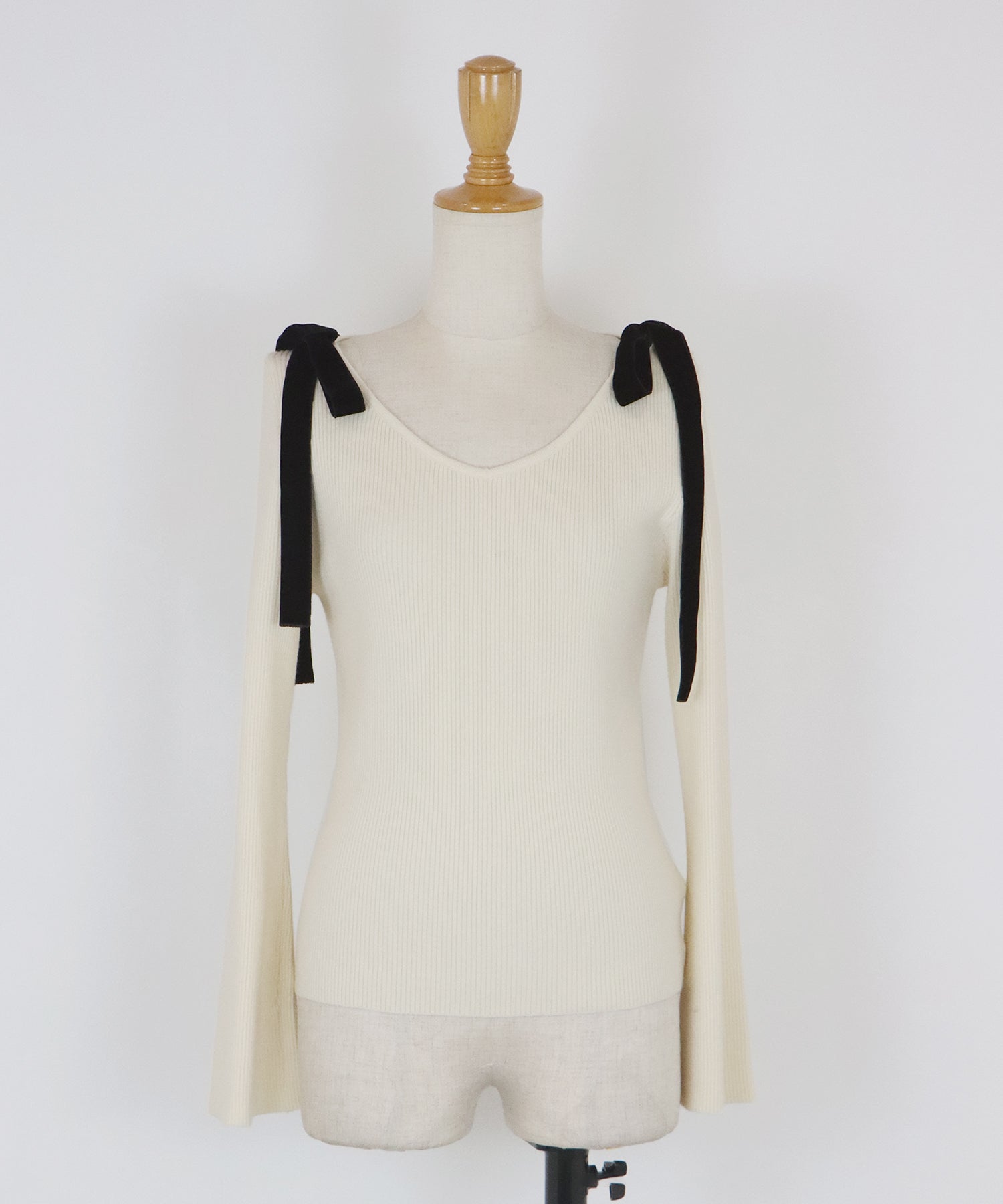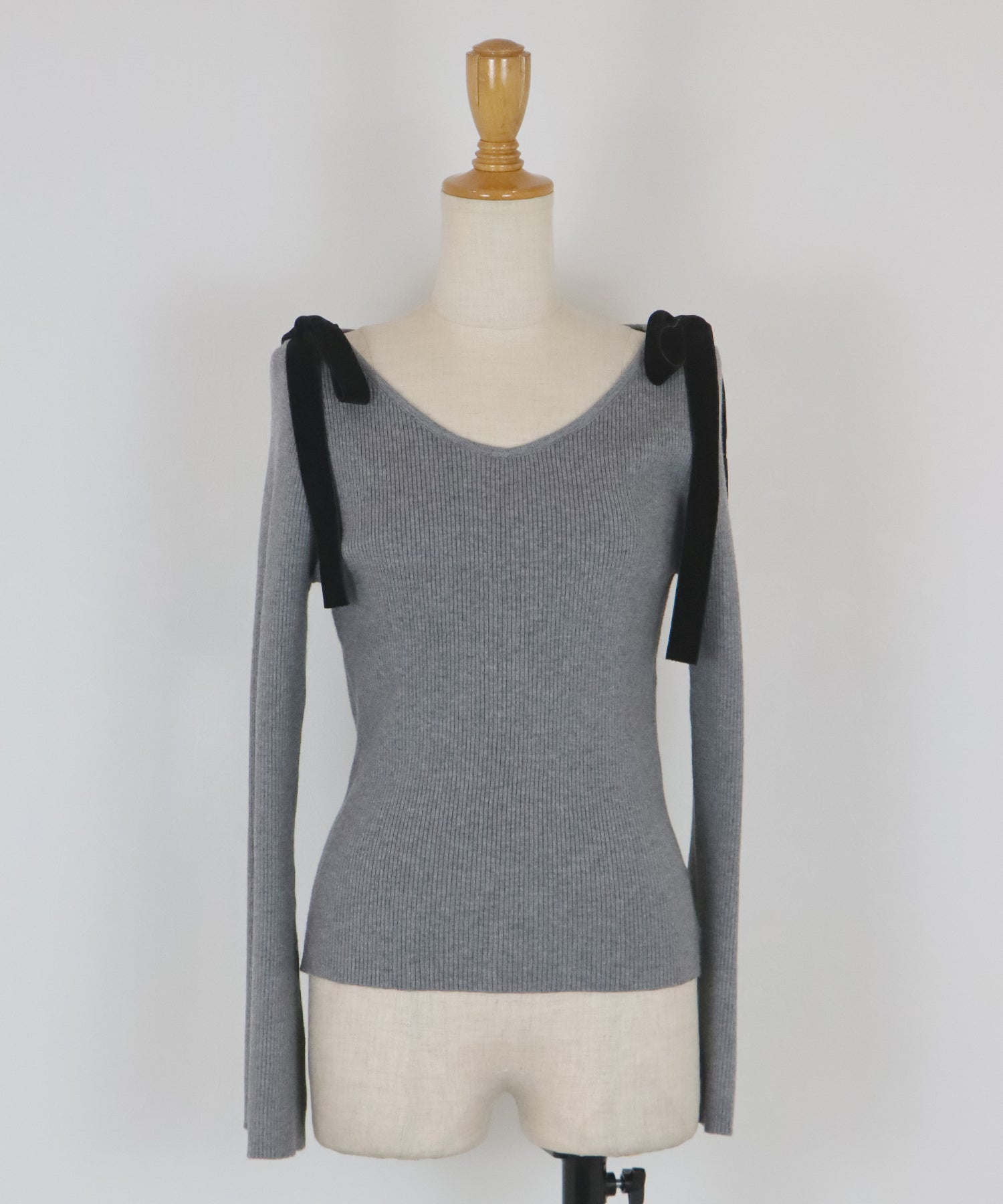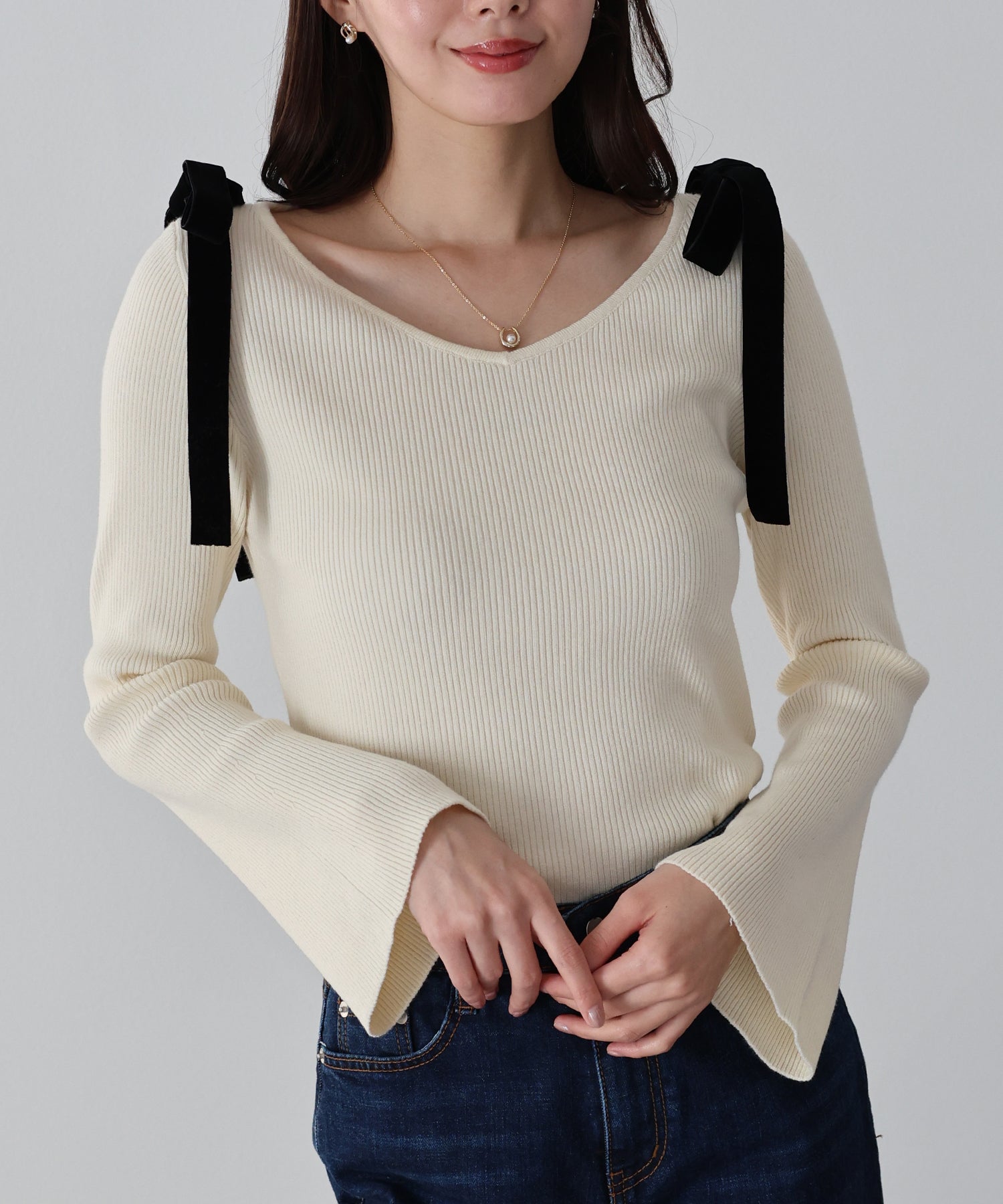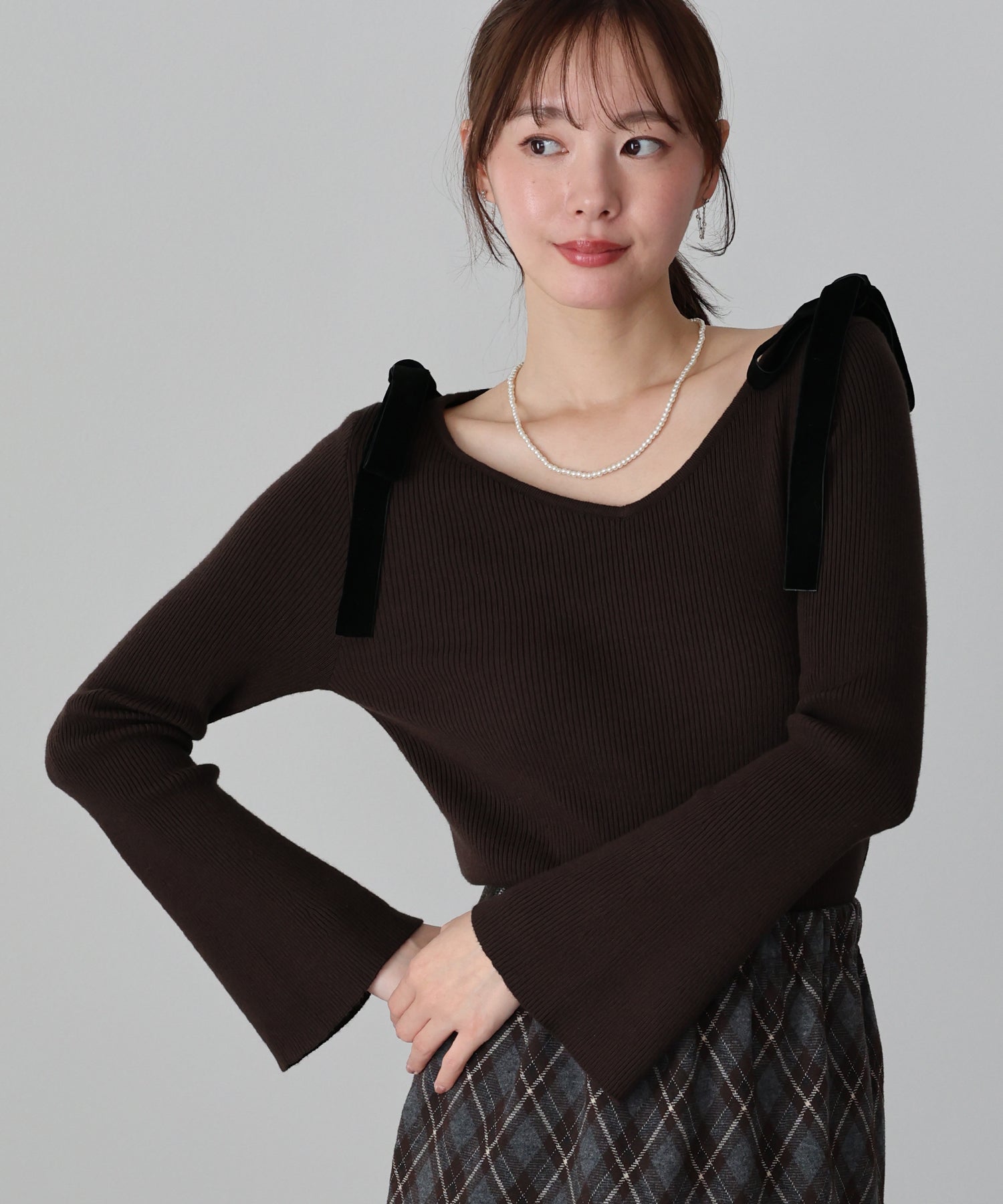両肩にあしらったベロアリボンが大人かわいい雰囲気のフェミニンなニット。