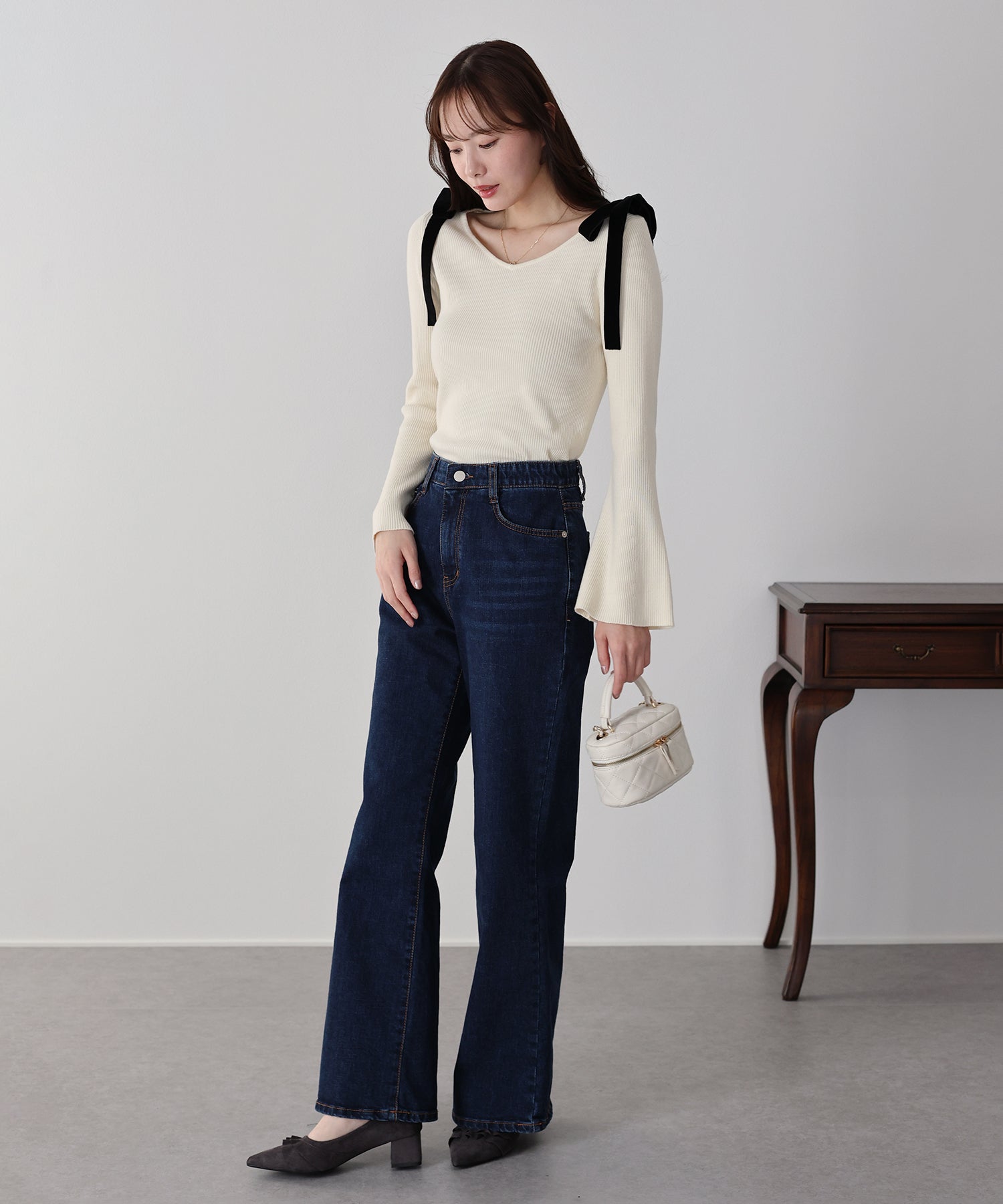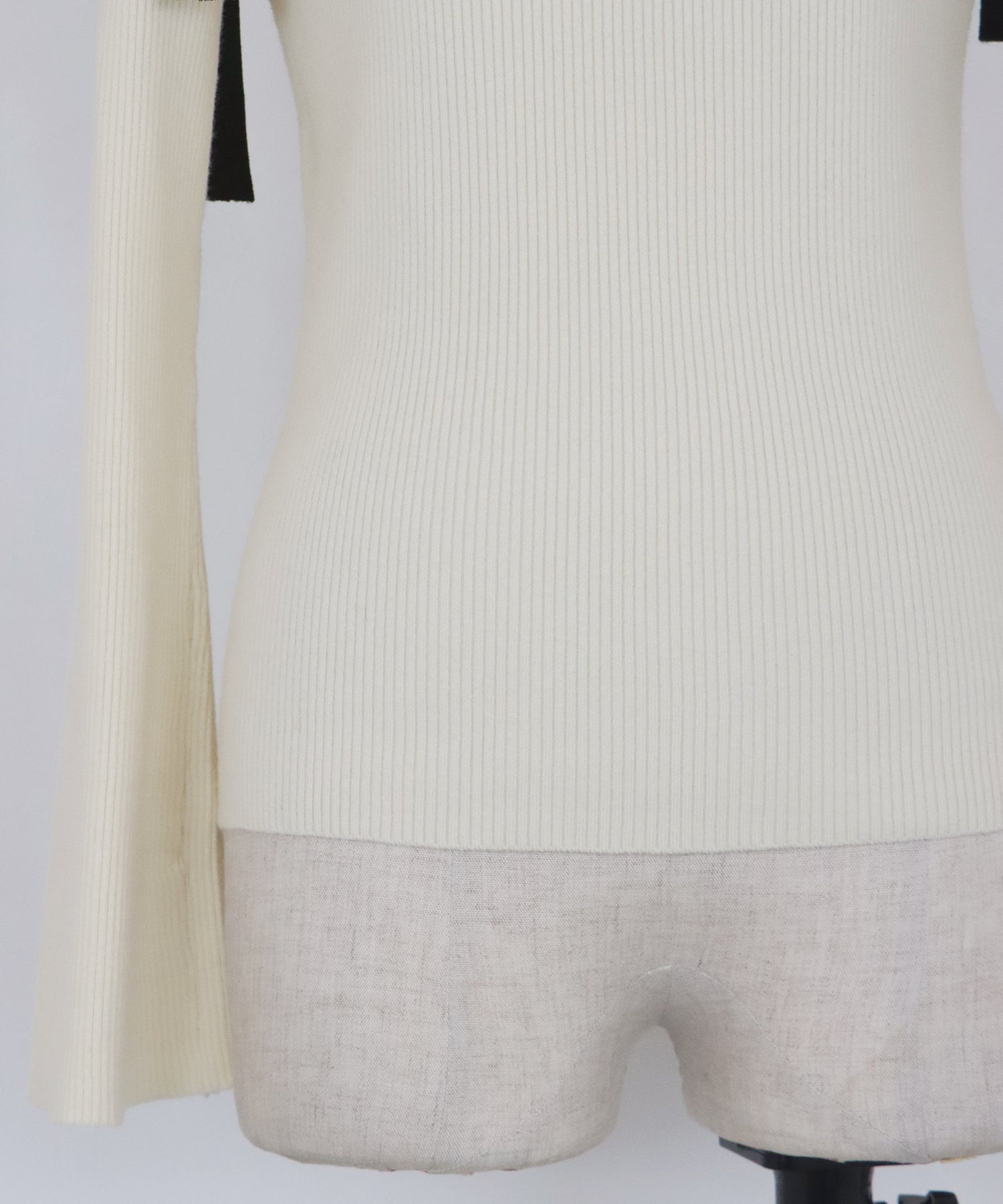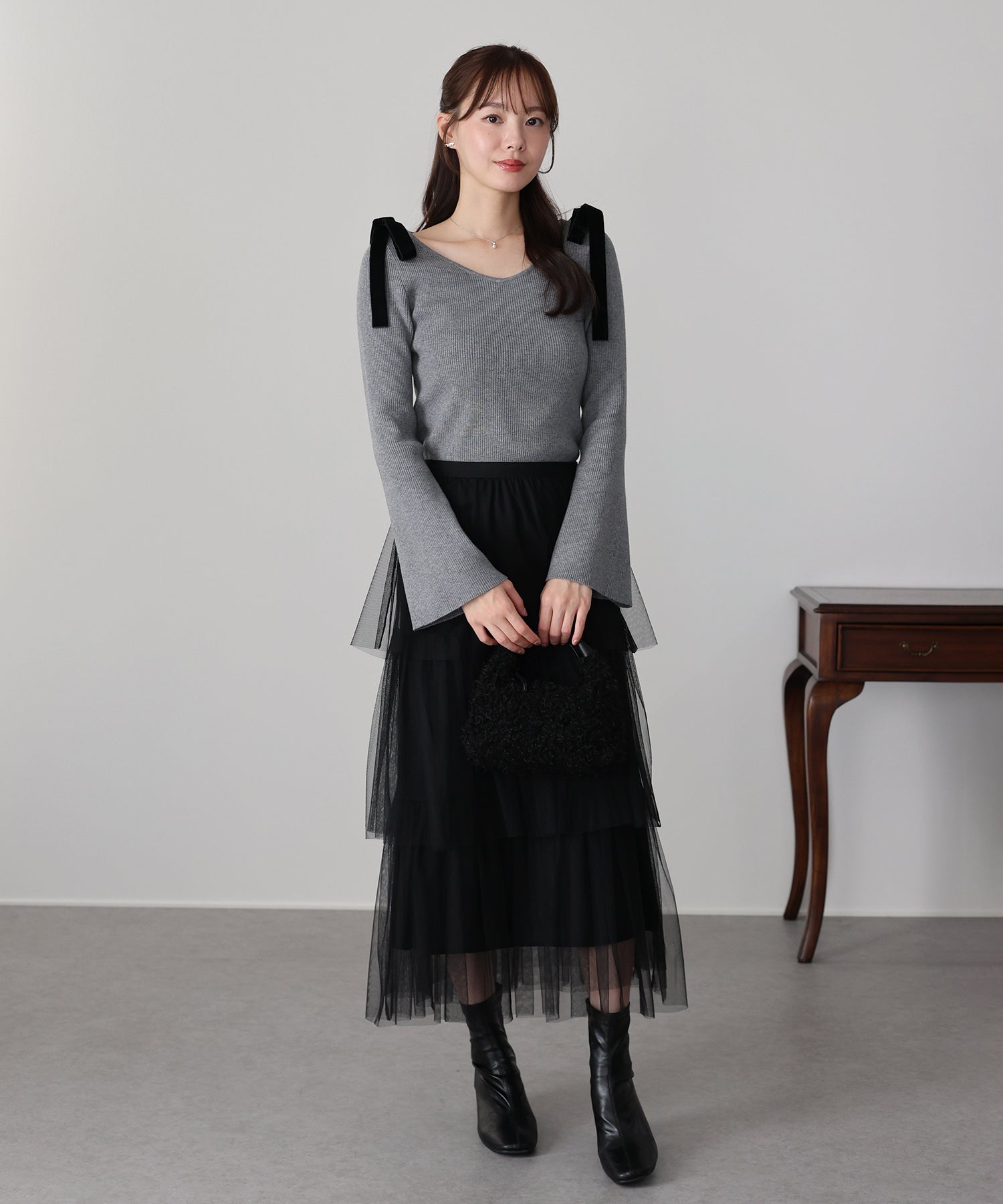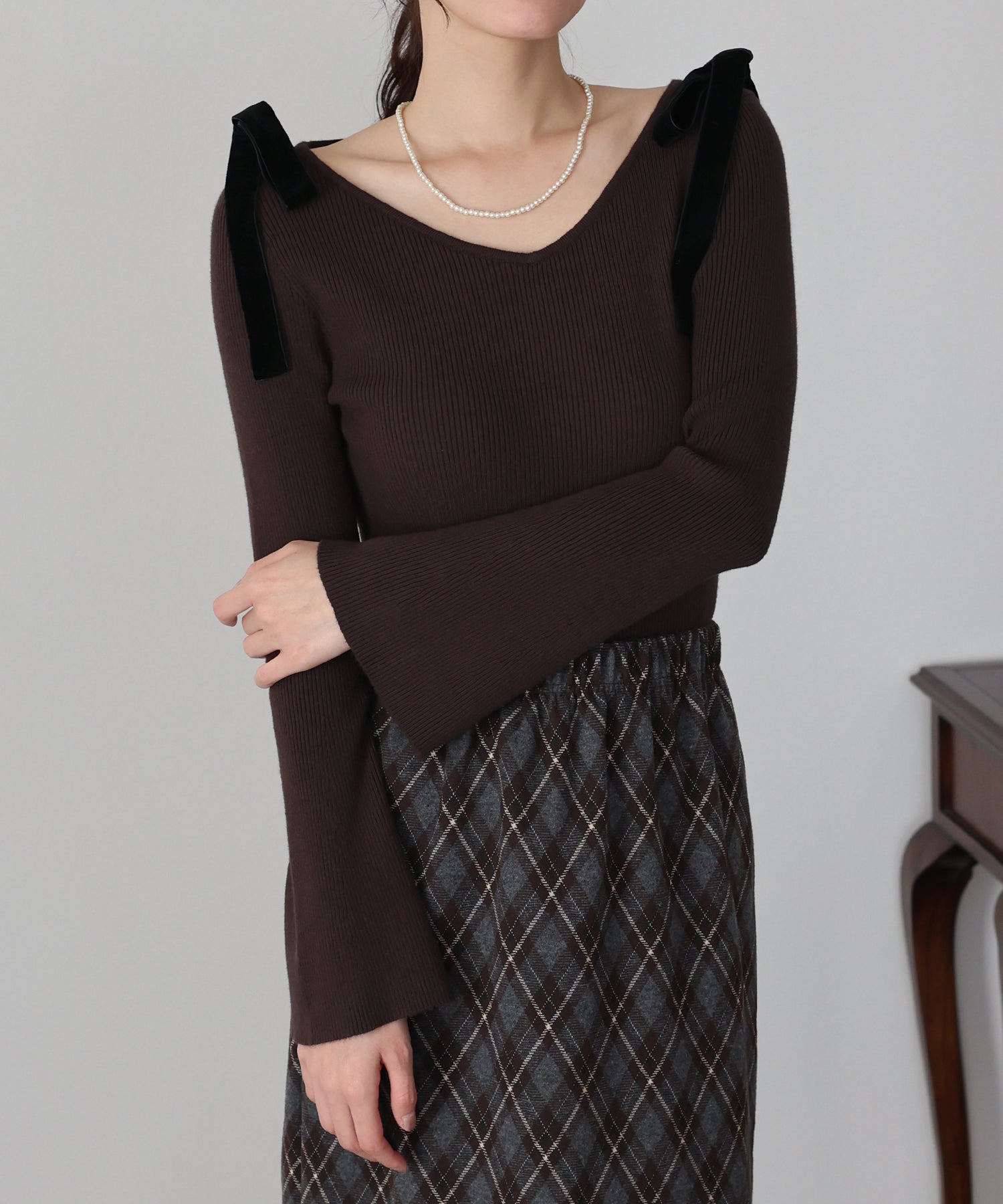 両肩にあしらったベロアリボンが大人かわいい雰囲気のフェミニンなニット。