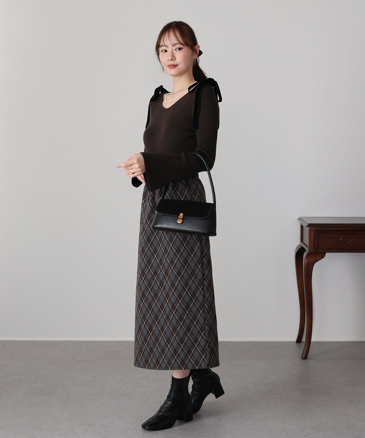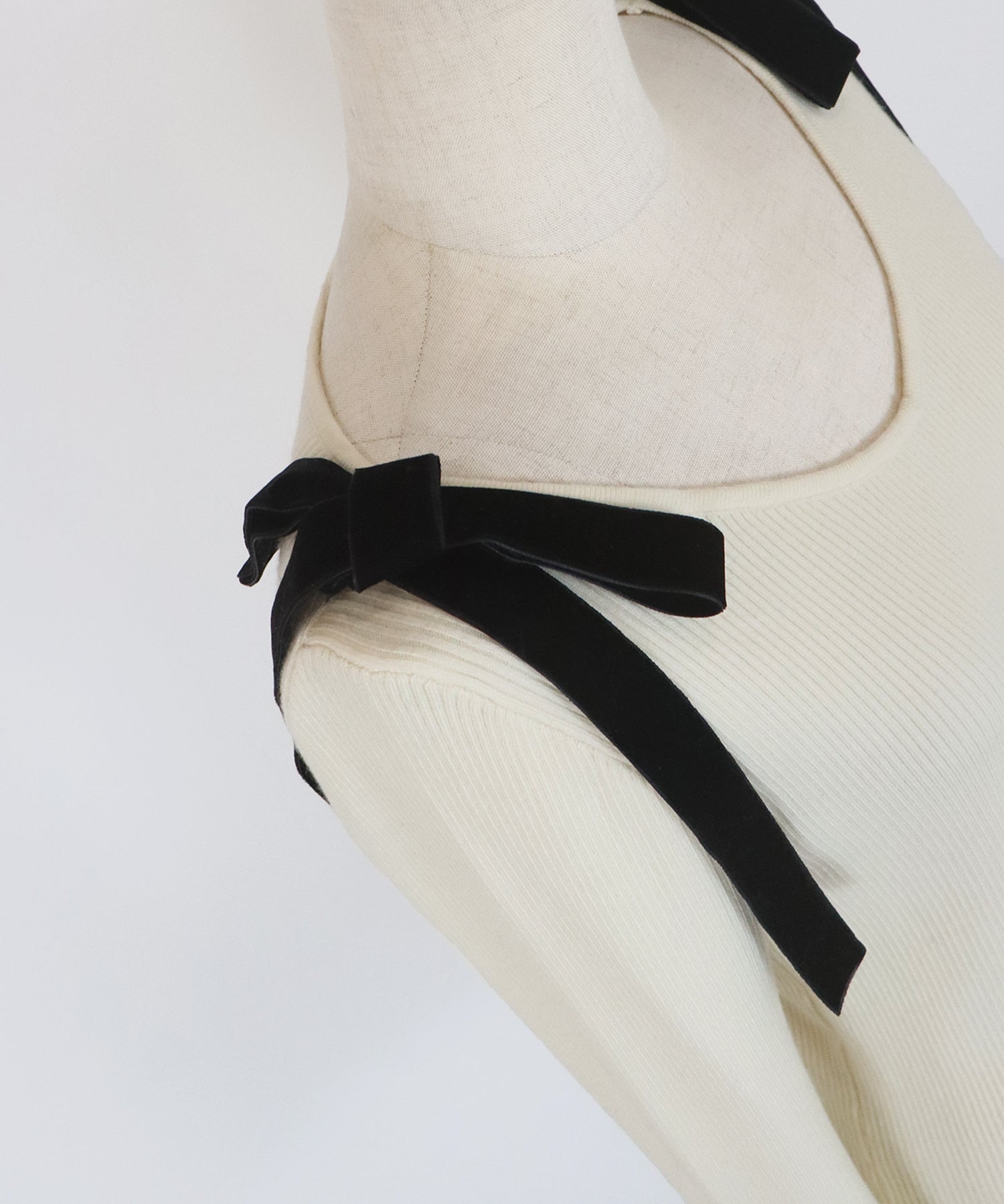 ベロアリボンが秋冬らしいかわいらしさを演出するリブニットトップス