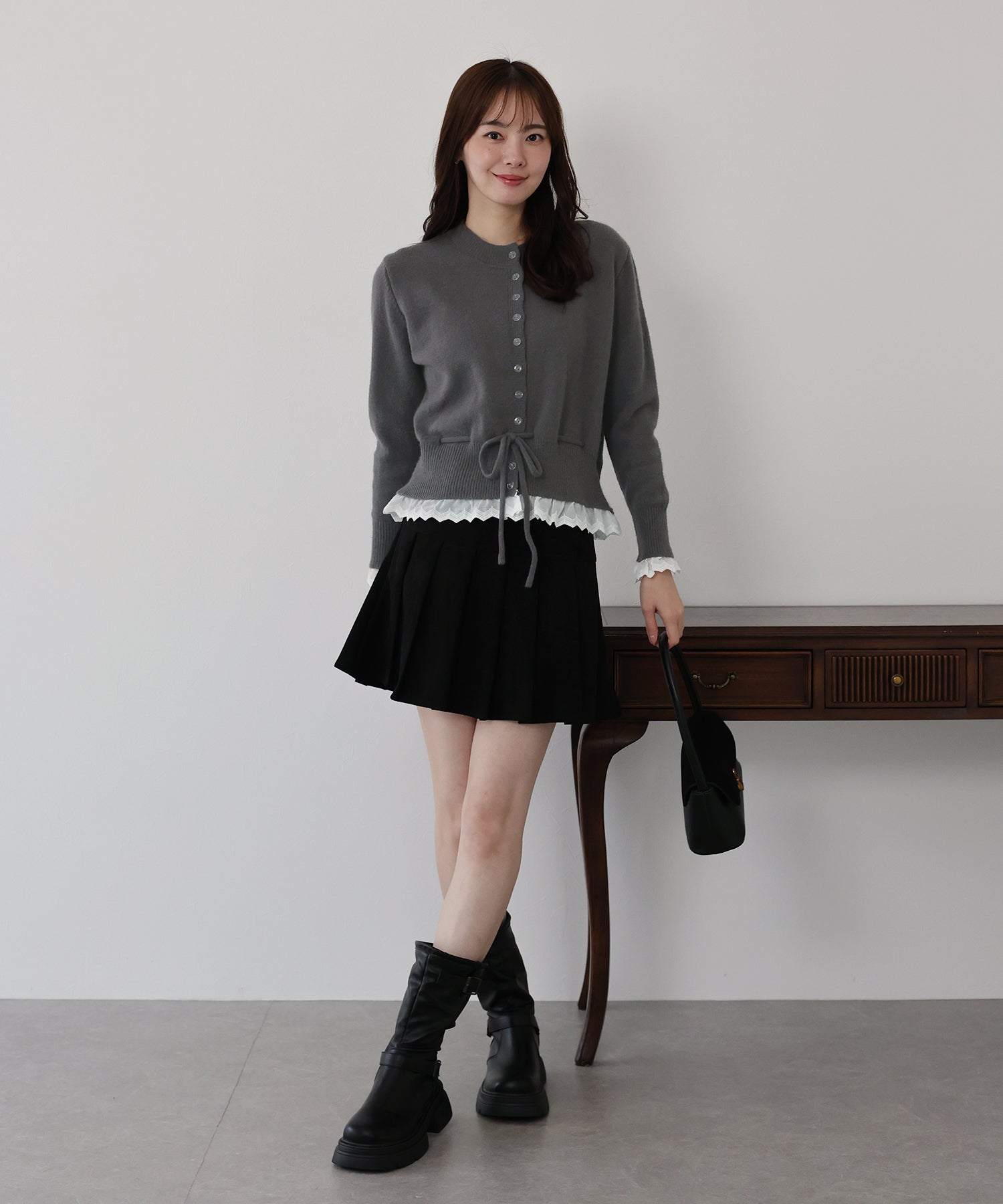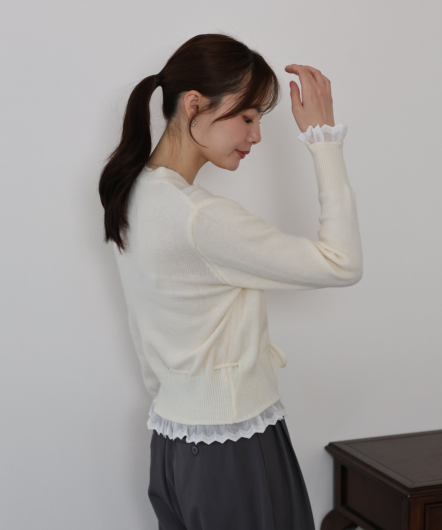 ドロスト部分をリボン結びするとガーリーな着こなしに◎
