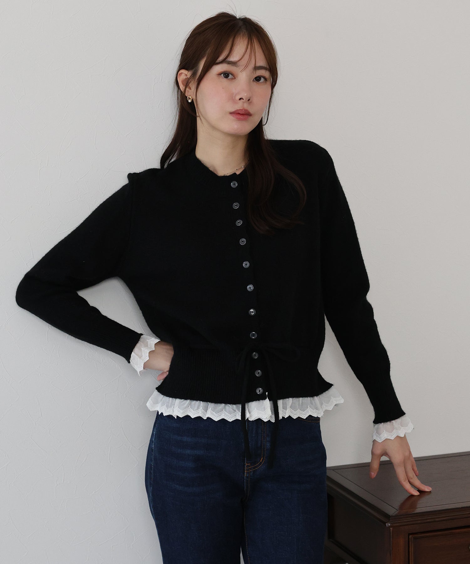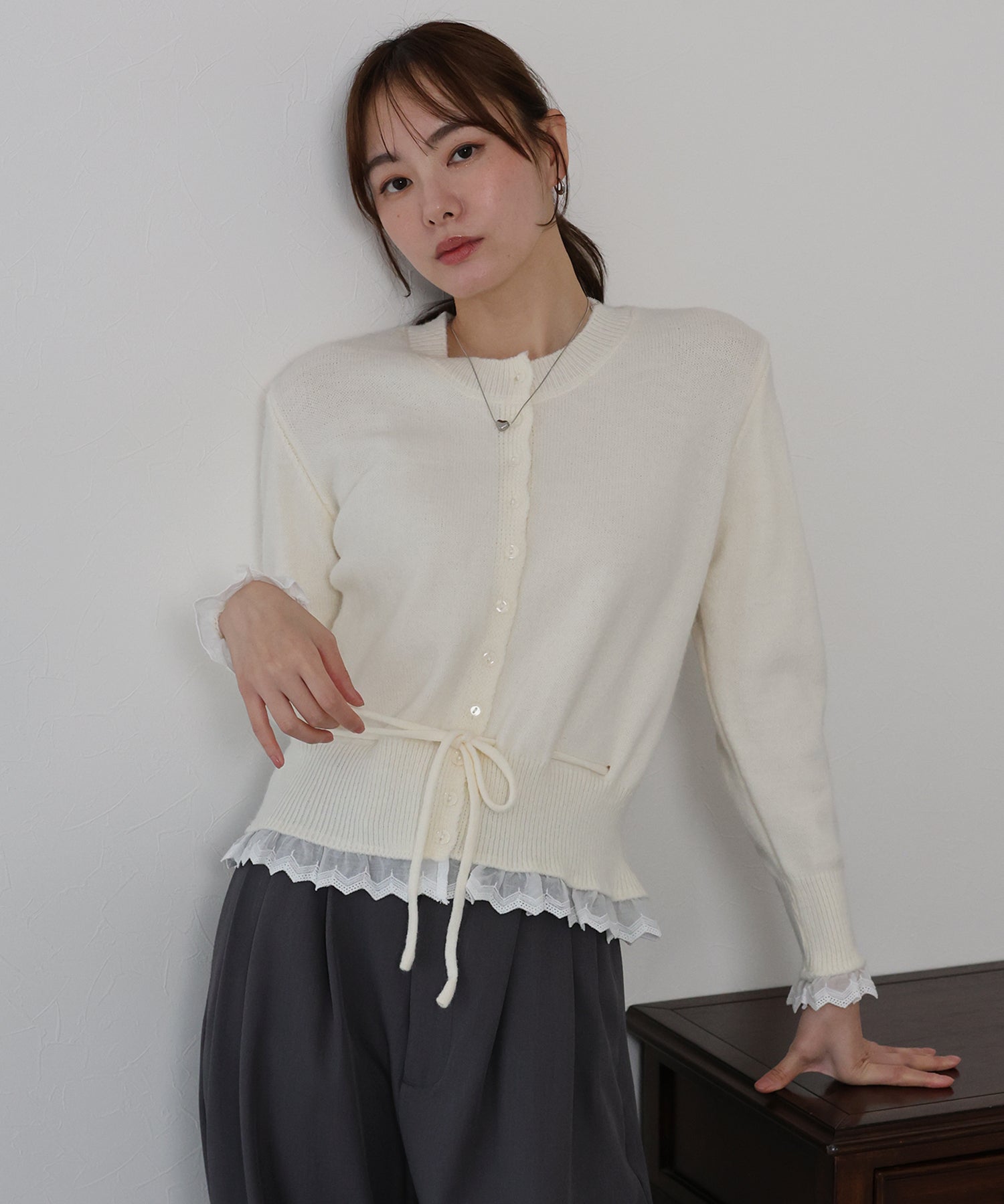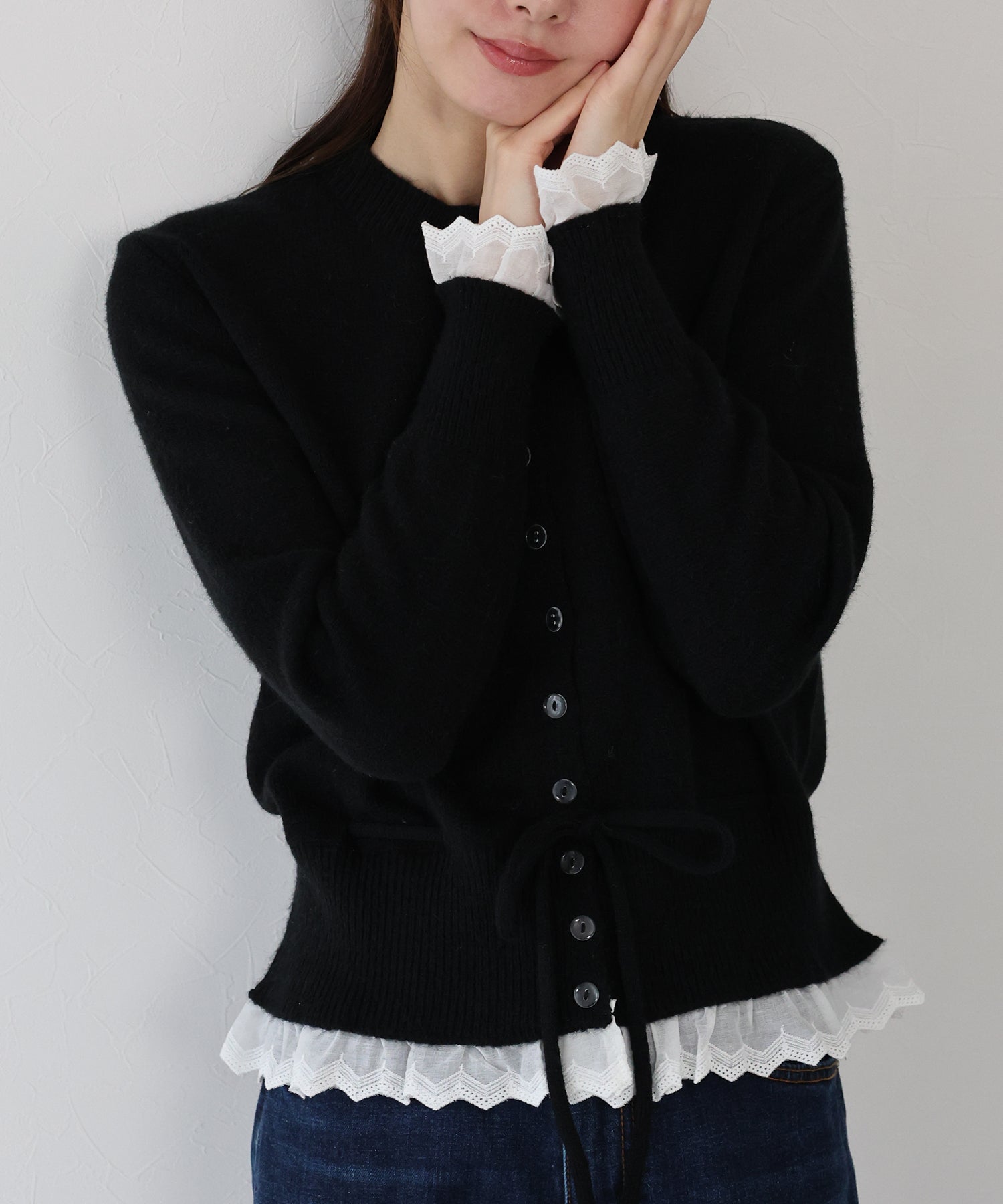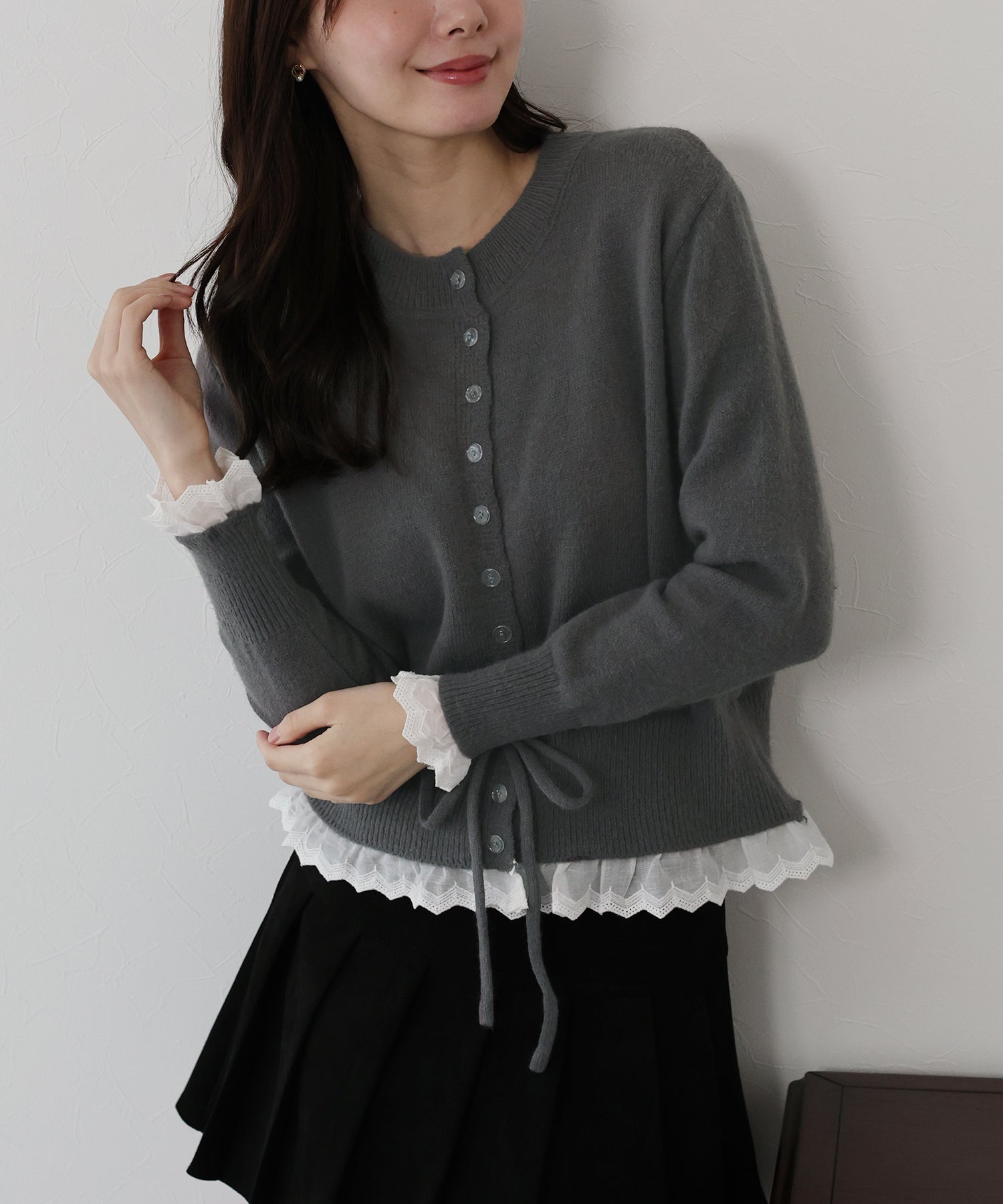 袖口と裾にあしらったレースが大人かわいい魅力のニットカーディガン。