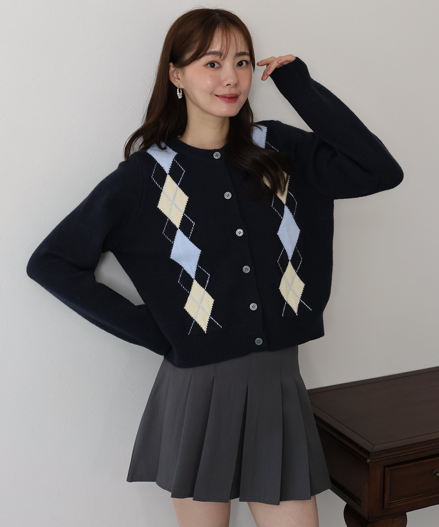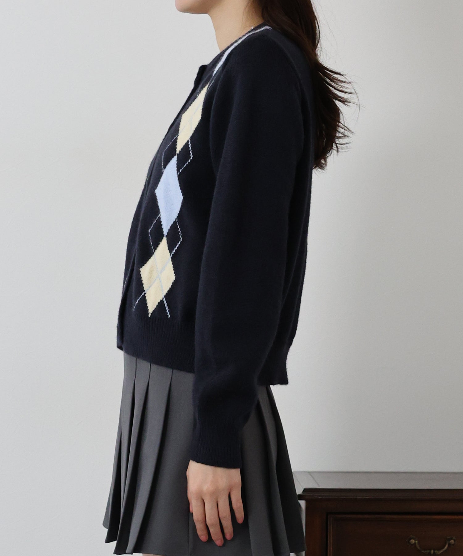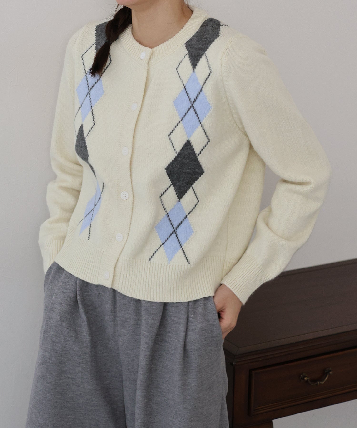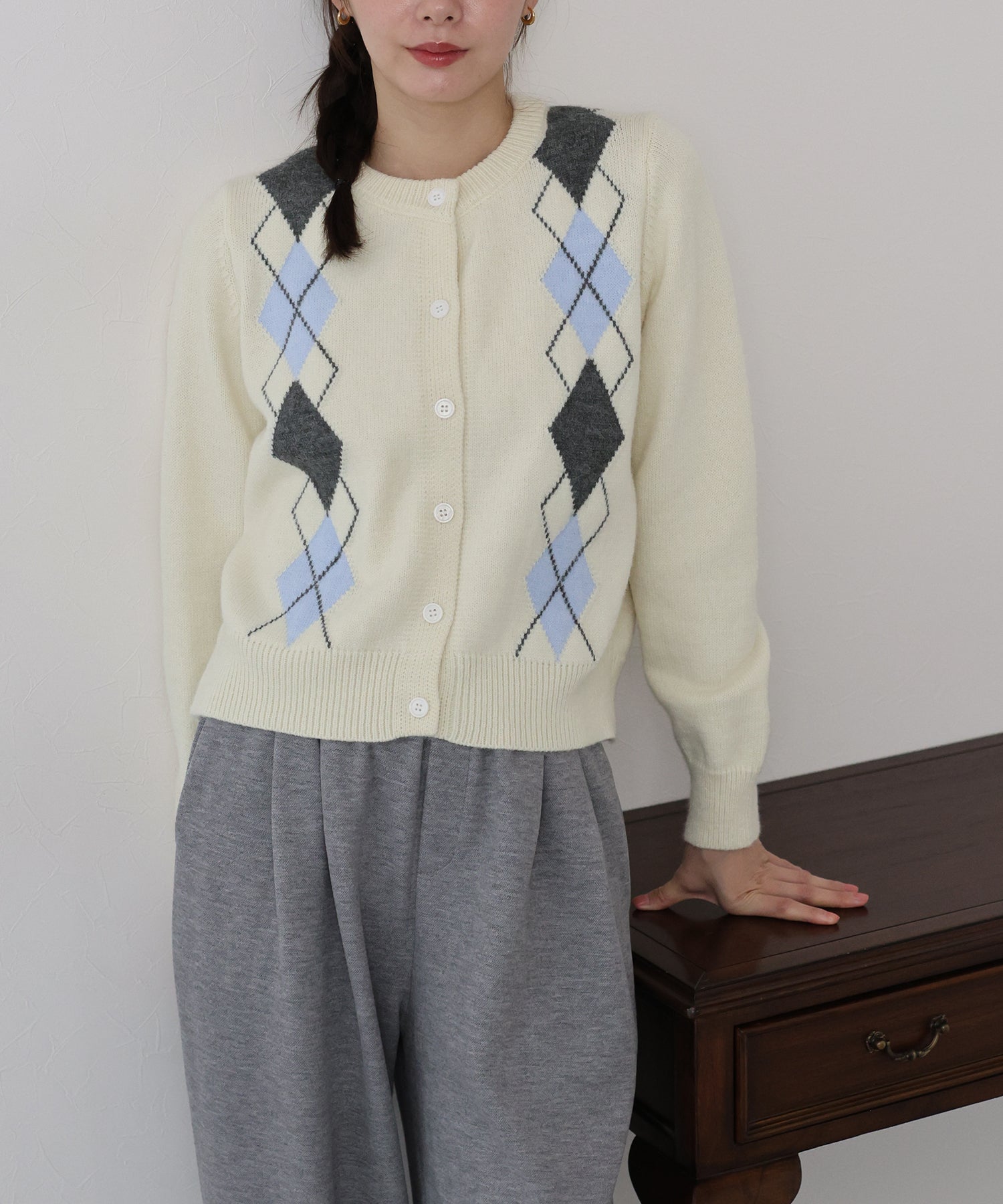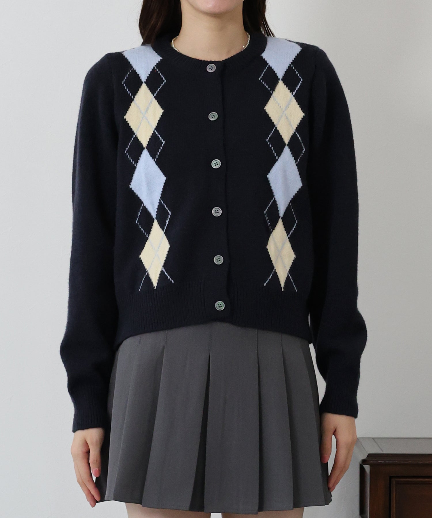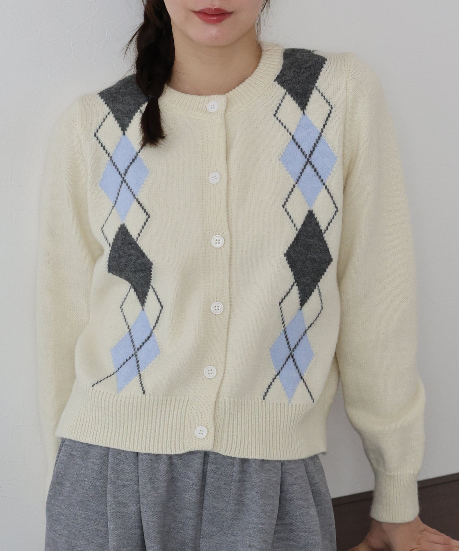 シーズンライクなアーガイル柄がクラシカルな印象のニットカーディガン
