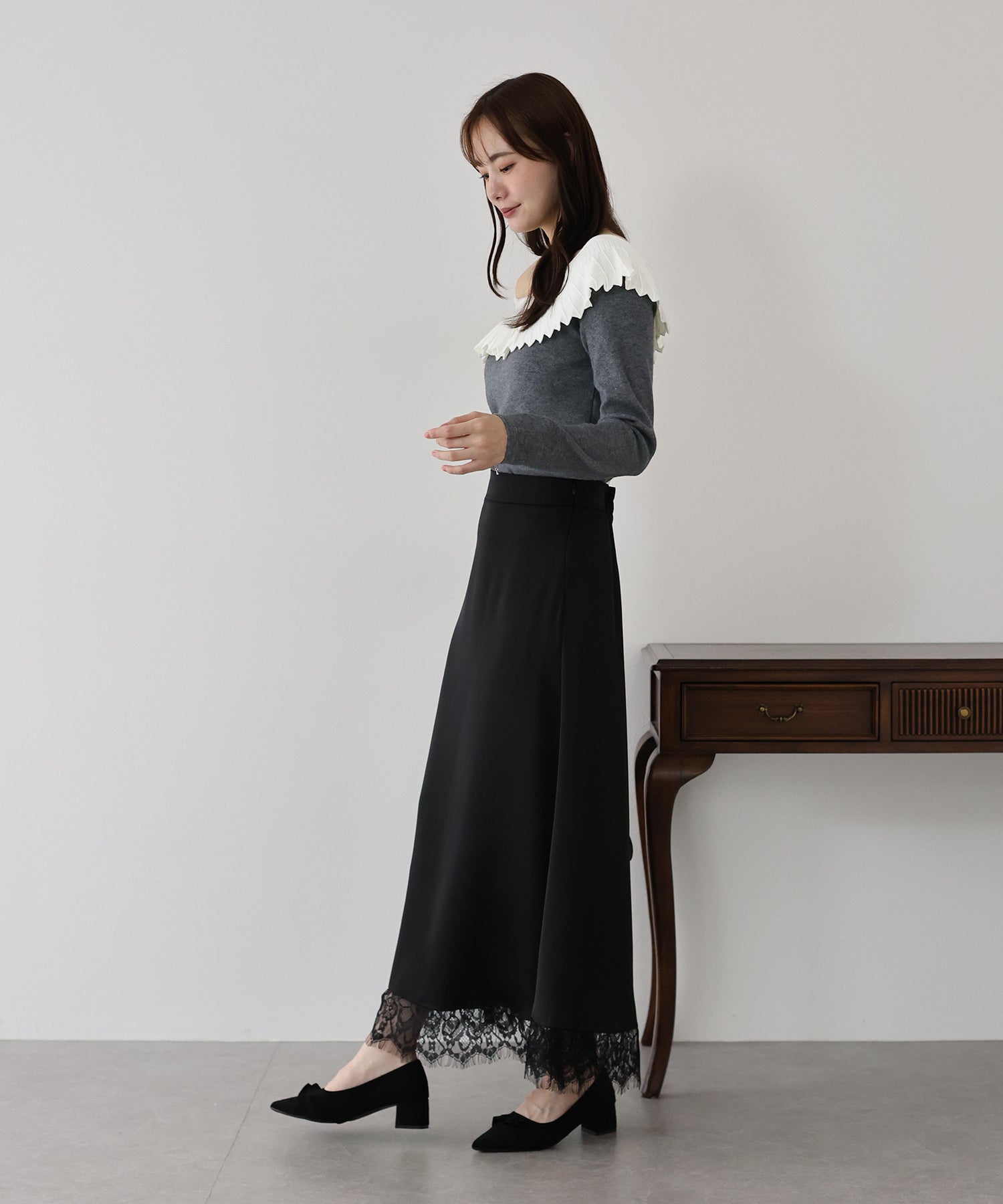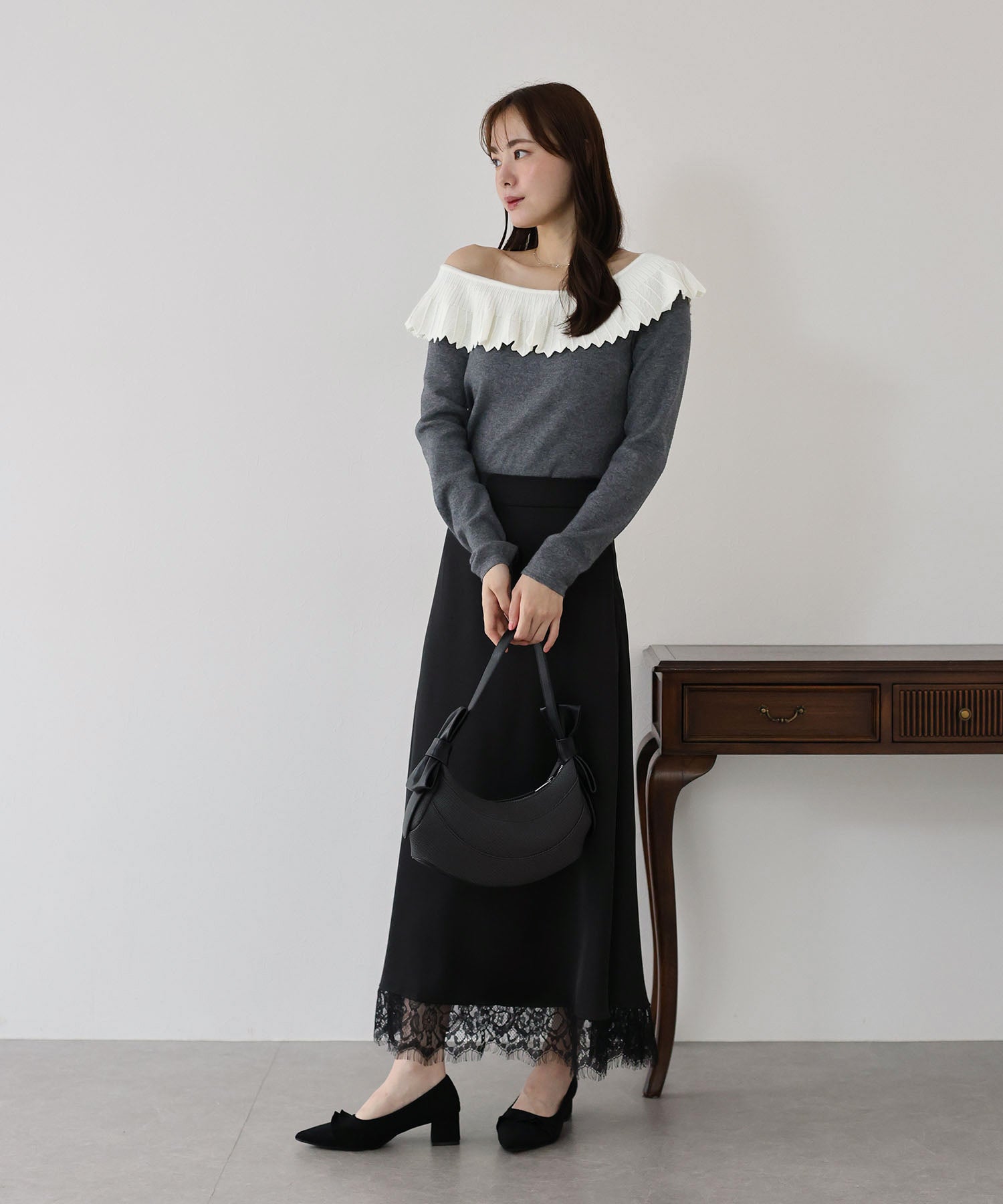 ニットのレース襟が大人ガーリーな雰囲気のニットトップス