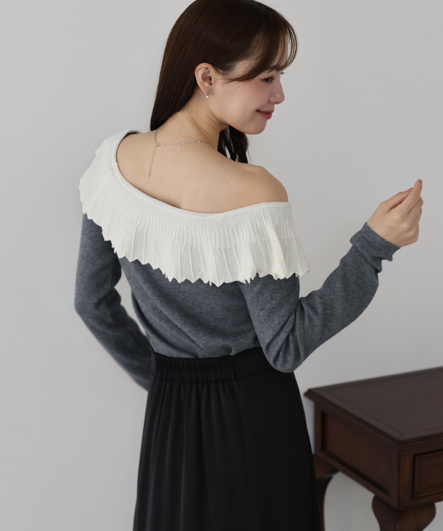 スッキリと広めに開いたネックが首のラインや鎖骨をキレイに見せ、フェミニンな雰囲気を演出します。