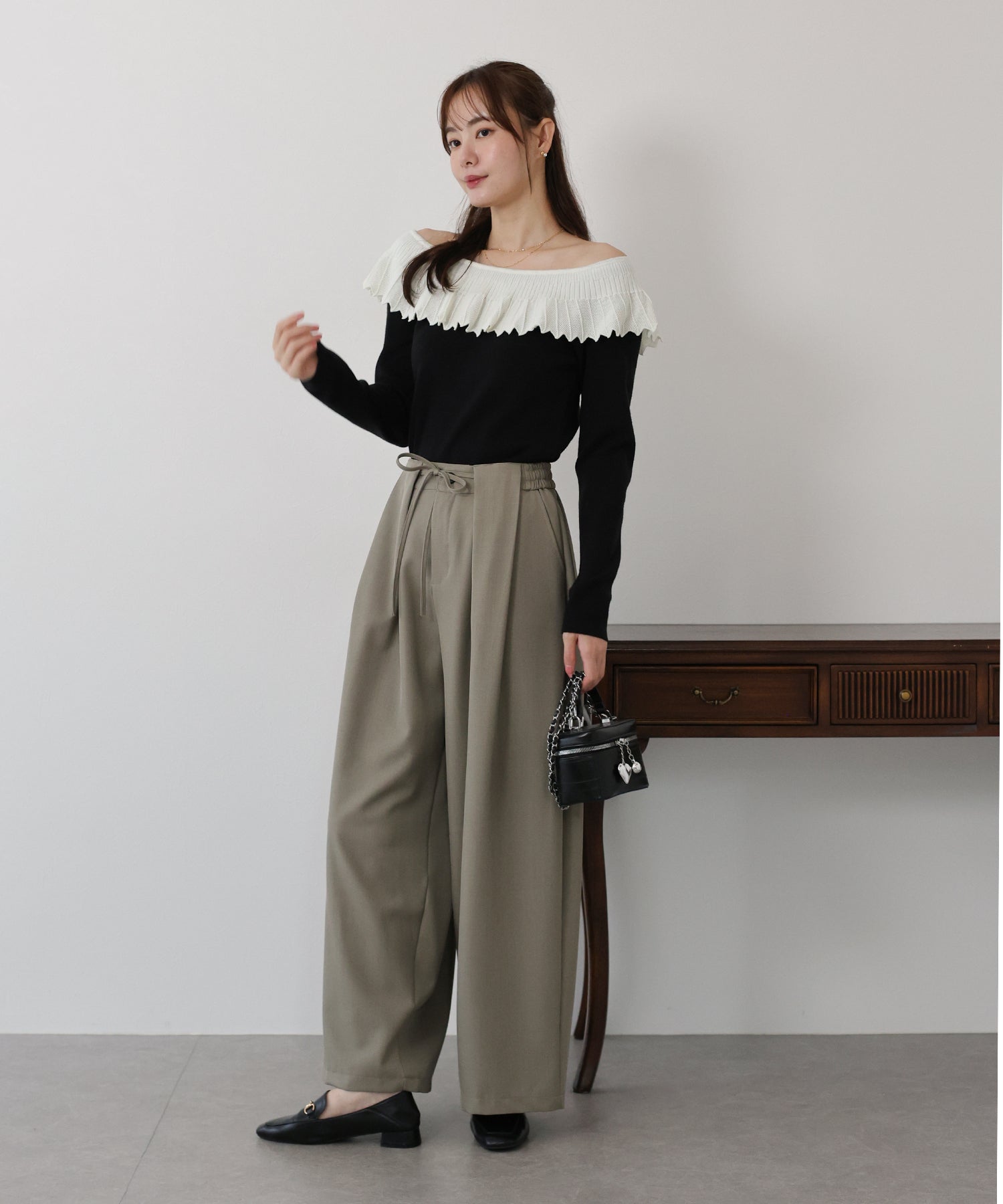 チュールスカートやフレアスカートと合わせてフェミニンなコーデはもちろん、
