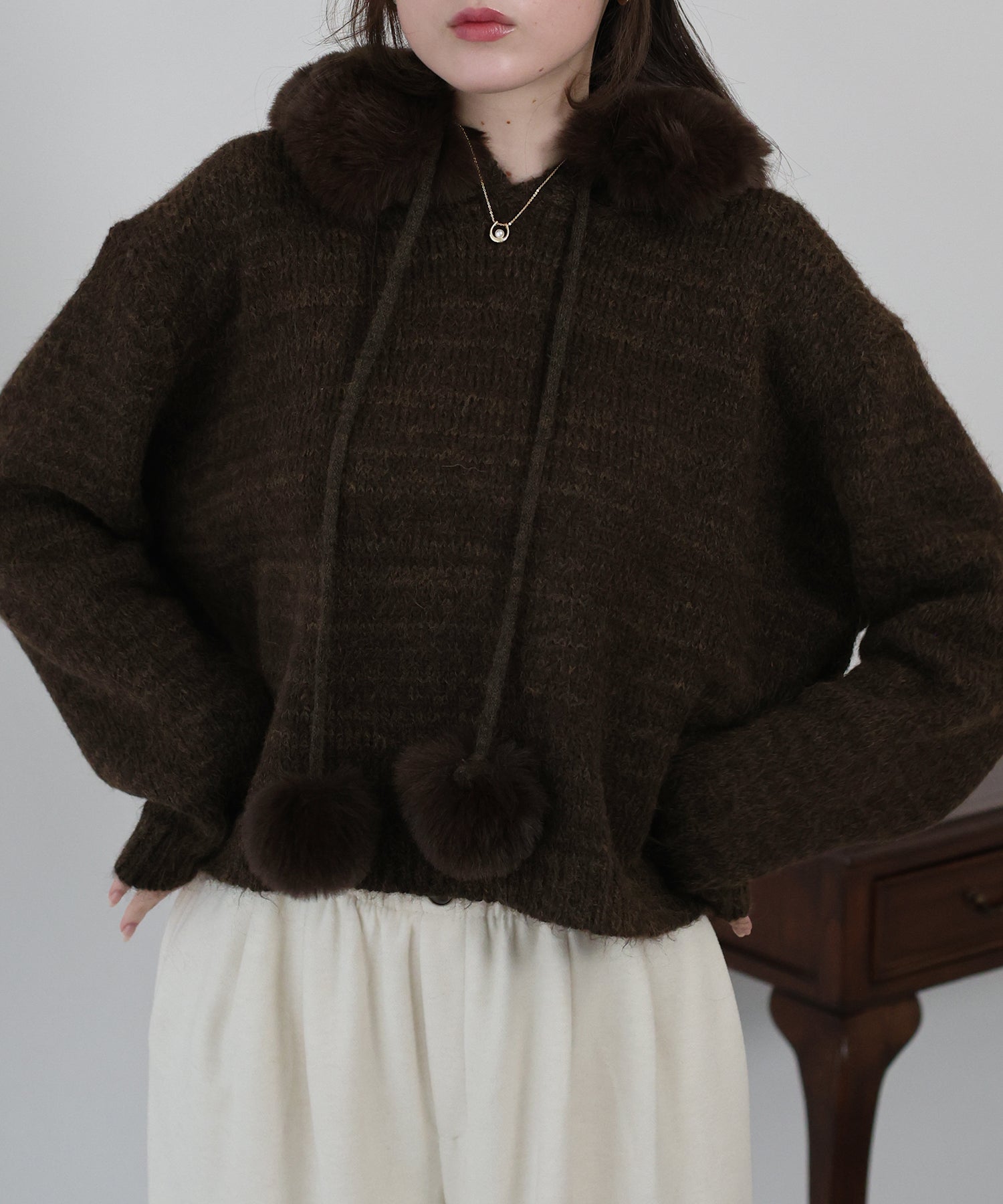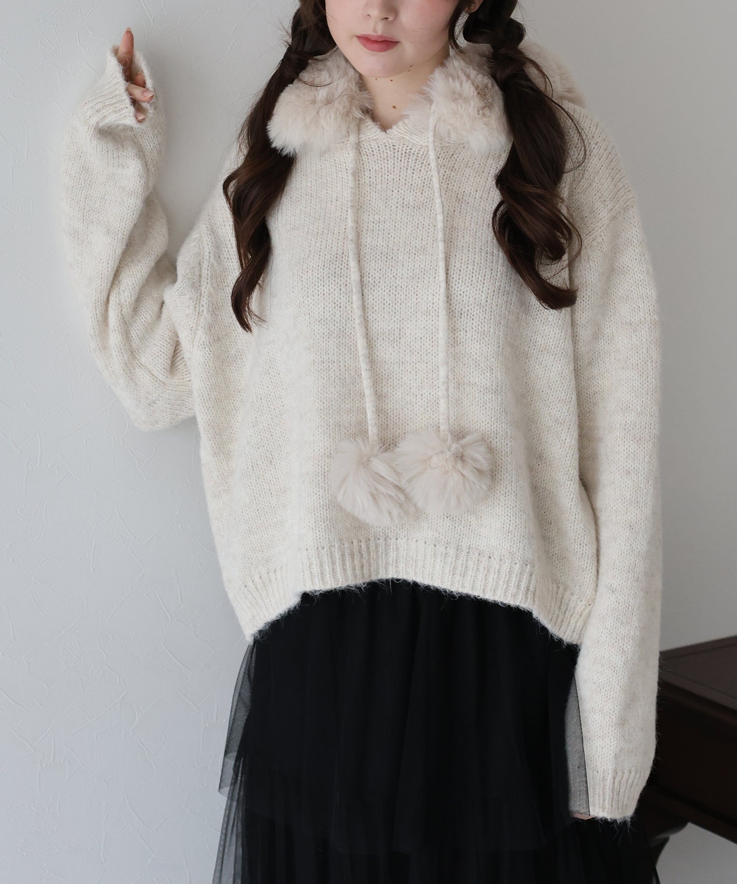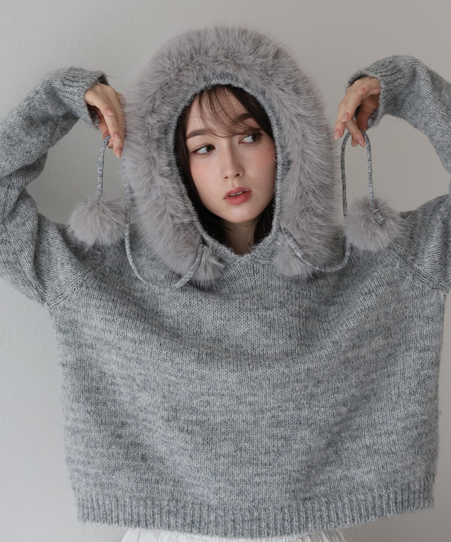 ボリュームファーが顔周りを華やかにしてくれるファー付きのフードニット。