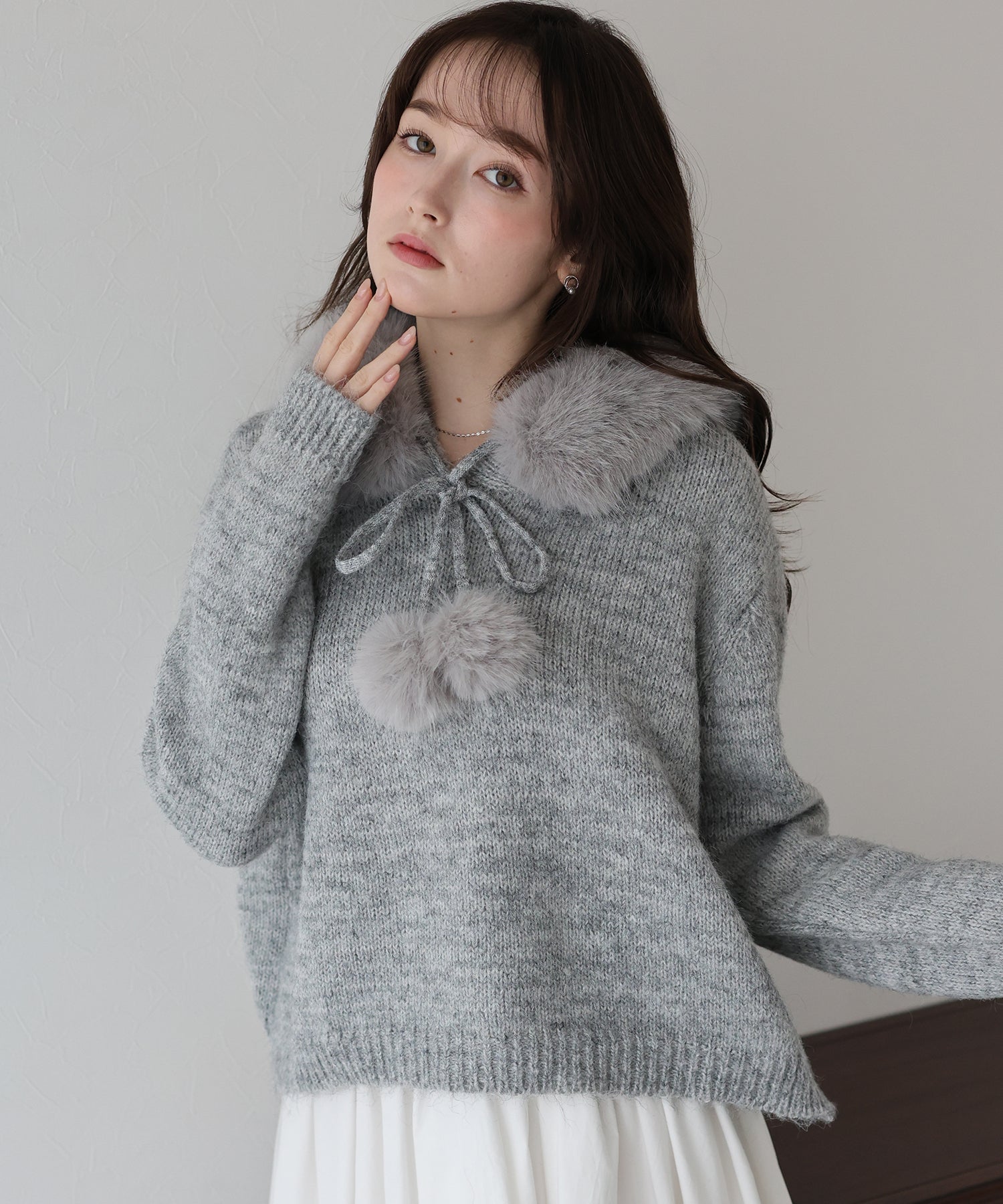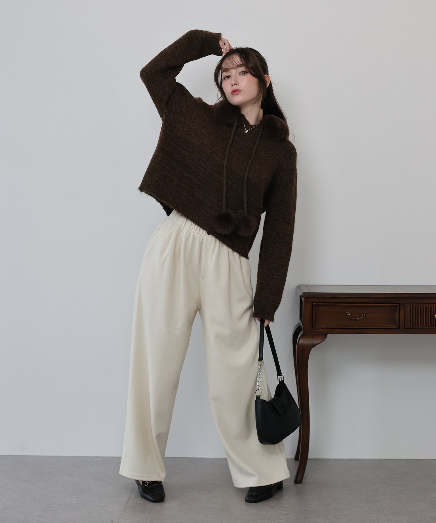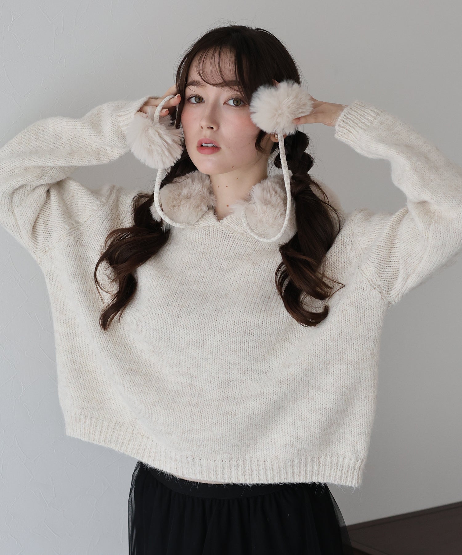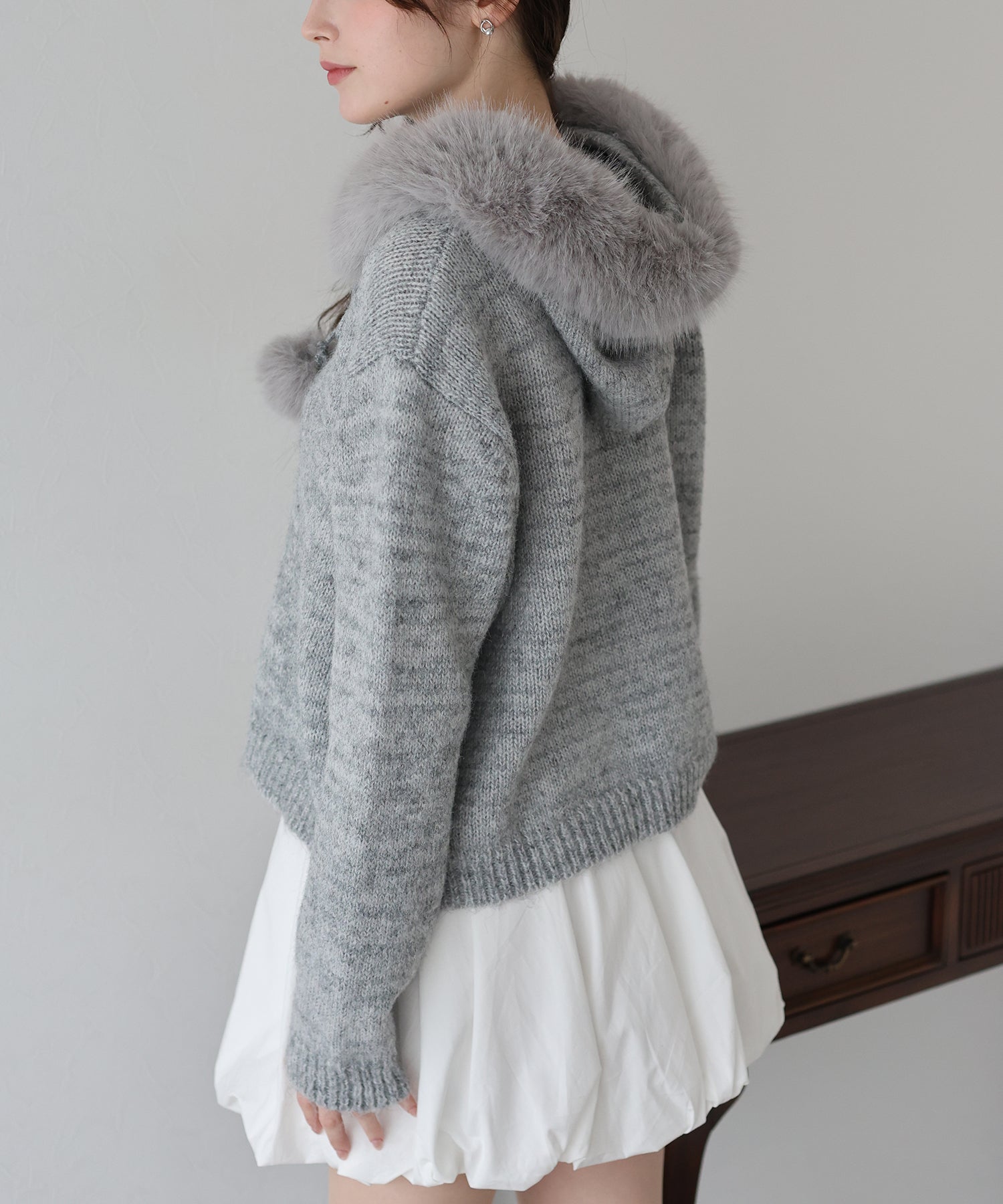 ボリュームファーが顔周りを華やかにしてくれるファー付きのフードニット。