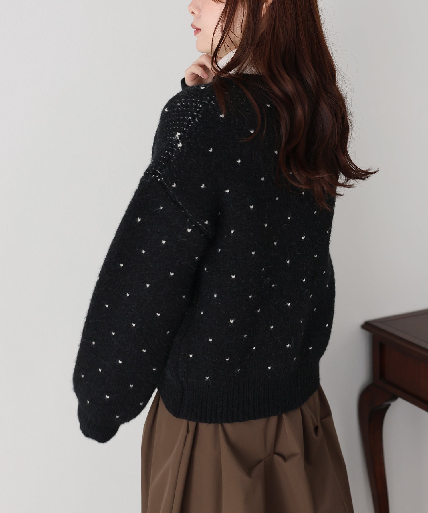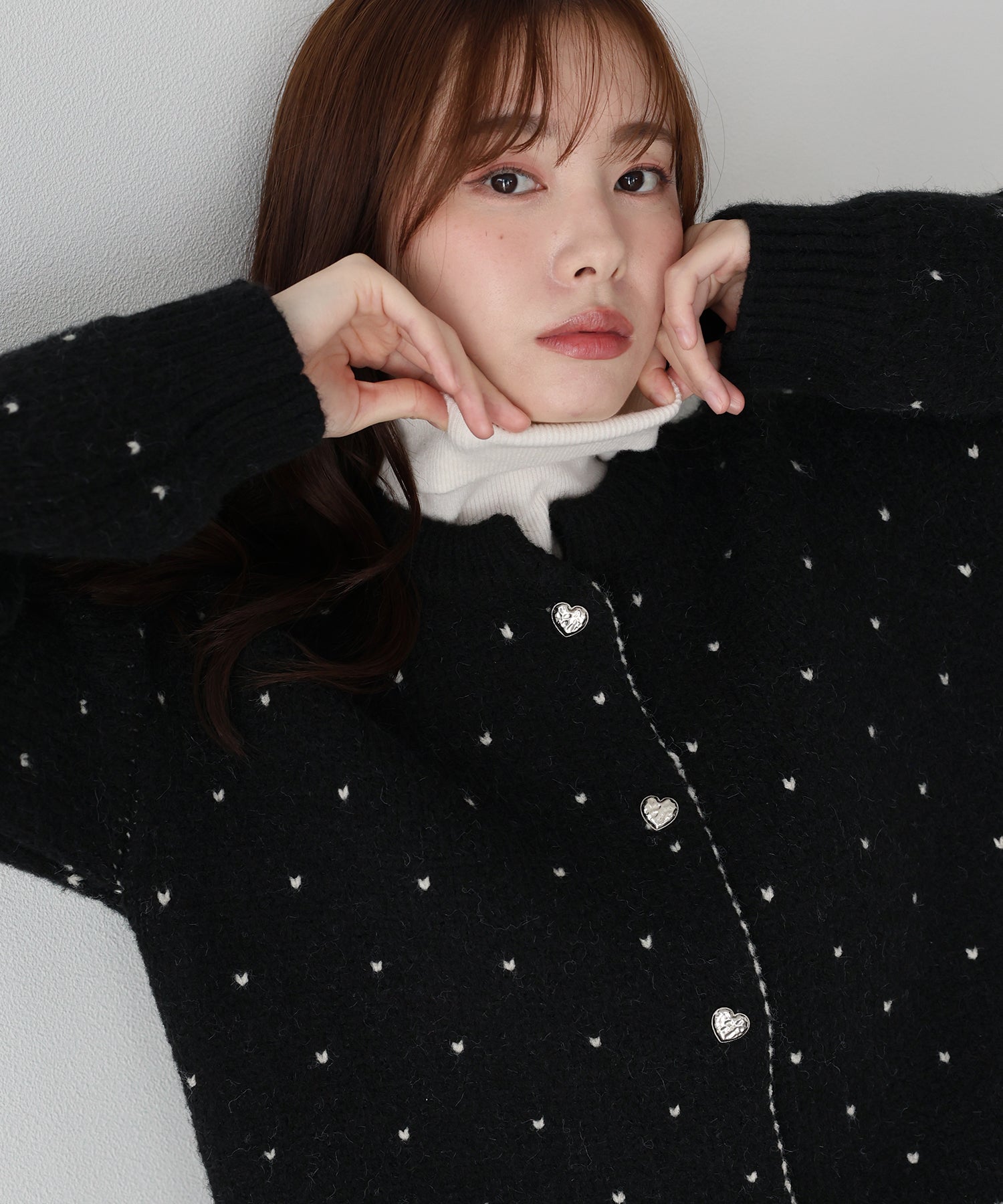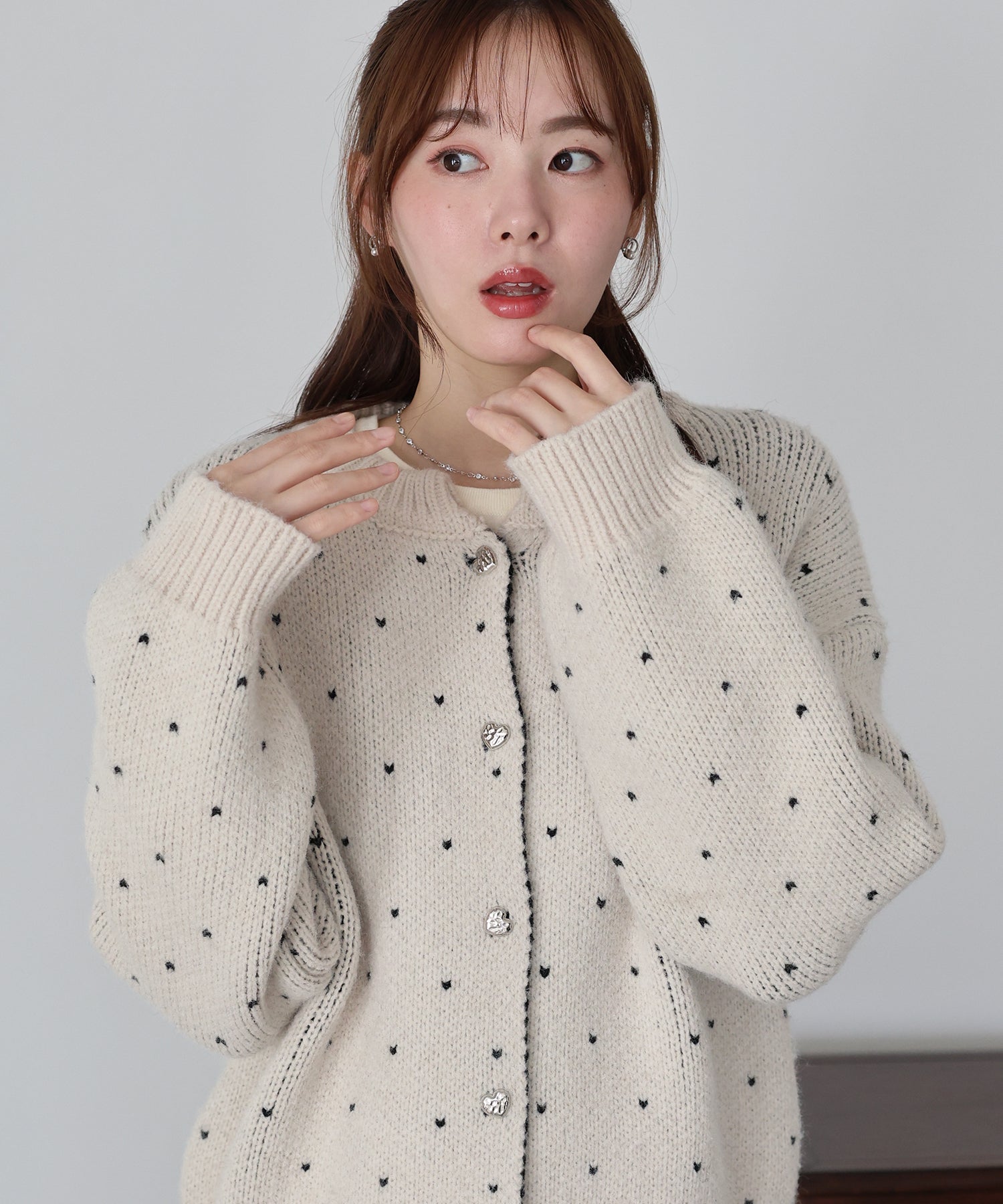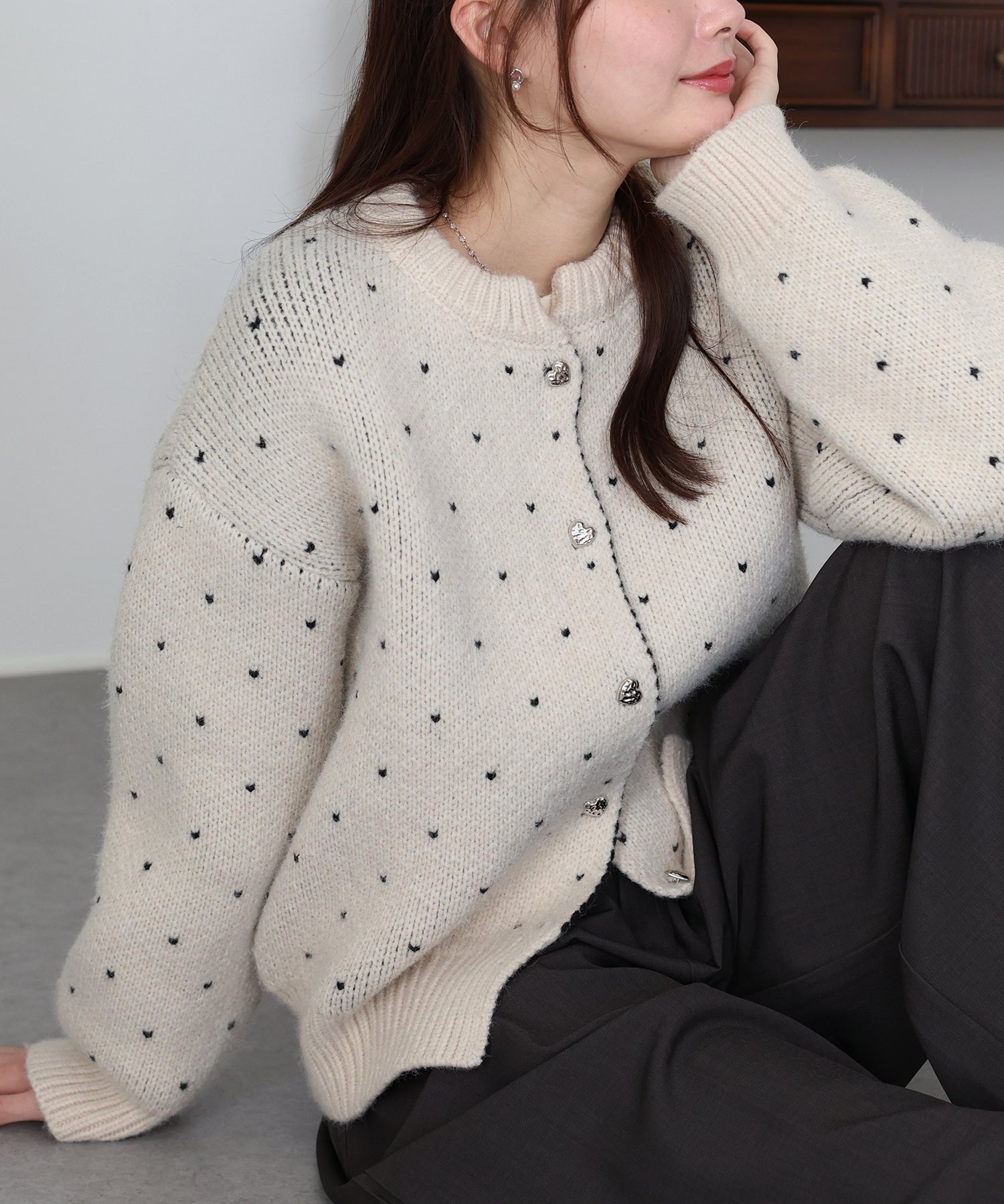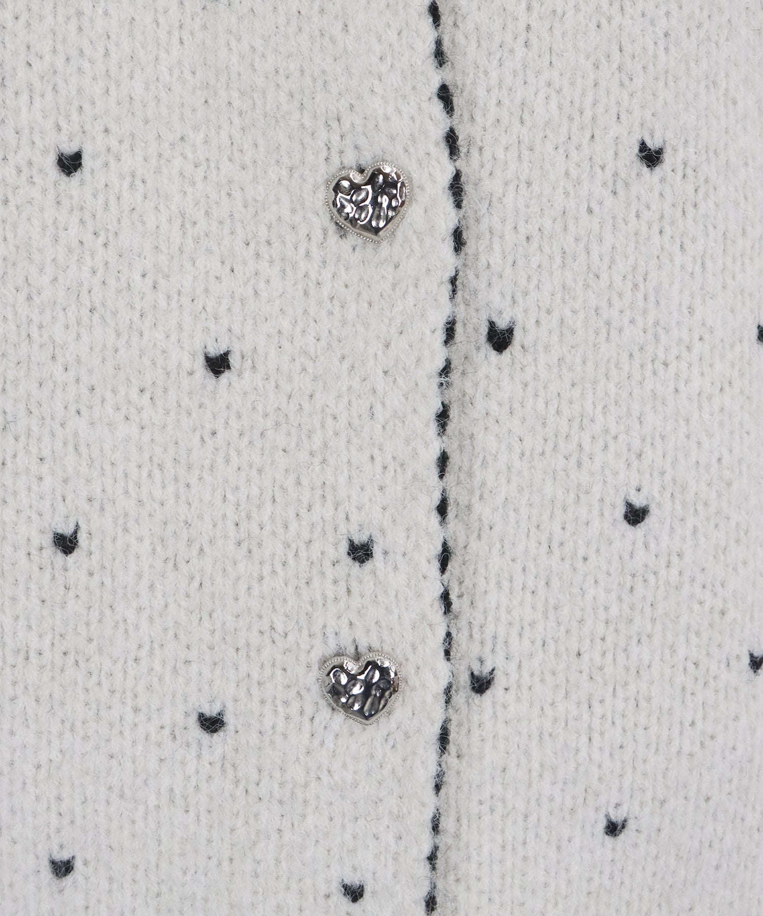 ドットのようなハート柄編みが目を惹く、シーズンムード高まるニットカーディガン。