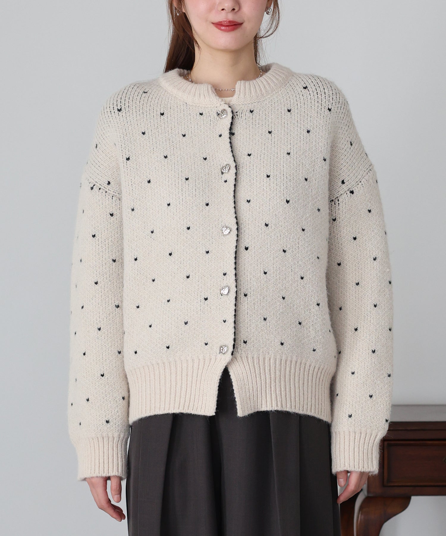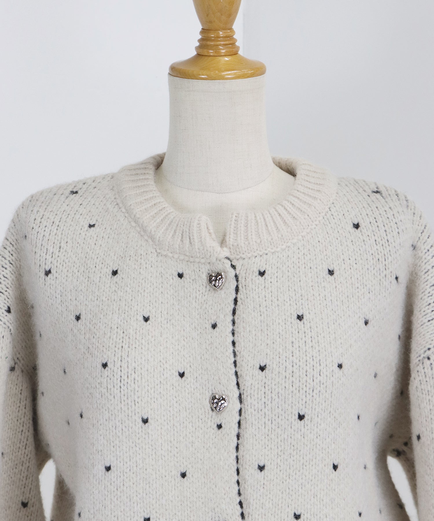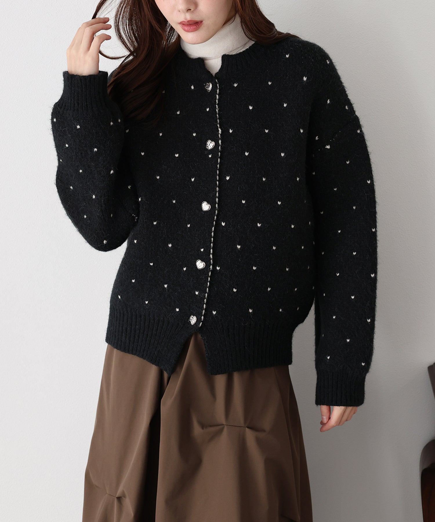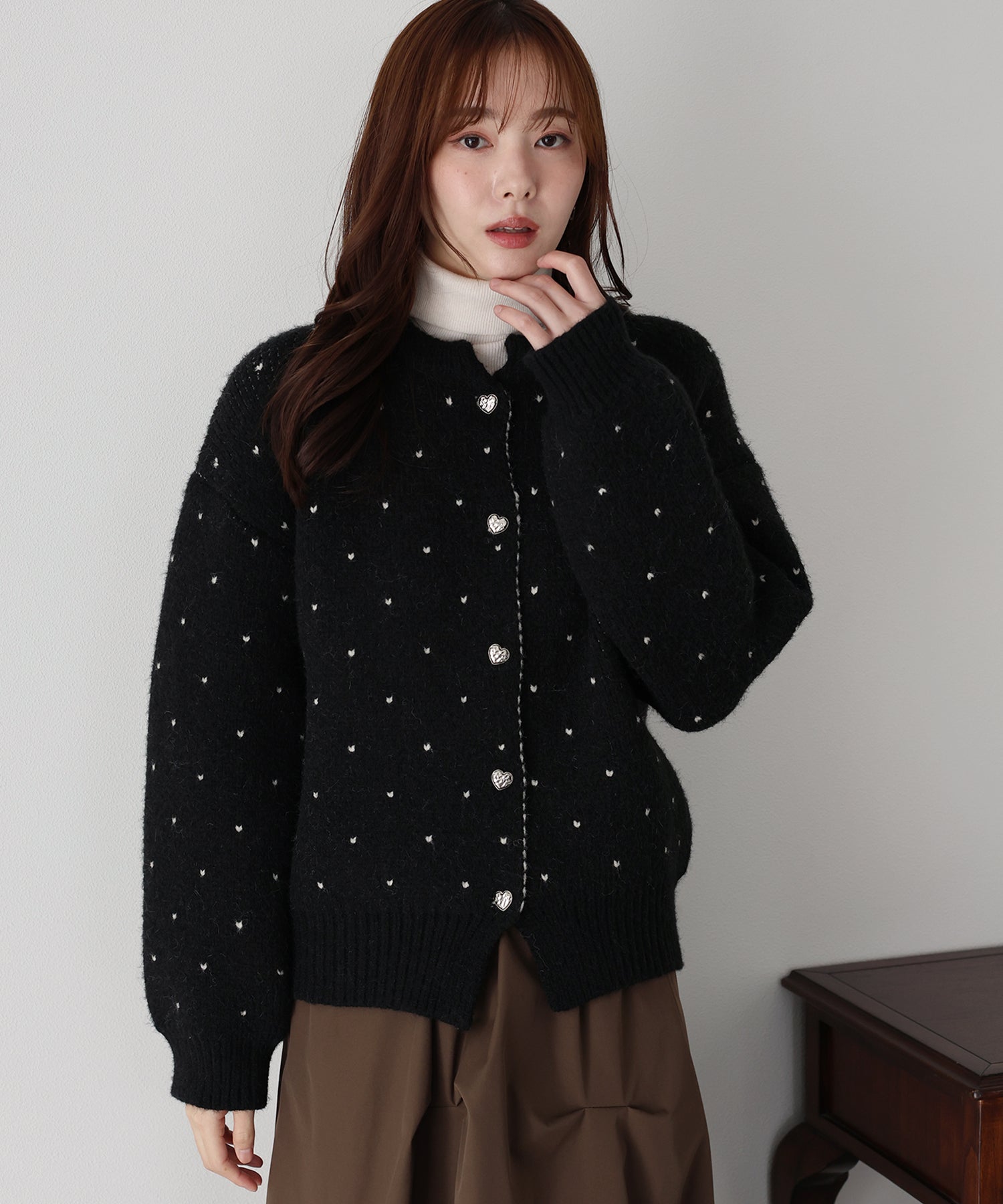 ドットのようなハート柄編みが目を惹く、シーズンムード高まるニットカーディガン。