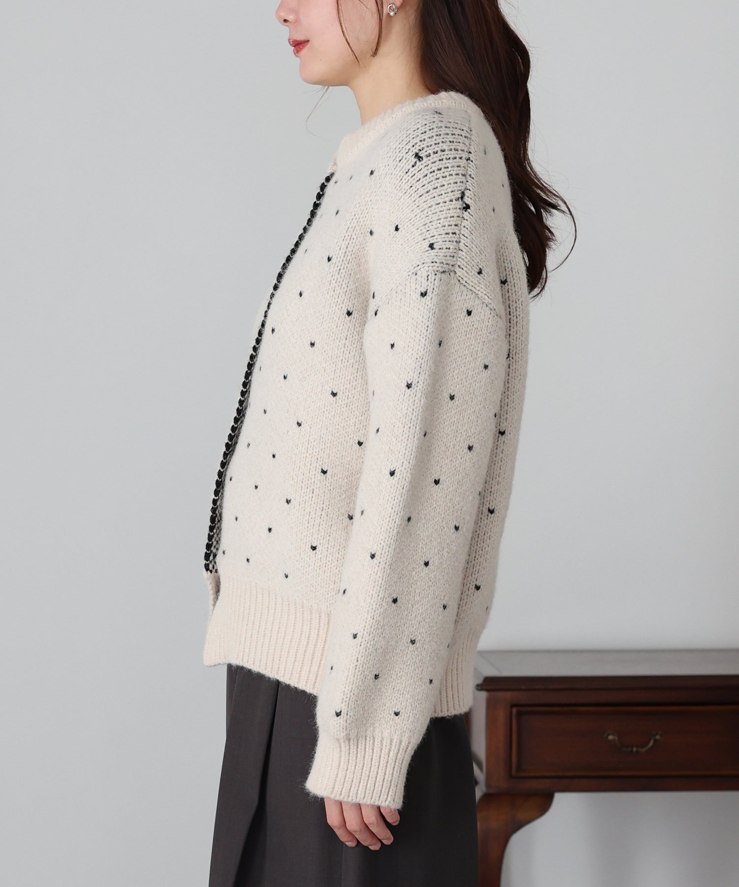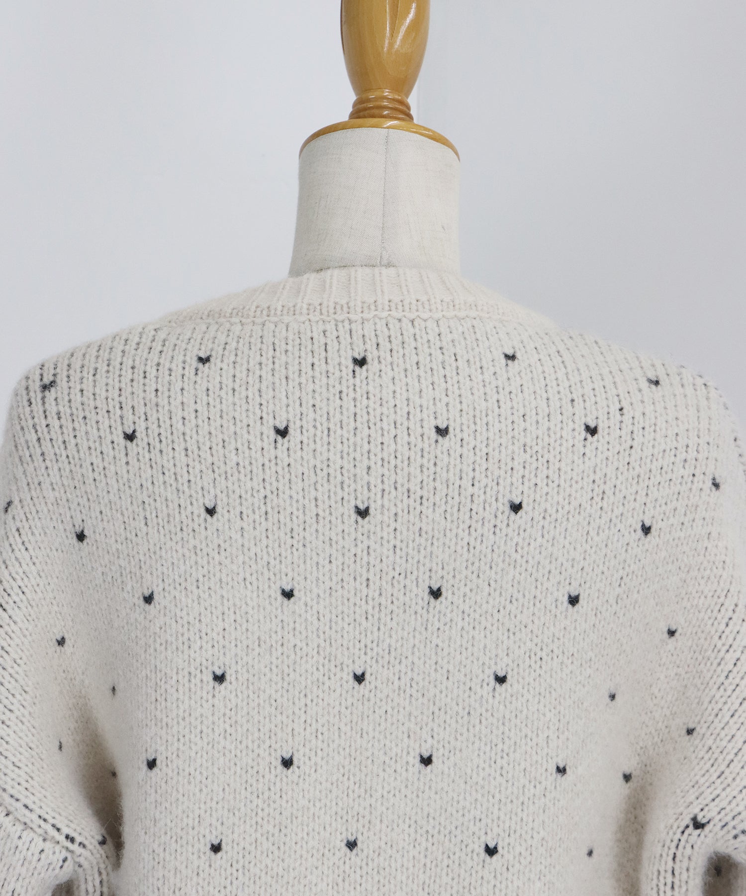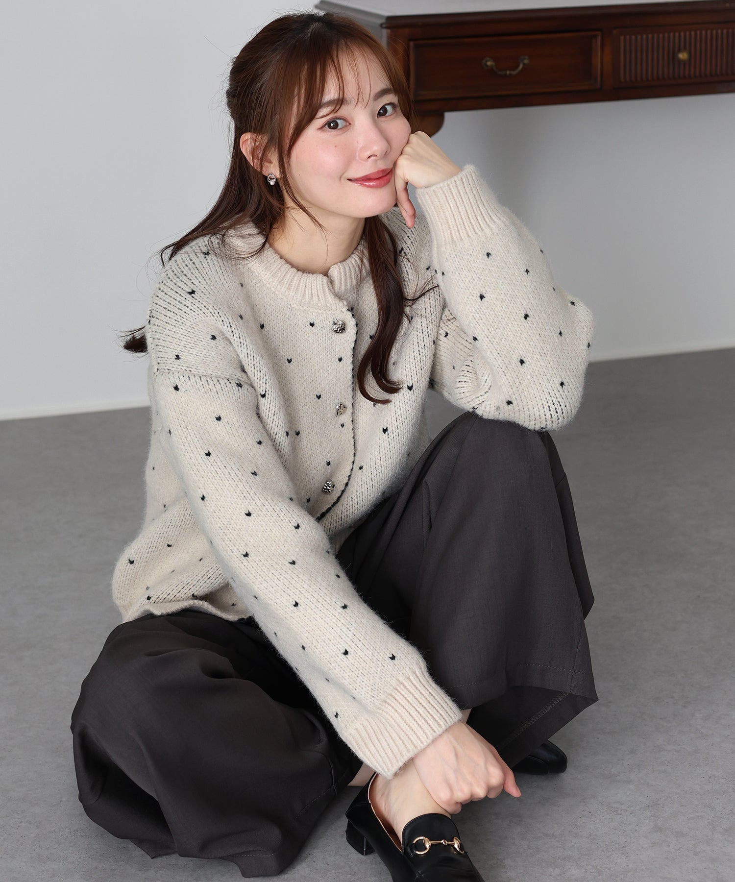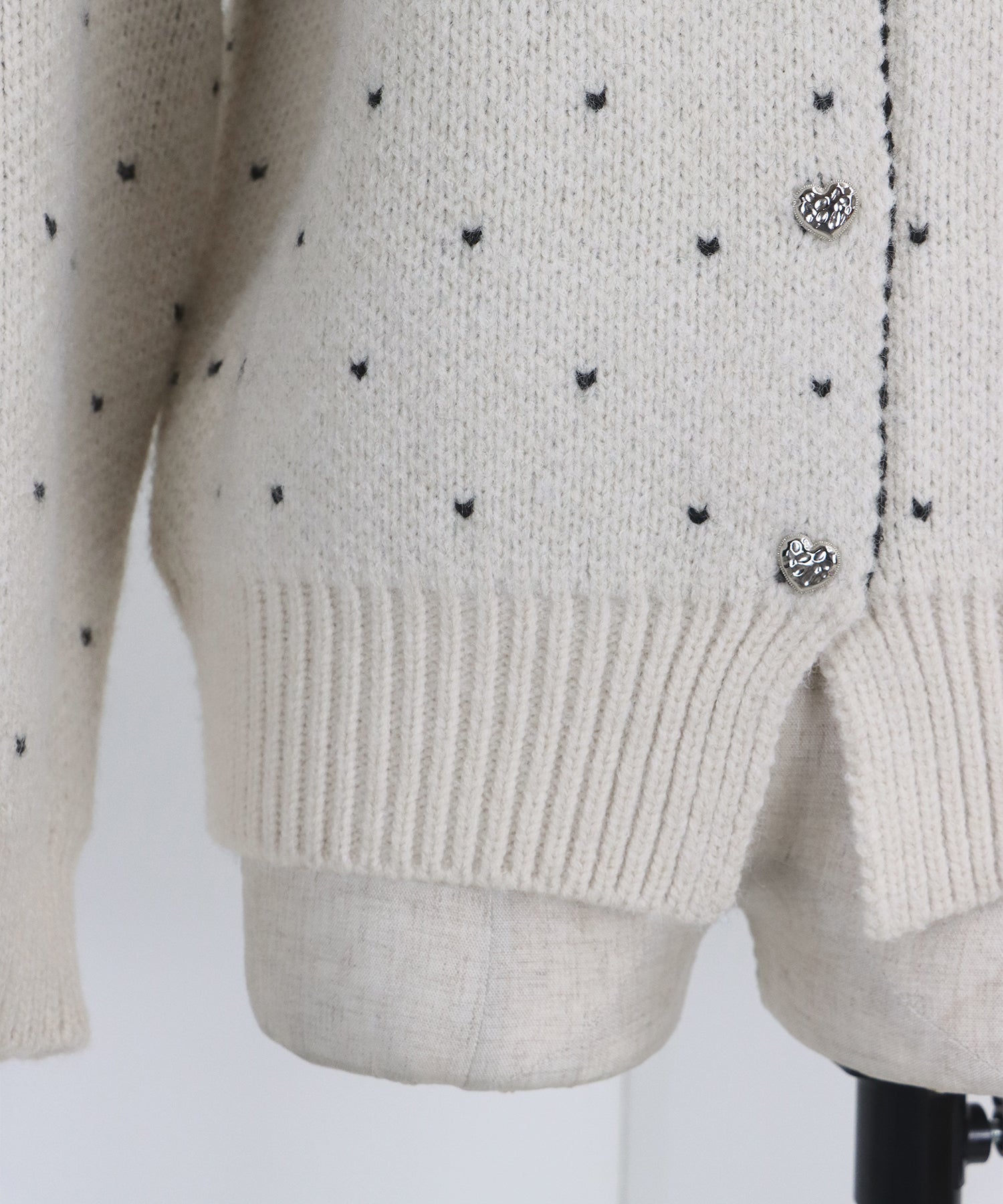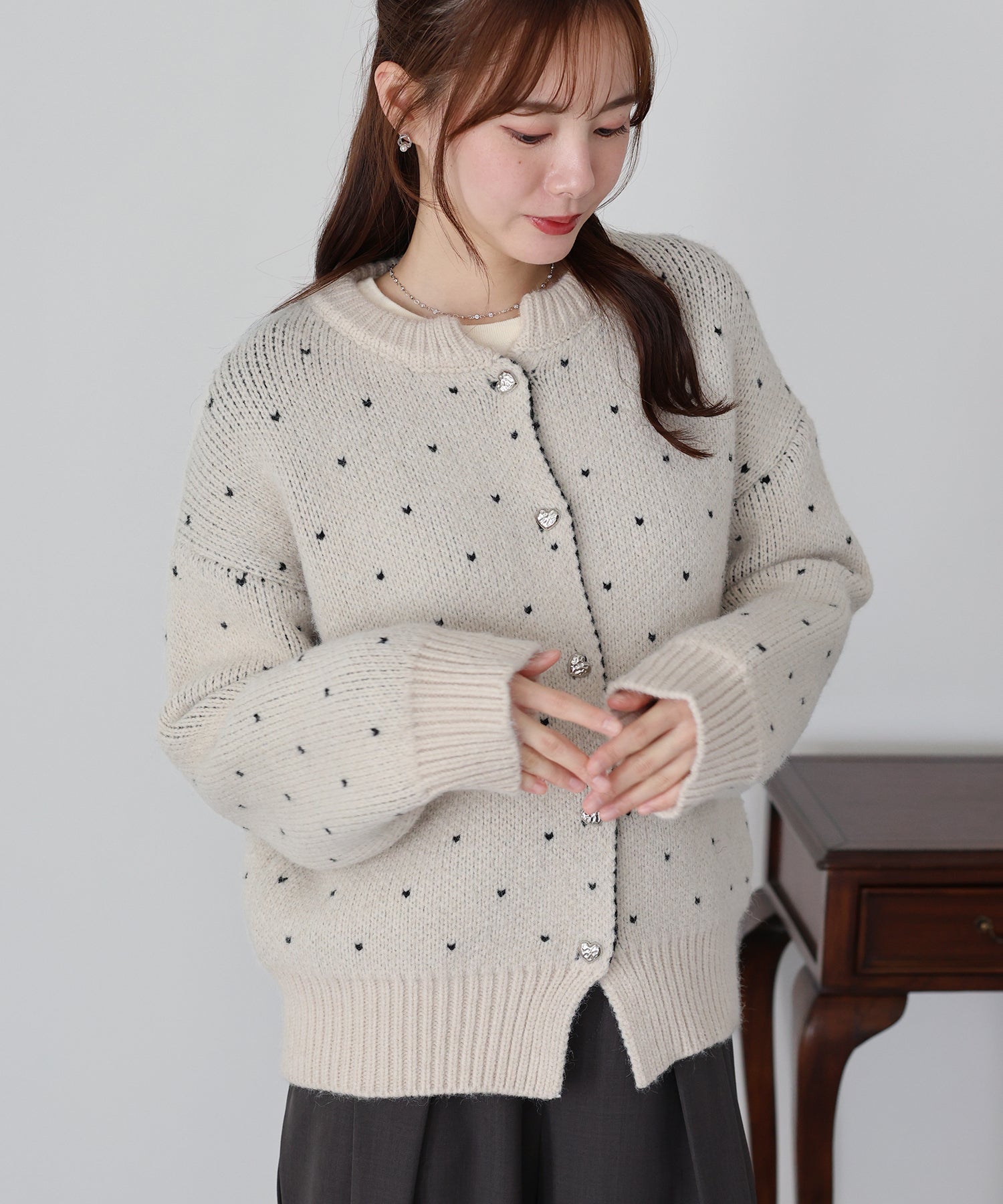 ドットのようなハート柄編みが目を惹く、シーズンムード高まるニットカーディガン。