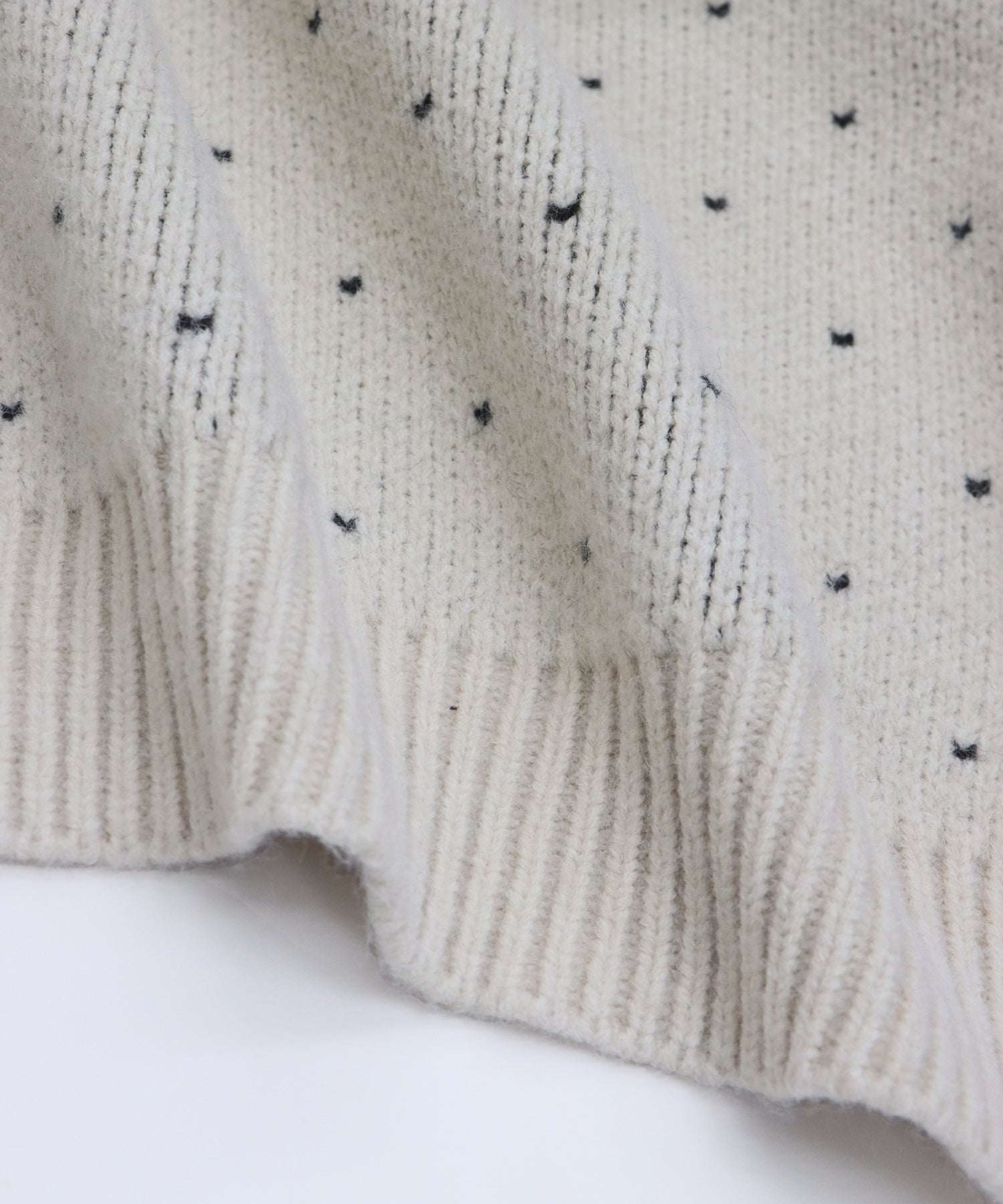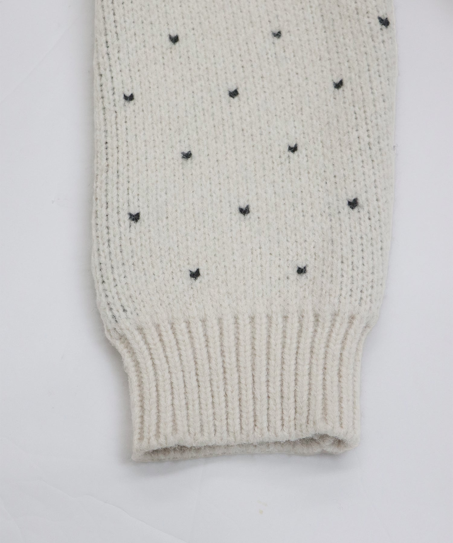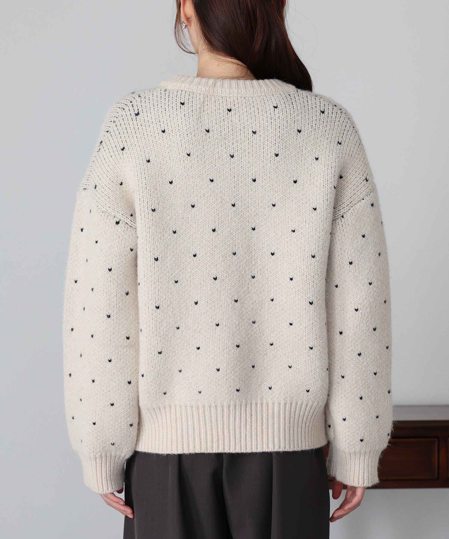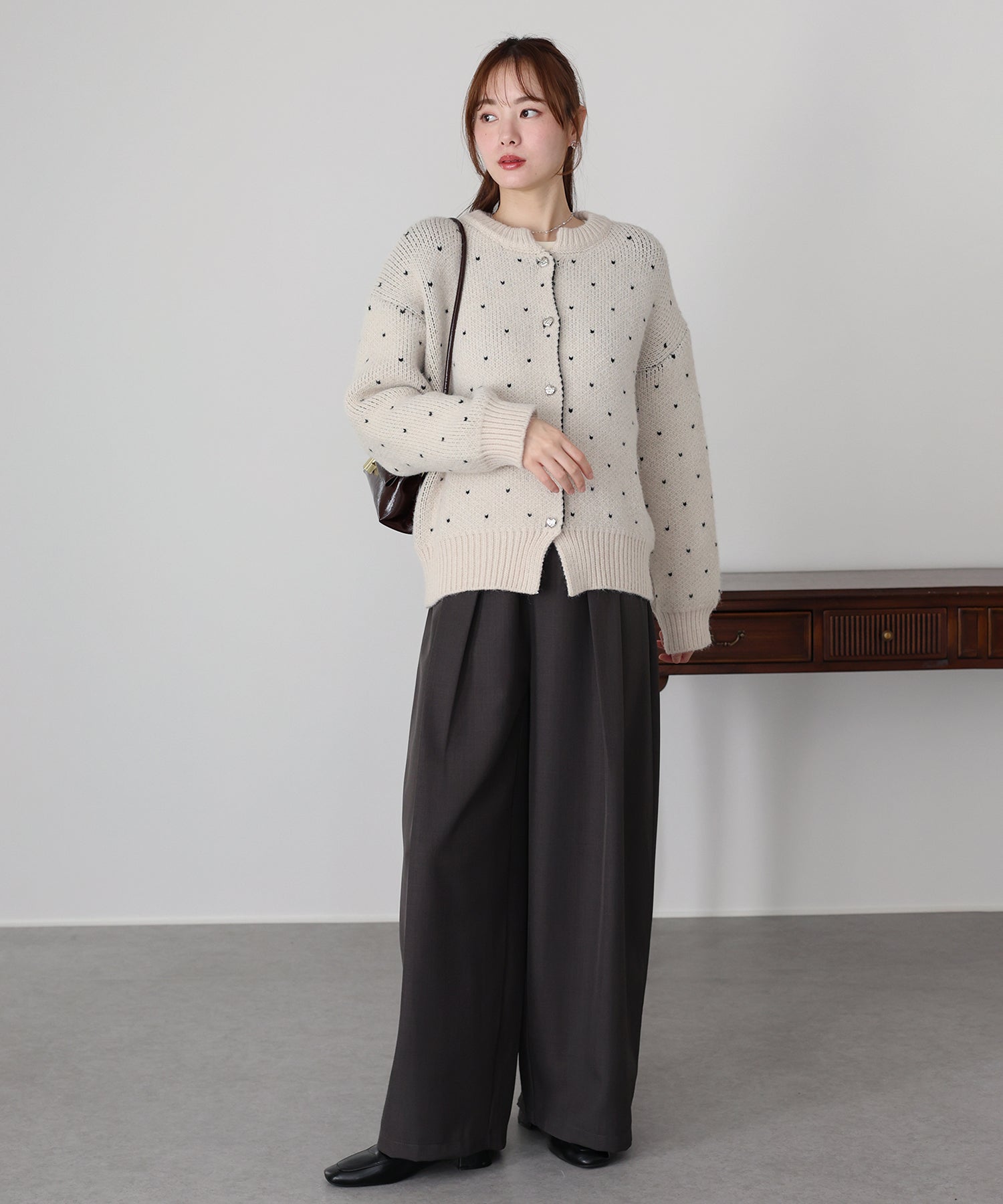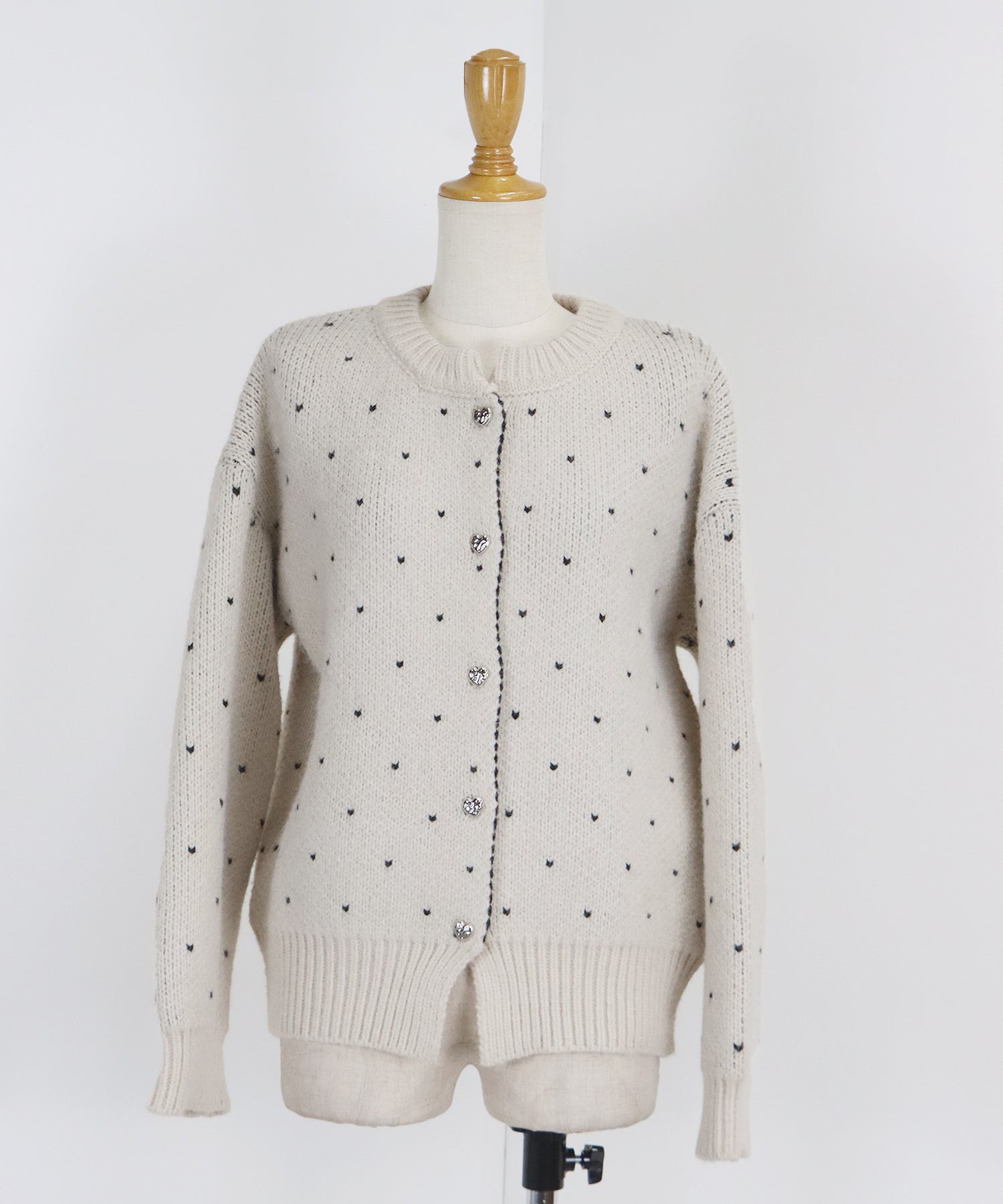 ドットのようなハート柄編みが目を惹く、シーズンムード高まるニットカーディガン。