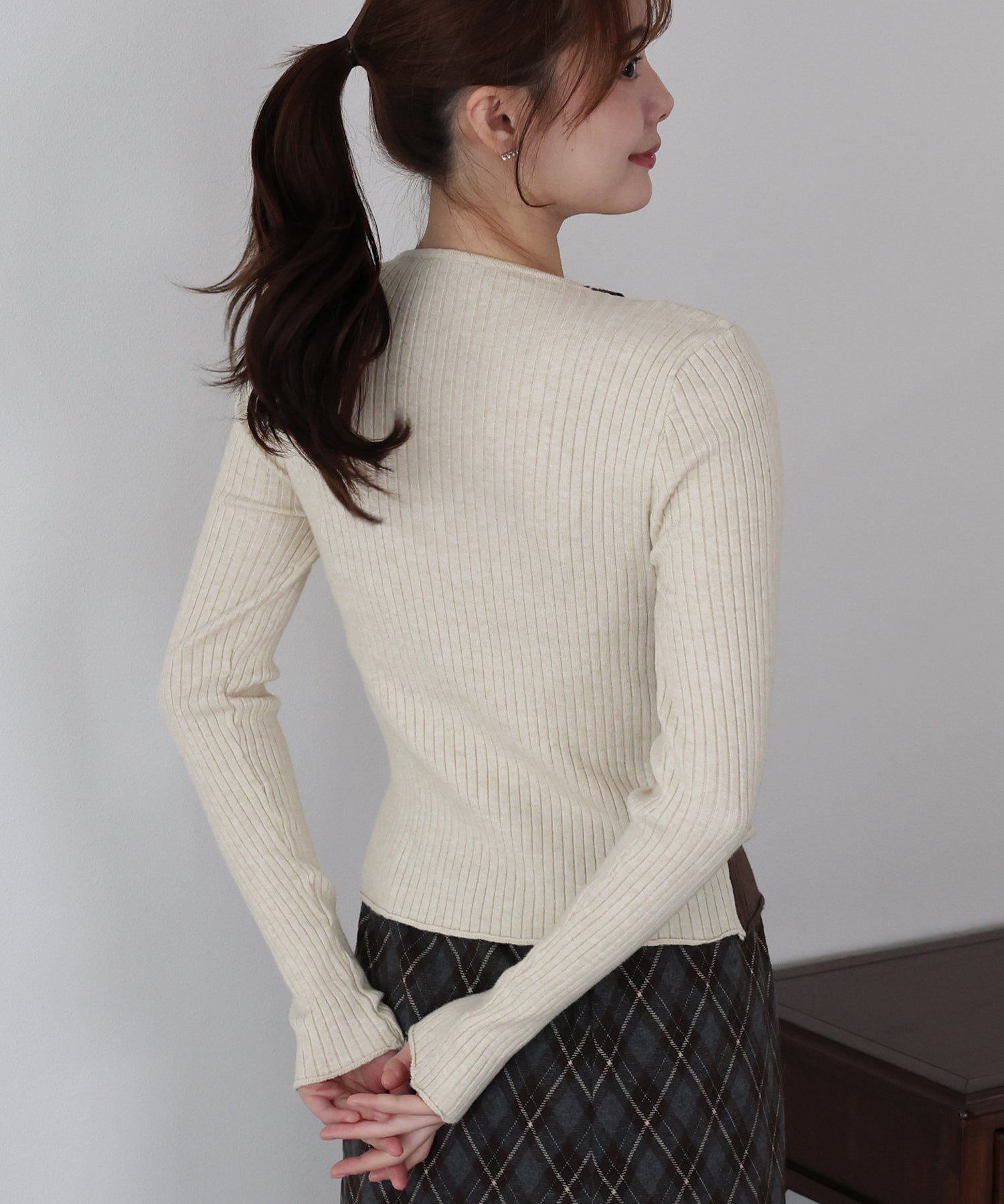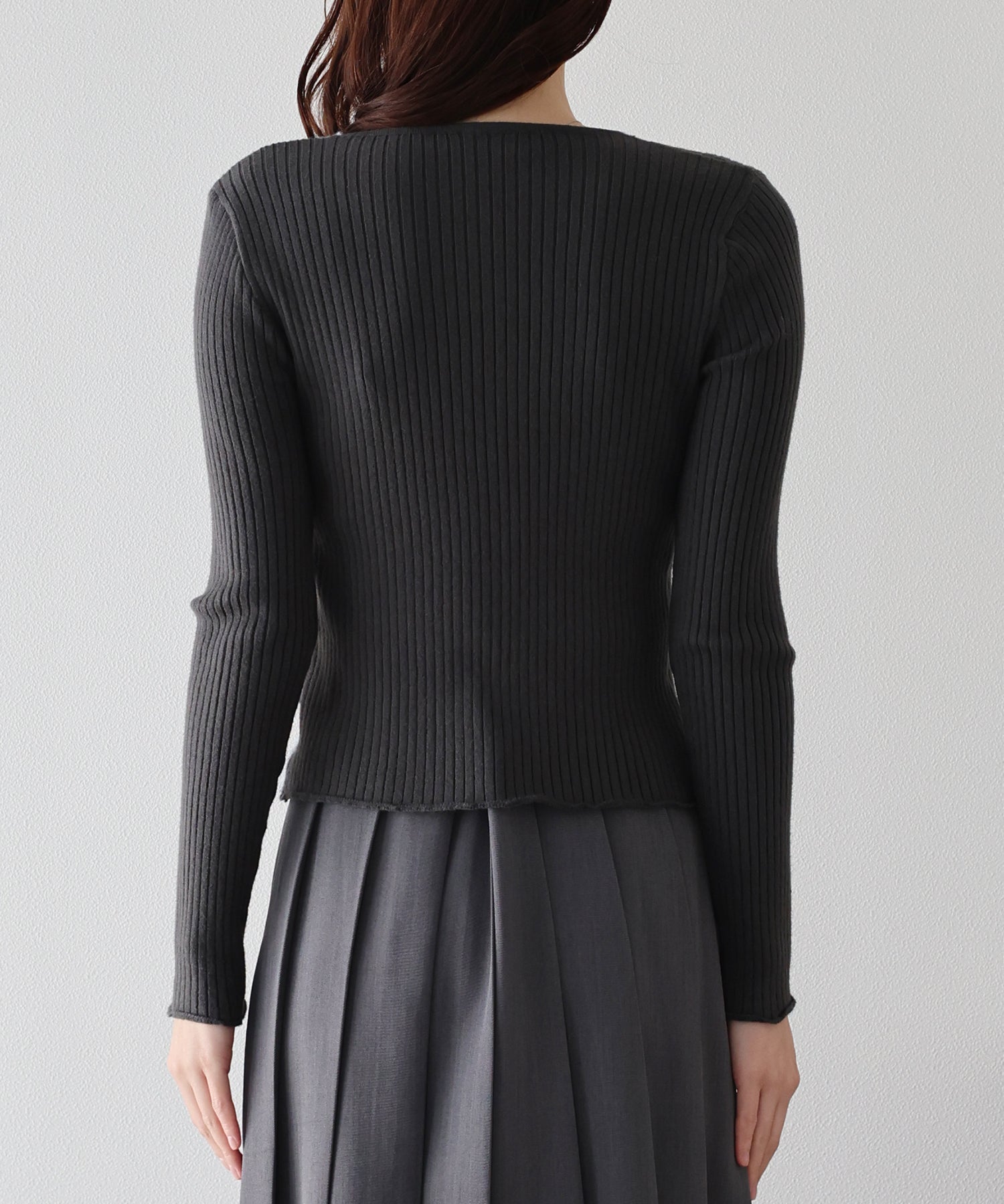 身体にフィットするシルエットと伸縮性のあるリブ編みで華奢見せ効果も期待できます。