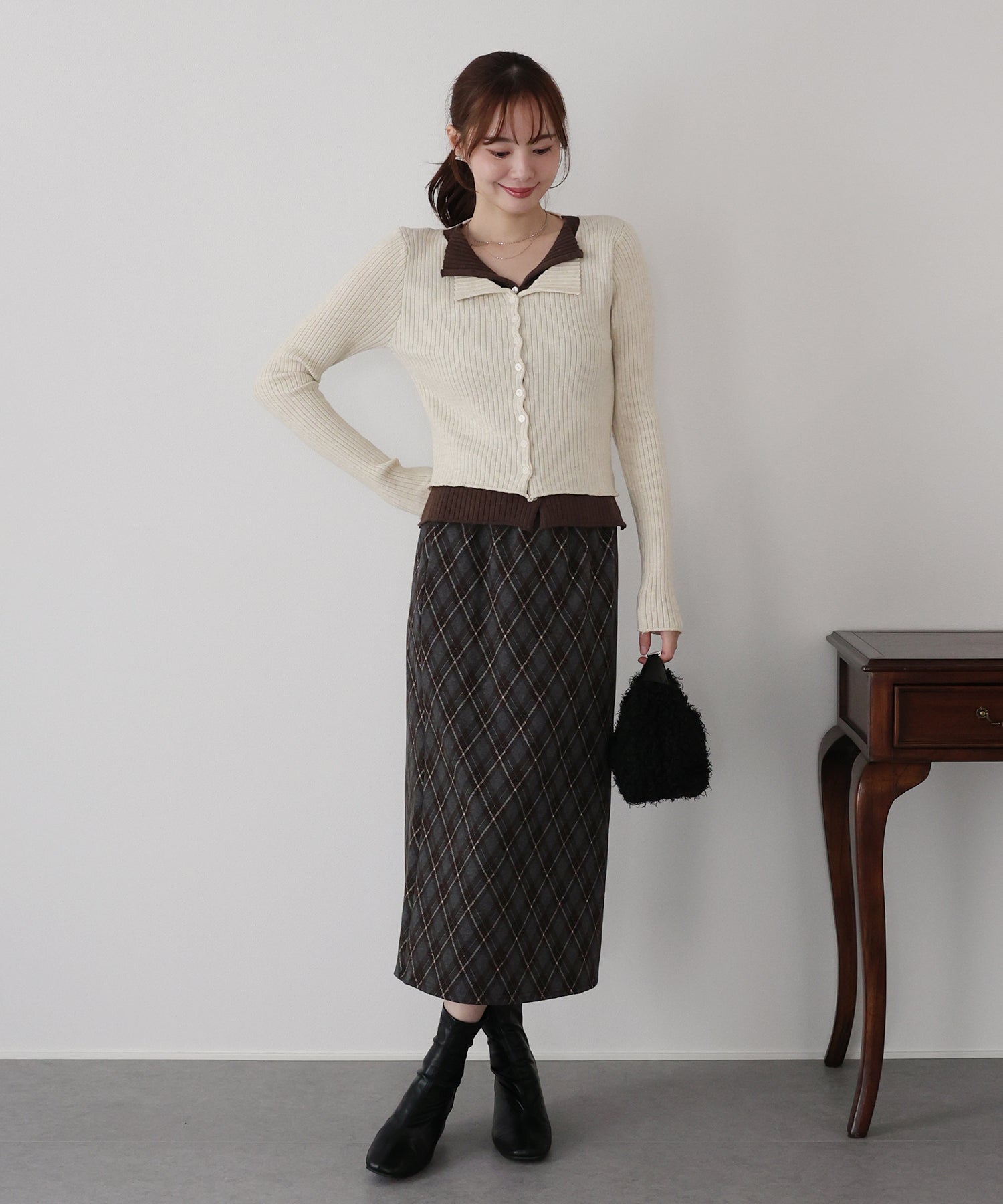 ネックと裾から見えるバイカラーのニットで、いつものボトムスに合わせるだけで旬なコーデに。