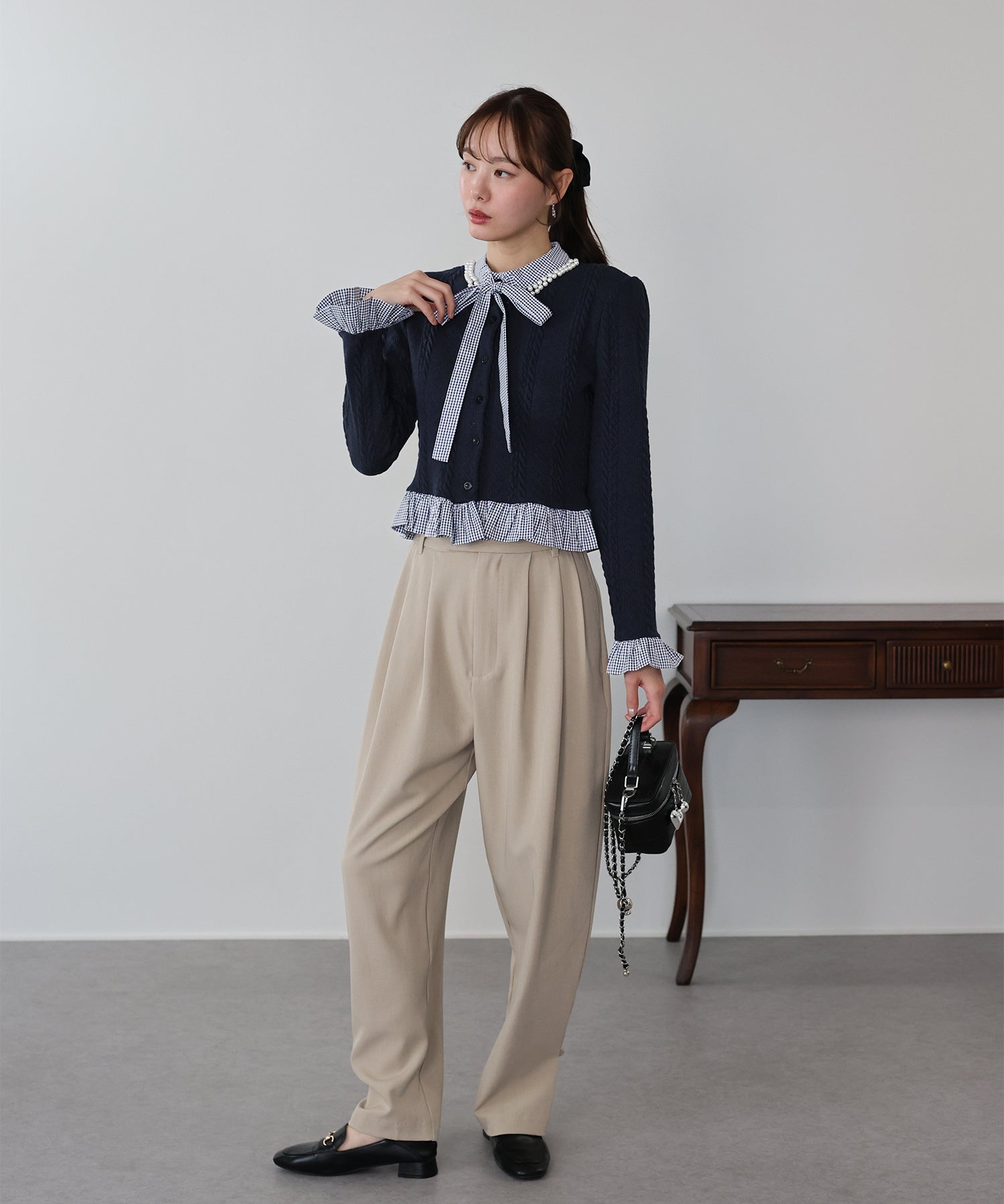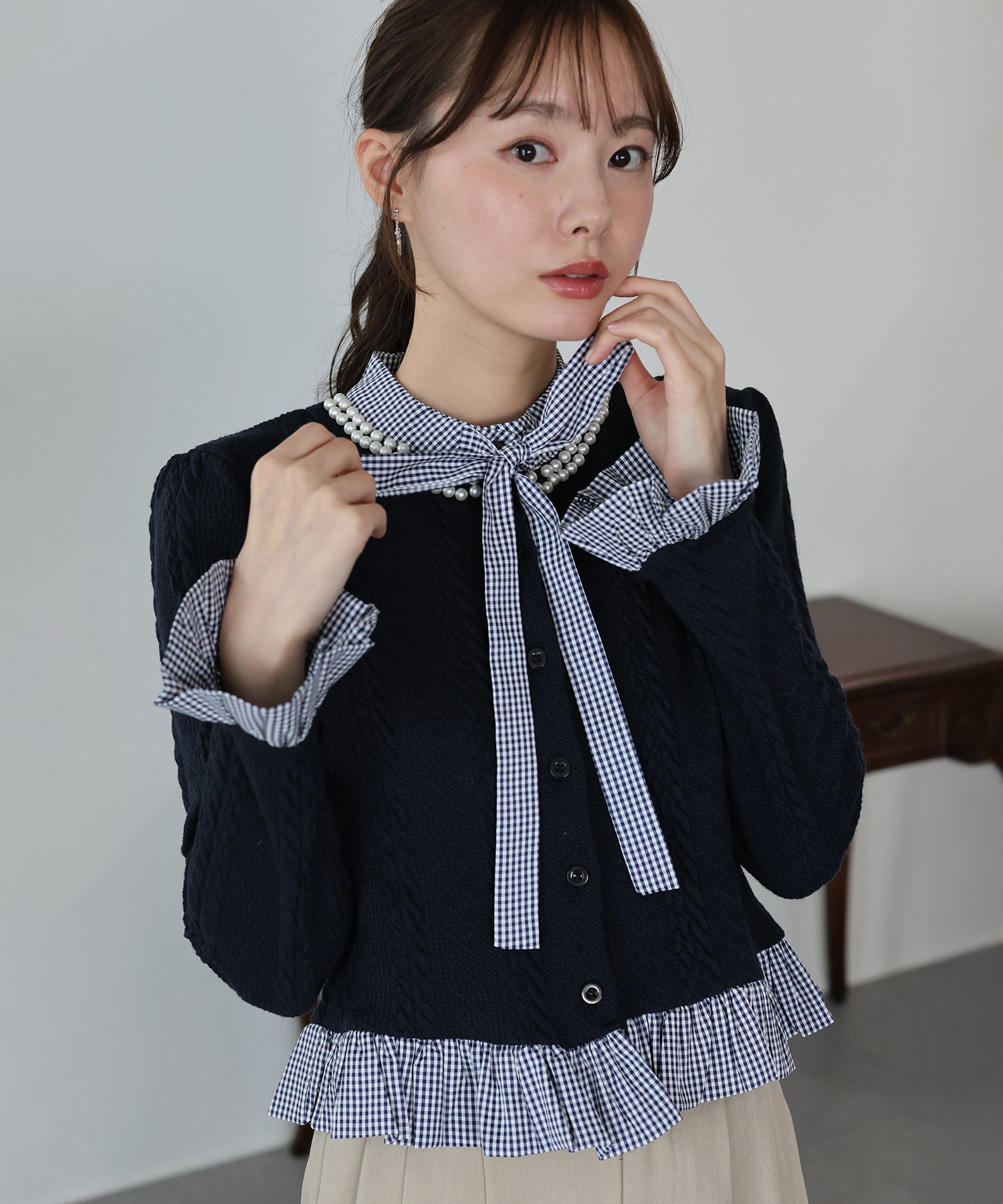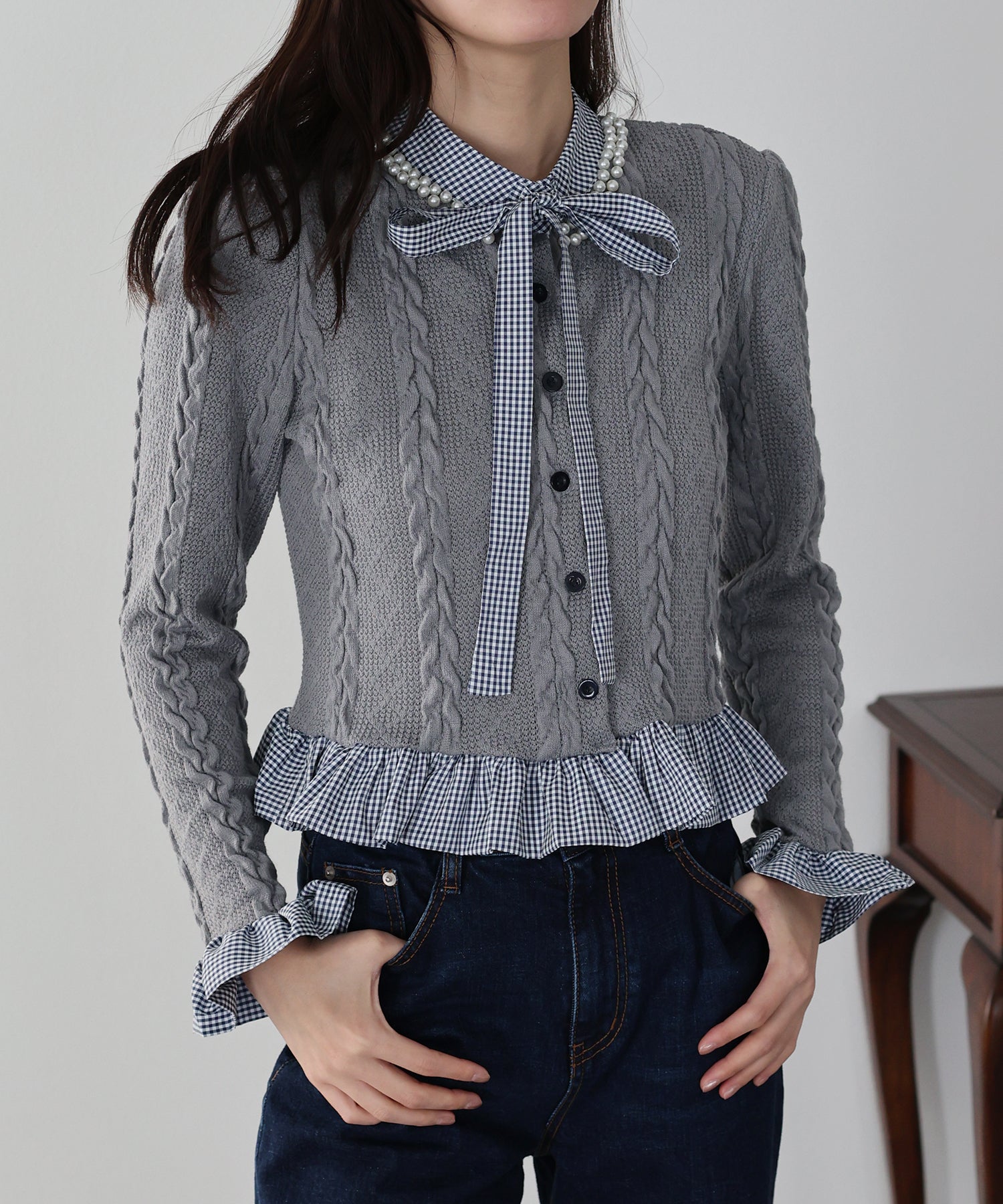 立体感のあるケーブル編みのカーディガンにギンガムチェックのシャツをドッキングしたトレンド感のあるトップス。
