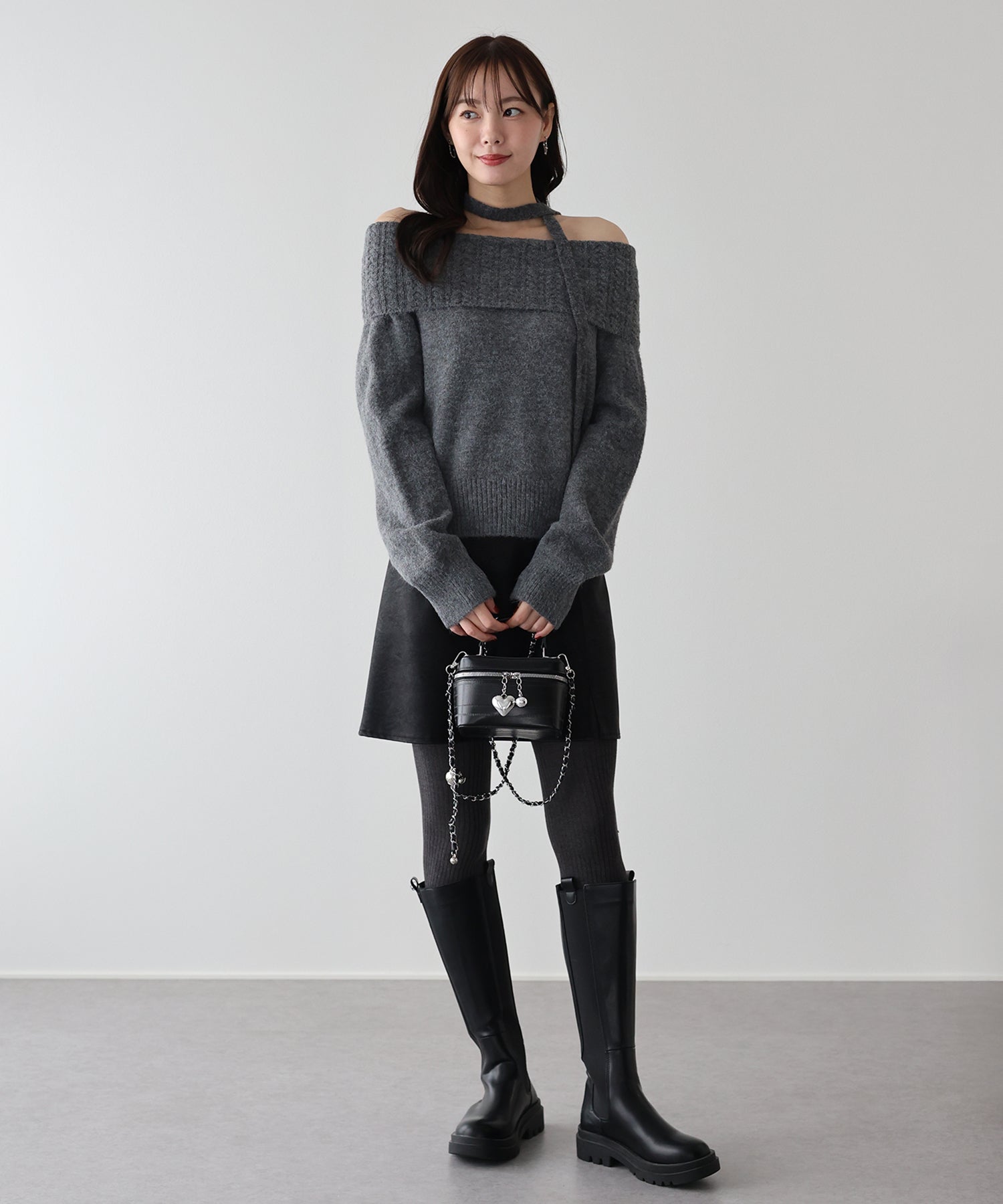 デコルテをきれいに見せるオフショルデザインのニットトップス。